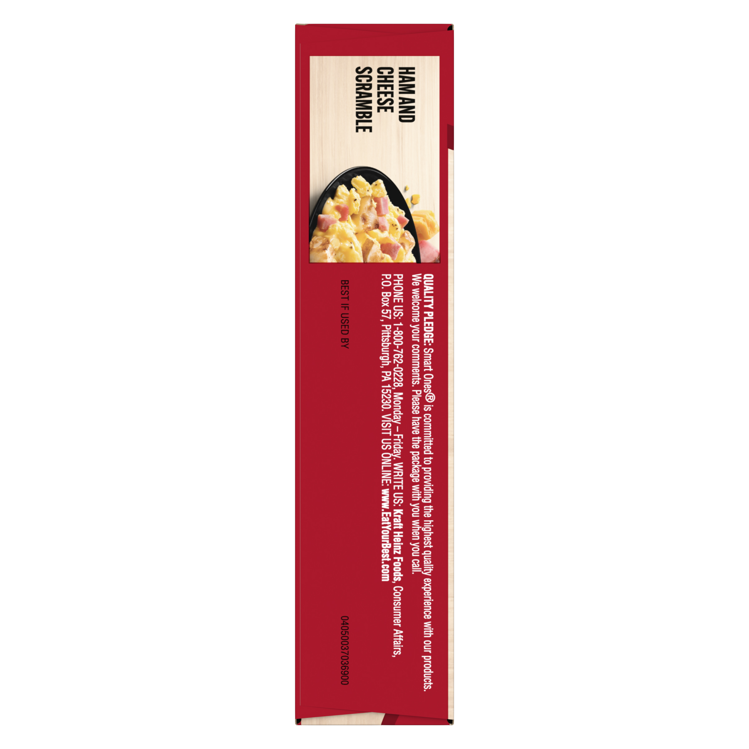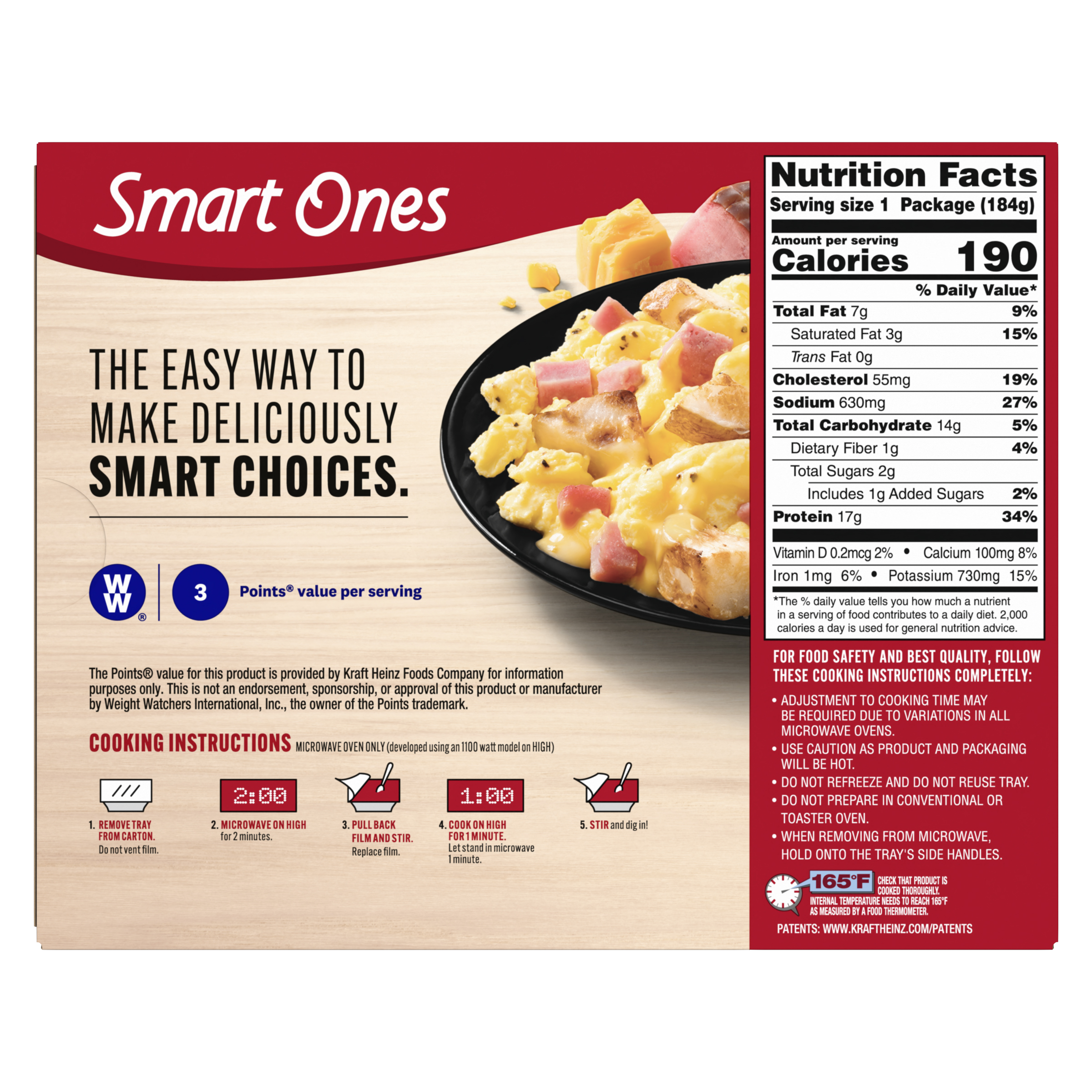 Product Description The easy way to make deliciously smart choices. Smart Ones Ham & Cheese Scramble delivers delicious flavors to start your day off right. Our frozen breakfast features fluffy scrambled eggs and ham on a bed of Ore-Ida Roasted Potatoes topped with cheese. Each meal contains 200 calories, 17 grams of protein and 4 WW Points® per serving. Our ham and cheese breakfast scramble is an excellent source of protein to support your lifestyle. Ideal for an easy breakfast or brunch, our convenient meal includes a microwave tray for effortless meal preparation. Cook as directed. Keep our frozen food in the freezer until ready to prepare and cook thoroughly.