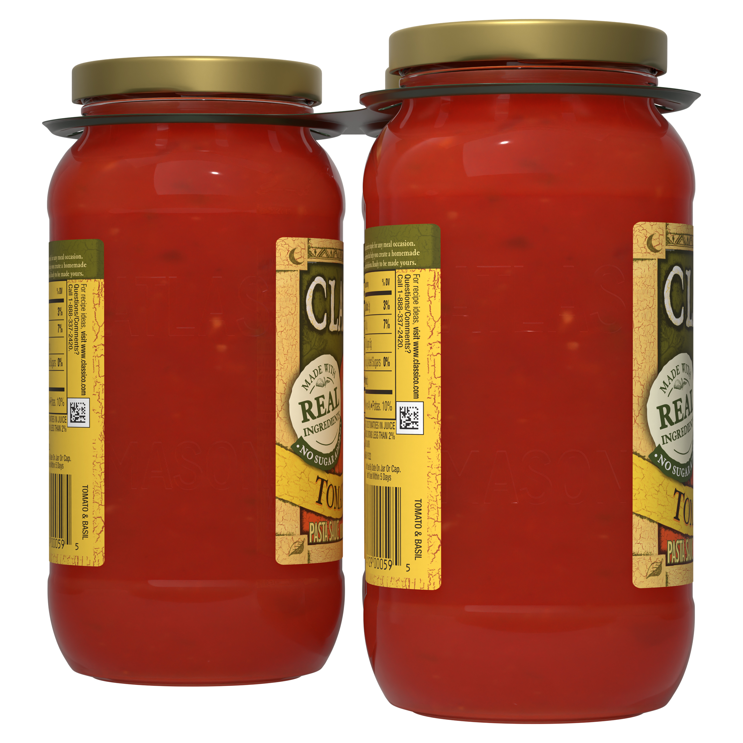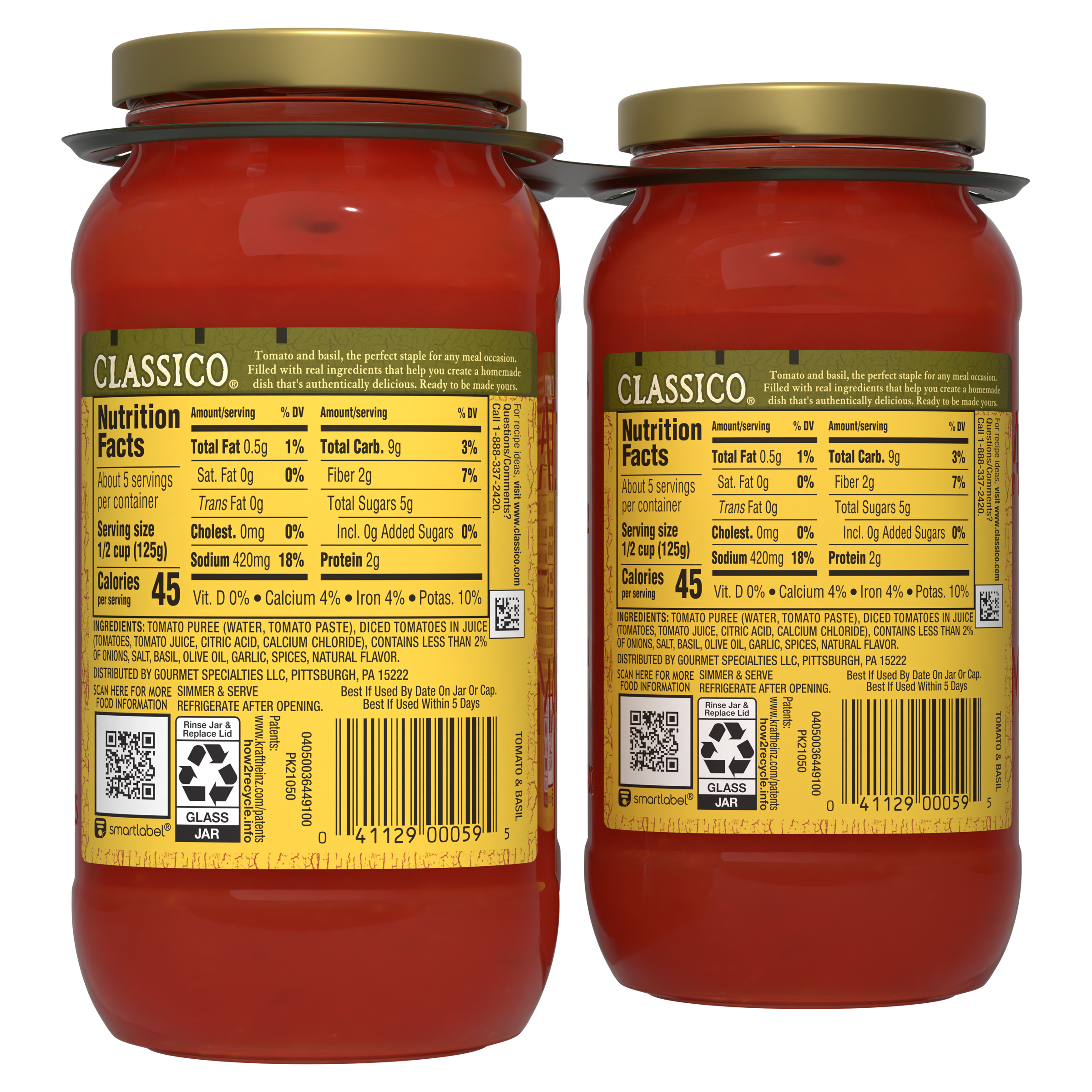 GTIN 00041129000595 Kraft Item Code (SKU) 00411290005970 Product Status Active Pack Level EACH Brand Name Classico Business Unit Elevation Catalog Platform Taste Elevation Product Category Pasta Sauce Consumer Unit Size 72 Consumer Unit Size UOM OZ Packaging Type (Computed) Pack Packaging Type Code SHRINK WRAPPED Sub Units Per Item 1 Variant Tomato & Basil Global Product Classification Code 10000057 Computed Exports - Ingredients TOMATO PUREE (WATER, TOMATO PASTE), DICED TOMATOES IN JUICE (TOMATOES, TOMATO JUICE, CITRIC ACID, CALCIUM CHLORIDE), CONTAINS LESS THAN 2% OF ONIONS, SALT, BASIL, OLIVE OIL, GARLIC, SPICES, NATURAL FLAVOR. Parent Reference 10041129000592 Quality Statement Best If Used By Date On Jar Or Cap | Best If Used Within 5 Days Storage Instructions Refrigerate After Opening | Store in Refrigerator after Opening Customer Guarantee 180 Temperature Classification Code 01 Net Weight 4.5 Gross Weight 6.755 Weight UOM LB Height (in) 6.813 Length/Depth (in) 9.552 Width (in) 3.184 Case Cube 0.12 Parent Relation CASE_10041129000592 Parent Kraft Item Code (SKU) 00411290005900 Product Title Classico Tomato & Basil Pasta Sauce, 3 ct Pack, 24 oz Jars eCommerce Product Name (Generic Name) Tomato & Basil Pasta Sauce Product Description Classico Tomato & Basil Pasta Sauce, 3 ct Pack, 24 oz Jars