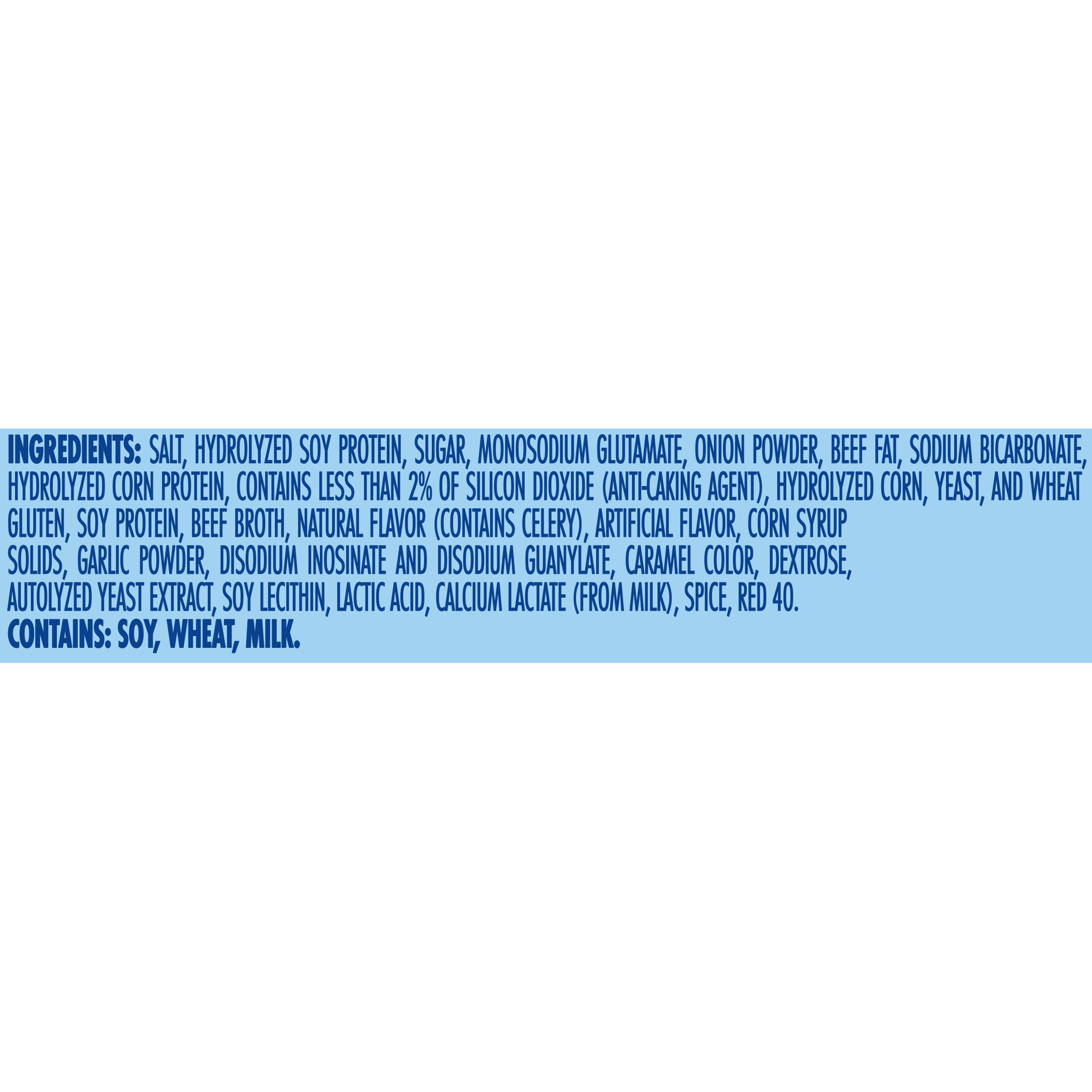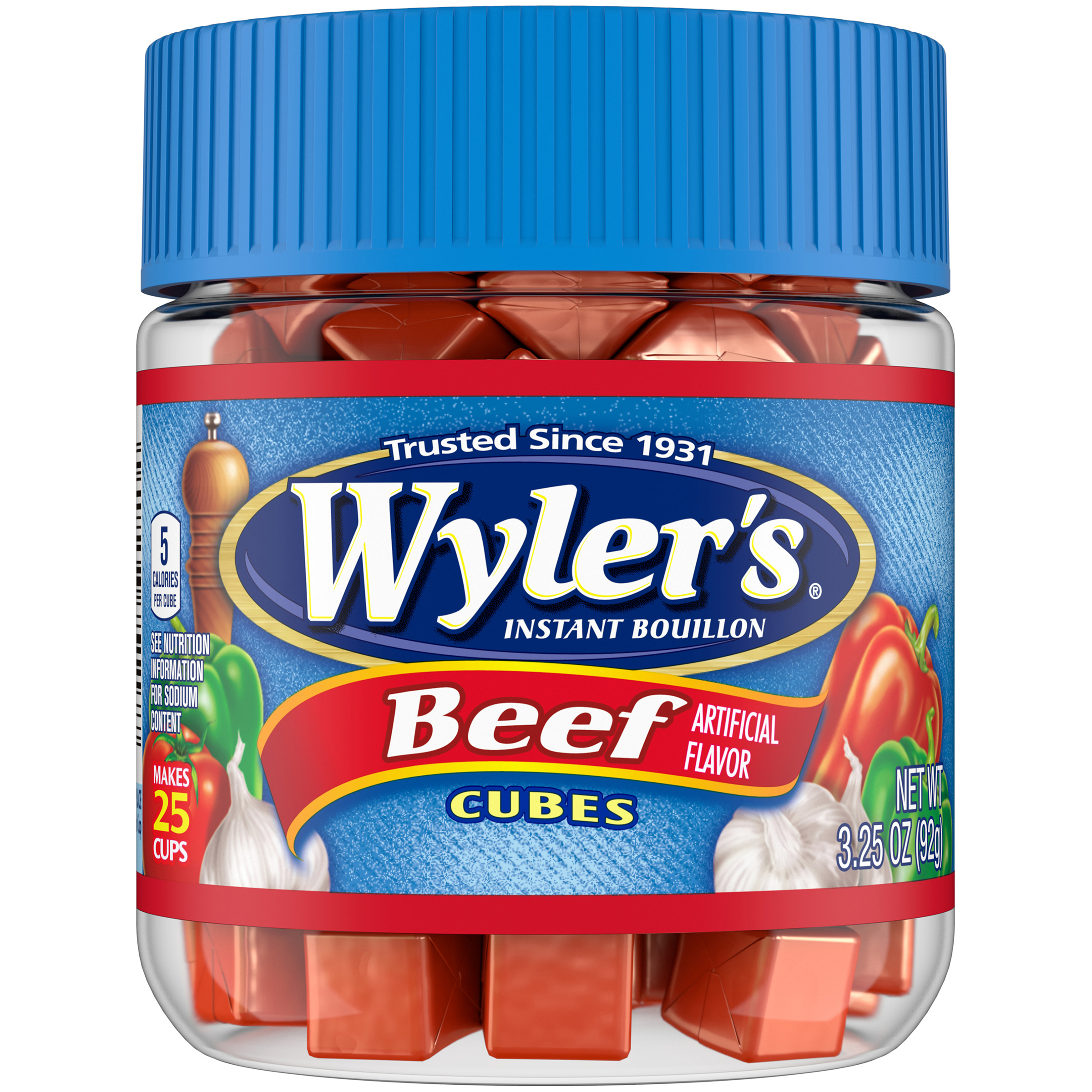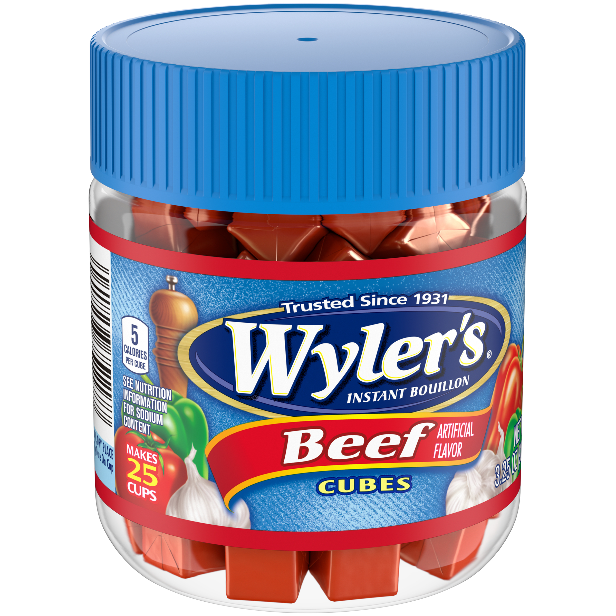 GTIN 00041258751177 Kraft Item Code (SKU) 00412587511770 Product Status Active Pack Level EACH Brand Name Wylers Sub Brand INSTANT BOUILLON Business Unit Elevation Catalog Platform Taste Elevation Product Category All Other Condiments and Sauces Consumer Unit Size 3.25 Consumer Unit Size UOM OZ Packaging Type (Computed) Jar Packaging Type Code JAR Packaging Type Code Override (Manual) JAR Sub Units Per Item 1 Variant Beef Global Product Classification Soups - Prepared (Shelf Stable) Global Product Classification Code 10000262 Computed Exports - Ingredients SALT, HYDROLYZED SOY PROTEIN, SUGAR, MONOSODIUM GLUTAMATE, ONION POWDER, BEEF FAT, SODIUM BICARBONATE, HYDROLYZED CORN PROTEIN, CONTAINS LESS THAN 2% OF SILICON DIOXIDE (ANTI-CAKING AGENT), HYDROLYZED CORN, YEAST, AND WHEAT GLUTEN, SOY PROTEIN, BEEF BROTH, NATURAL FLAVOR (CONTAINS CELERY), ARTIFICIAL FLAVOR, CORN SYRUP SOLIDS, GARLIC POWDER, DISODIUM INOSINATE AND DISODIUM GUANYLATE, CARAMEL COLOR, DEXTROSE, AUTOLYZED YEAST EXTRACT, SOY LECITHIN, LACTIC ACID, CALCIUM LACTATE (FROM MILK), SPICE, RED 40. Parent Reference 00041258081007 Customer Guarantee 180 Temperature Classification Ambient Prevailing Conditions Temperature Classification Code 01 Net Weight 0.203 Gross Weight 0.62 Weight UOM LB Height (in) 3.267 Length/Depth (in) 2.656 Width (in) 2.656 Case Cube 0.013 Parent Relation CASE_00041258081007 Parent Kraft Item Code (SKU) 00412580810000 Product Title Wyler's Instant Bouillon Beef Flavored Cubes, 3.25 oz Jar eCommerce Product Name (Generic Name) Beef Flavored Cubes Product Benefits (Includes Seasonal + Formatting) - One 3.25 oz jar of Wyler's Instant Bouillon Beef Flavored Cubes