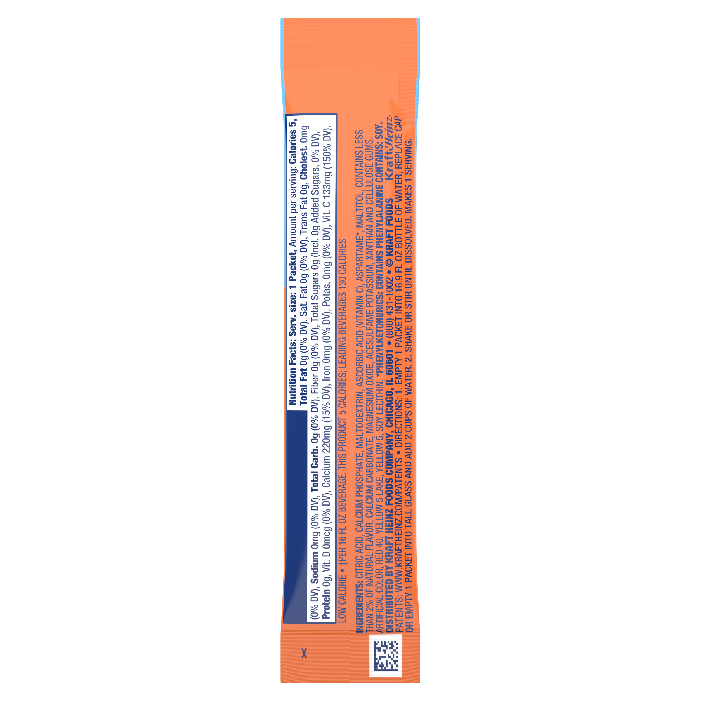 GTIN 00043000005286 Kraft Item Code (SKU) 00430000052870 Product Status Active Pack Level EACH Brand Name Crystal Light Business Unit Hydration Desserts & Meals Catalog Platform Hydration Product Category Total Powdered Beverages Consumer Unit Size 0.13 Consumer Unit Size UOM OZ Packaging Type (Computed) Pack Packaging Type Code WRAPPER Sub Units Per Item 1 Variant Classic Orange Global Product Classification Drinks Flavoured - Not Ready to Drink Global Product Classification Code 10000202 Computed Exports - Ingredients CITRIC ACID, CALCIUM PHOSPHATE, MALTODEXTRIN, ASCORBIC ACID (VITAMIN C), ASPARTAME*, MALTITOL, CONTAINS LESS THAN 2% OF NATURAL FLAVOR, CALCIUM CARBONATE, MAGNESIUM OXIDE, ACESULFAME POTASSIUM, XANTHAN AND CELLULOSE GUMS, SOY LECITHIN, ARTIFICIAL COLOR, YELLOW 5 LAKE, YELLOW 5, RED 40.* PHENYLKETONURICS: CONTAINS PHENYLALANINE. Parent Reference 00043000971826 Customer Guarantee 180 Temperature Classification Ambient Prevailing Conditions Temperature Classification Code 01 Net Weight 0.008 Gross Weight 0.009 Weight UOM LB Height (in) 4.25 Length/Depth (in) 0.125 Width (in) 0.95 Case Cube 0 Parent Relation PACK/INNER PACK_00043000971826 Parent Kraft Item Code (SKU) 00430009718270 Product Title Crystal Light Drink Mix, 1 Packet, for Convenient On-the-Go Flavorful Hydration, Classic Orange Natural Flavor, Zero Sugar, 0.13 oz eCommerce Product Name (Generic Name) On-The-Go Sugar Free Classic Orange Sunrise Drink Mix Product Benefits (Includes Seasonal + Formatting) - DRINK PACKETS: One 0.13-ounce packet of Crystal Light Classic Orange Natural Flavor On-the-Go Powdered Drink Mix