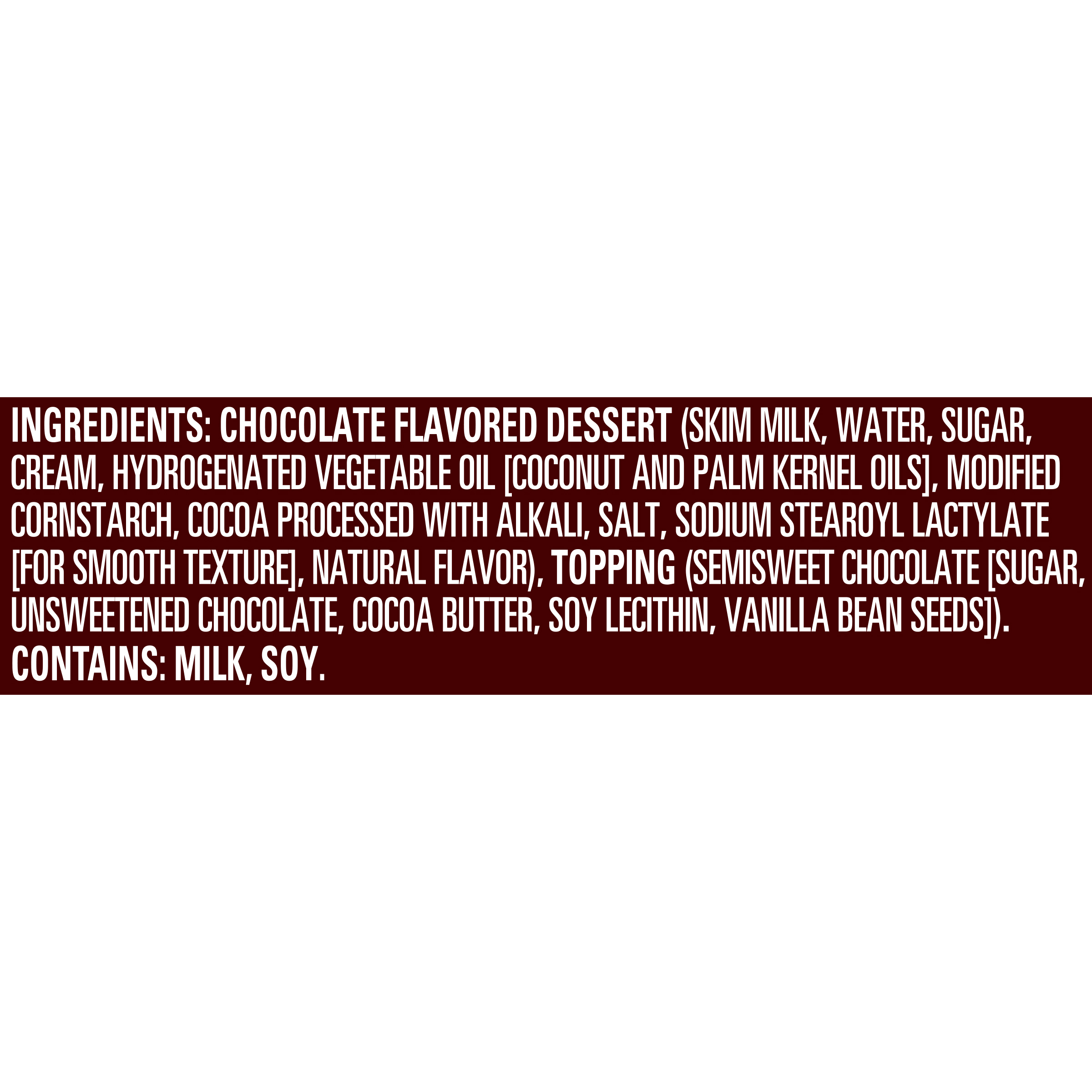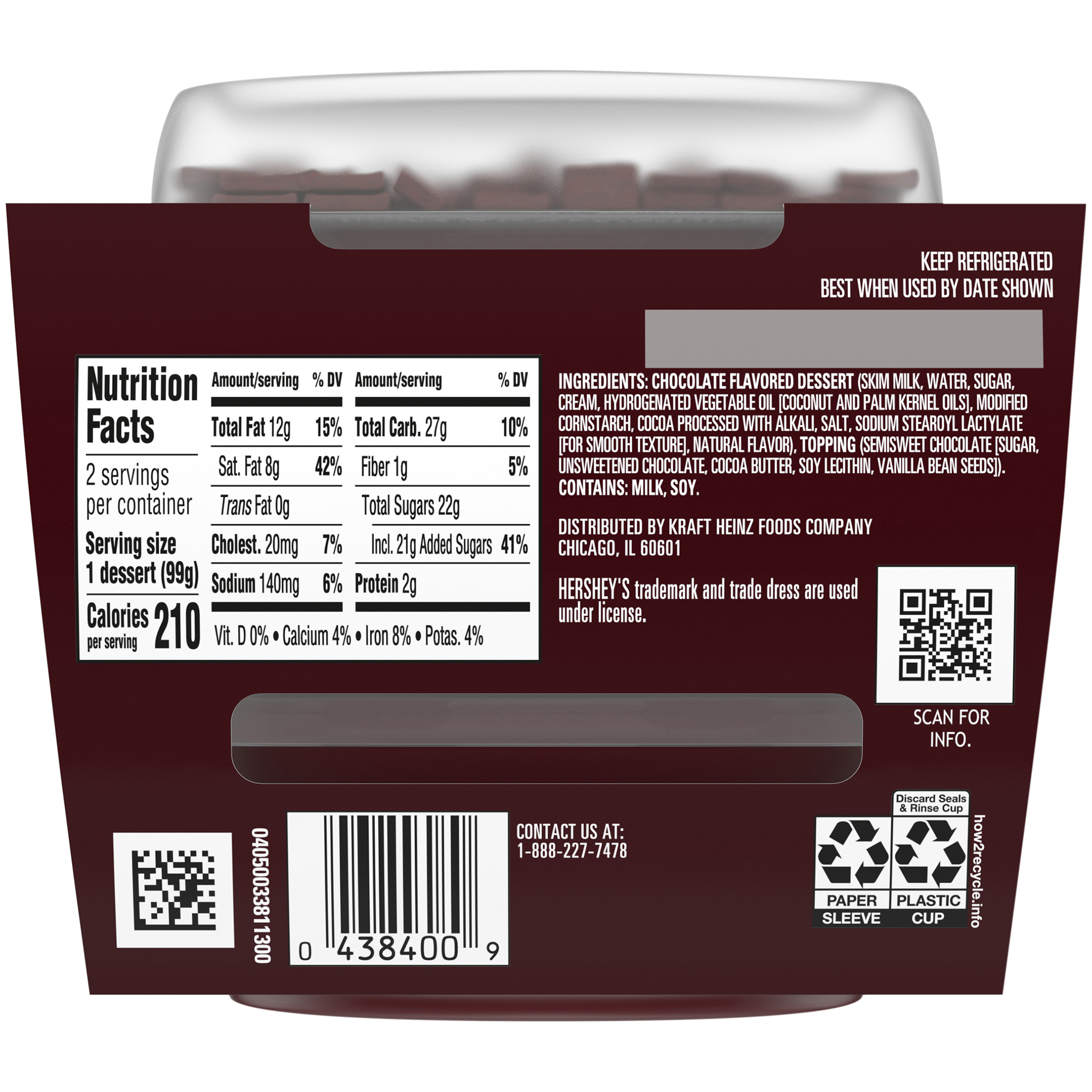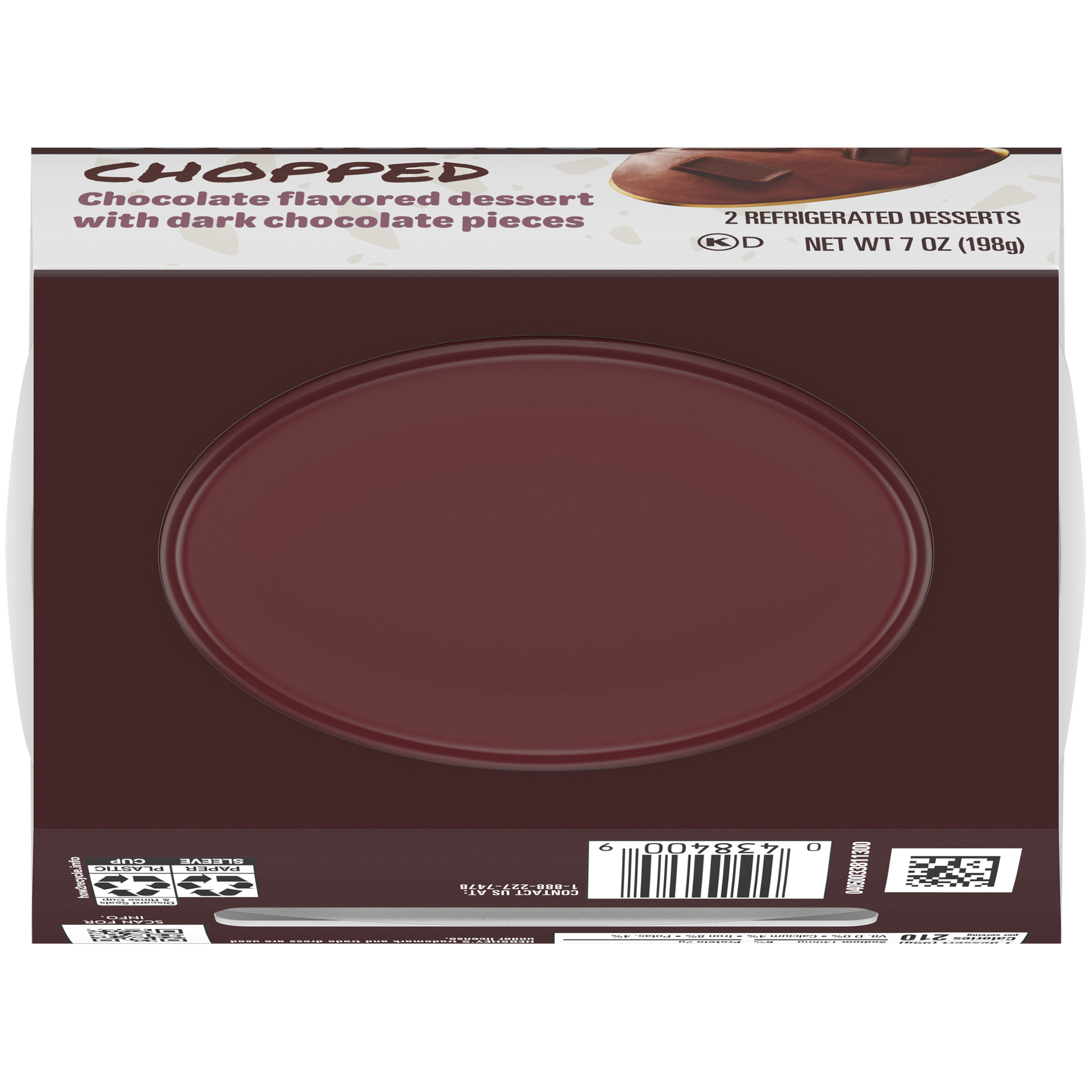 GTIN 00043000008409 Kraft Item Code (SKU) 00430000084070 Product Status Active Pack Level EACH Brand Name COLLIDERS™ Sub Brand CHOPPED Business Unit Hydration Desserts & Meals Catalog Platform Desserts Product Category Refrigerated RTE Desserts Consumer Unit Size 7 Consumer Unit Size UOM OZ Packaging Type (Computed) Pack Packaging Type Code PALLET BOX Packaging Type Code Override (Manual) PACK Sub Units Per Item 1 Variant Hershey’S Chocolate Sub Variant Chopped Global Product Classification Code 10000312 Computed Exports - Ingredients CHOCOLATE FLAVORED DESSERT (SKIM MILK, WATER, SUGAR, CREAM, HYDROGENATED VEGETABLE OIL [COCONUT AND PALM KERNEL OILS], MODIFIED CORNSTARCH, COCOA PROCESSED WITH ALKALI, SALT, SODIUM STEAROYL LACTYLATE [FOR SMOOTH TEXTURE], NATURAL FLAVOR), TOPPING (SEMISWEET CHOCOLATE [SUGAR, UNSWEETENED CHOCOLATE, COCOA BUTTER, SOY LECITHIN, VANILLA BEAN SEEDS]). Parent Reference 10043000008406 Quality Statement Best When Used By Date Shown Storage Instructions Keep Refrigerated Customer Guarantee 40 Temperature Classification Code 04 Net Weight 0.438 Gross Weight 0.516 Weight UOM LB Height (in) 4.2 Length/Depth (in) 3.13 Width (in) 4.657 Case Cube 0.035 Parent Relation CASE_10043000008406 Parent Kraft Item Code (SKU) 00430000084000 Product Title COLLIDERS™ Chopped HERSHEY’S Chocolate Refrigerated Dessert, 2 ct Pack eCommerce Product Name (Generic Name) HERSHEY’S Chocolate Refrigerated Dessert Product Benefits (Includes Seasonal + Formatting) - 2 COLLIDERS™ Chopped HERSHEY’S Chocolate Refrigerated Desserts