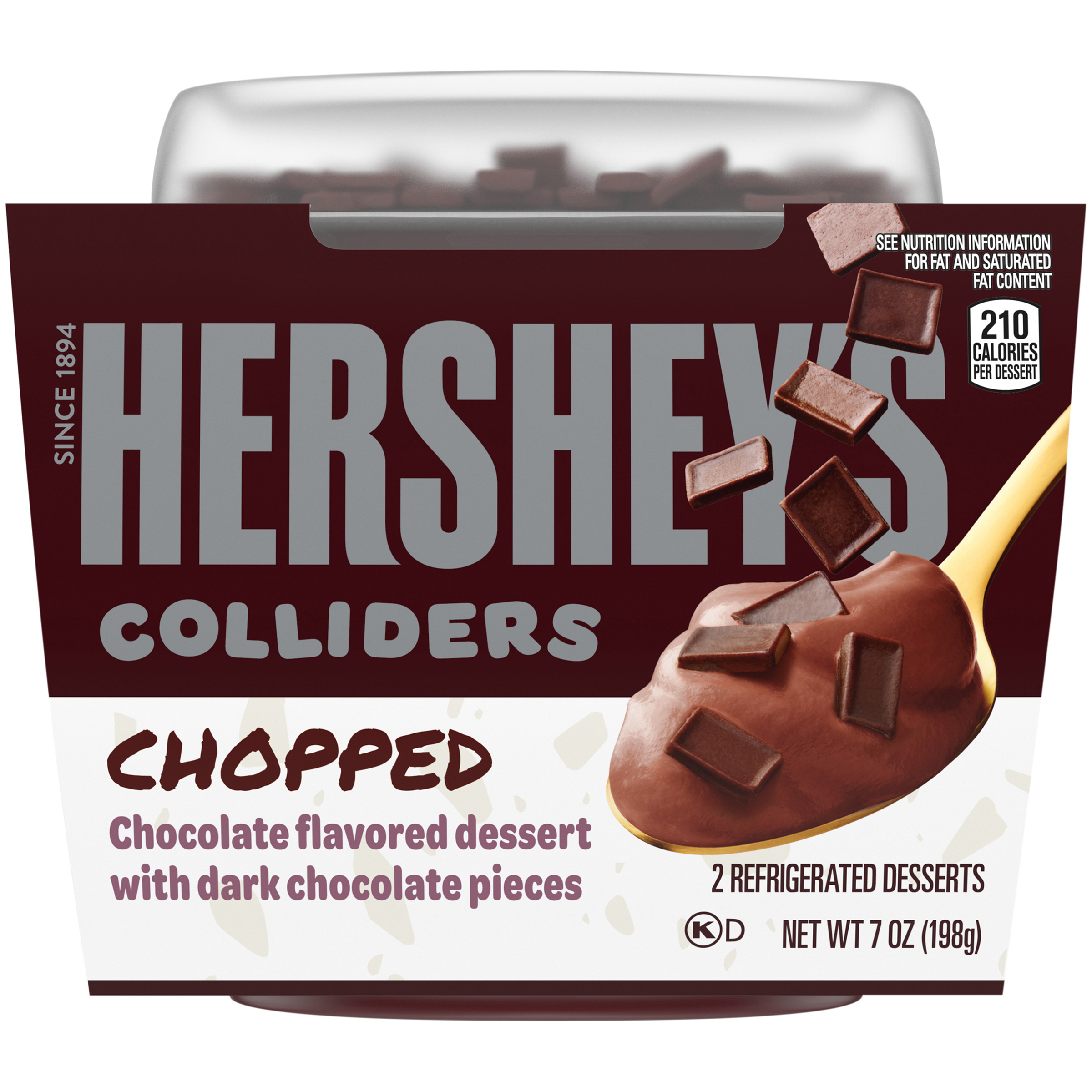 Product Description COLLIDERS™ Chopped HERSHEY’S Chocolate Refrigerated Dessert takes your favorite HERSHEY’S Chocolate candy flavor and turns it into a cool, creamy spoonable dessert. Enjoy our chocolate flavored dessert topped with chopped pieces of dark chocolate candy in seconds. Just open the chocolate dessert cups, pour the dark chocolate pieces on top, mix and enjoy. Made with real cream and sugar. Dig into a collision of flavors and textures all in one delicious chocolate dessert. Perfect as both a daytime sweet treat or after dinner dessert. Each of the two COLLIDERS™ Chopped HERSHEY’S Chocolate candy desserts come in a convenient single-serve cup for easy enjoyment anywhere.