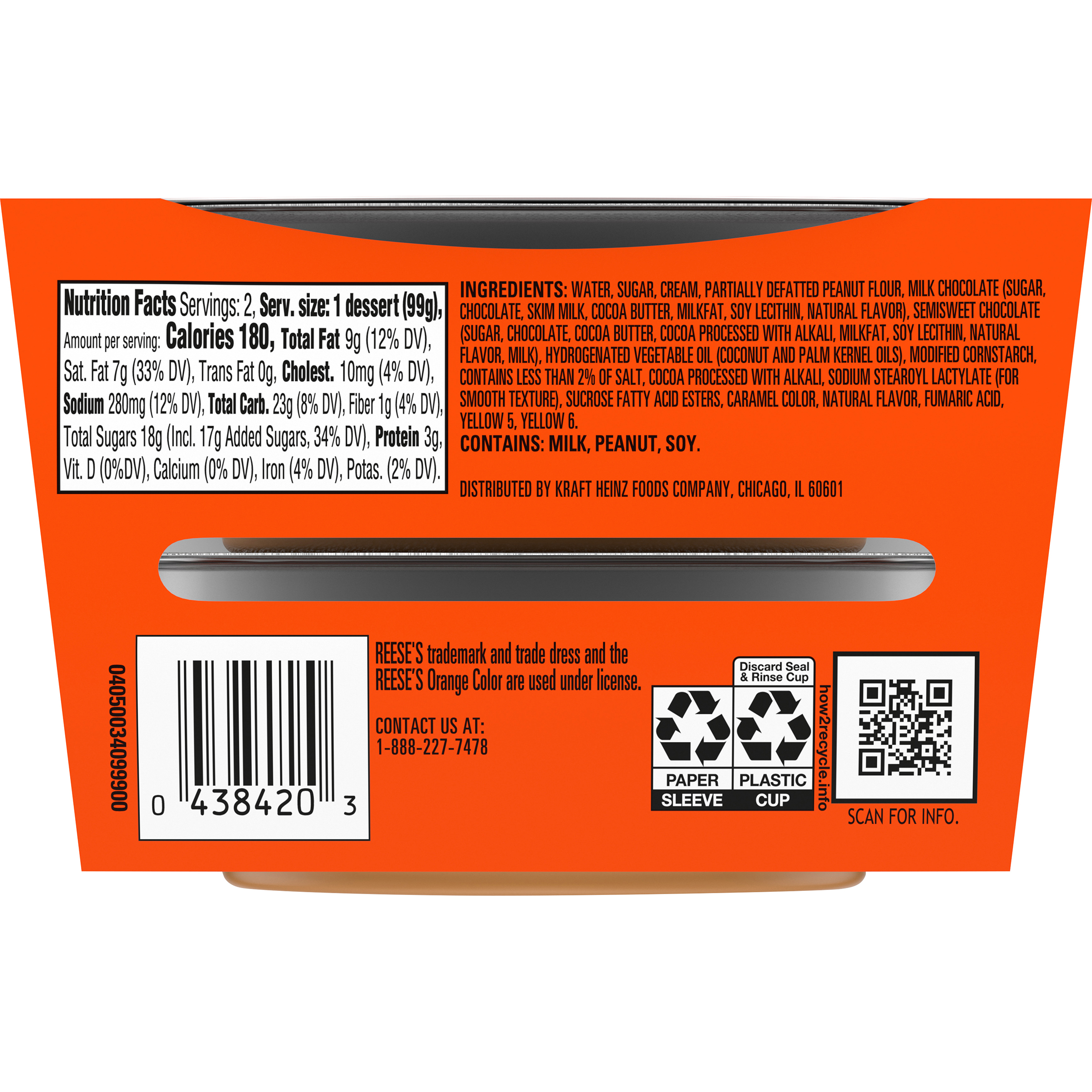 GTIN 00043000008423 Kraft Item Code (SKU) 00430000084270 Product Status Active Pack Level EACH Brand Name COLLIDERS™ Sub Brand LAYERED Business Unit Hydration Desserts & Meals Catalog Platform Desserts Product Category Refrigerated RTE Desserts Consumer Unit Size 7 Consumer Unit Size UOM OZ Packaging Type (Computed) Pack Packaging Type Code PALLET BOX Packaging Type Code Override (Manual) PACK Sub Units Per Item 1 Variant Reese’s Sub Variant Layered Global Product Classification Code 10000312 Computed Exports - Ingredients WATER, SUGAR, CREAM, PARTIALLY DEFATTED PEANUT FLOUR, MILK CHOCOLATE (SUGAR, CHOCOLATE, SKIM MILK, COCOA BUTTER, MILKFAT, SOY LECITHIN, NATURAL FLAVOR), SEMISWEET CHOCOLATE (SUGAR, CHOCOLATE, COCOA BUTTER, COCOA PROCESSED WITH ALKALI, MILKFAT, SOY LECITHIN, NATURAL FLAVOR, MILK), HYDROGENATED VEGETABLE OIL (COCONUT AND PALM KERNEL OILS), MODIFIED CORNSTARCH, CONTAINS LESS THAN 2% OF SALT, COCOA PROCESSED WITH ALKALI , SODIUM STEAROYL LACTYLATE (FOR SMOOTH TEXTURE), SUCROSE FATTY ACID ESTERS, CARAMEL COLOR, NATURAL FLAVOR, FUMARIC ACID, YELLOW 5, YELLOW 6. Parent Reference 10043000008420 Quality Statement Best When Used By Date Shown Storage Instructions Keep Refrigerated Customer Guarantee 40 Temperature Classification Code 04 Net Weight 0.438 Gross Weight 0.488 Weight UOM LB Height (in) 3.11 Length/Depth (in) 2.77 Width (in) 4.657 Case Cube 0.023 Parent Relation CASE_10043000008420 Parent Kraft Item Code (SKU) 00430000084200 Product Title COLLIDERS™ Layered REESE'S Refrigerated Dessert, 2 ct Pack eCommerce Product Name (Generic Name) REESE'S Refrigerated Dessert Product Benefits (Includes Seasonal + Formatting) - 2 COLLIDERS™ Layered REESE'S Refrigerated Pudding Cups Desserts