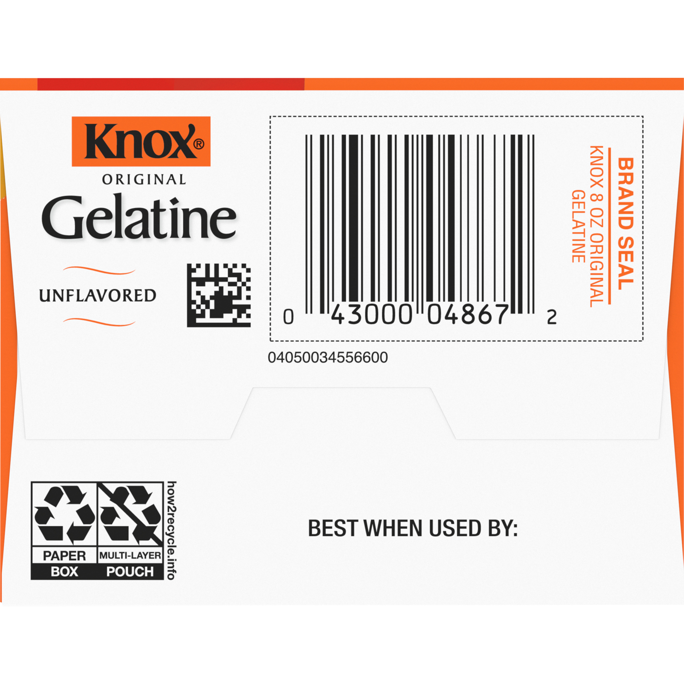 GTIN 00043000048672 Kraft Item Code (SKU) 00430000486770 Product Status Active Pack Level EACH Brand Name Knox Business Unit Hydration Desserts & Meals Catalog Platform Desserts Product Category Dry Package Dessert Consumer Unit Size 8 Consumer Unit Size UOM OZ Packaging Type (Computed) Box Packaging Type Code BOX/CARTON Packaging Type Code Override (Manual) PACKETS Sub Units Per Item 1 Variant UNFLAVORED Global Product Classification Baking/Cooking Supplies (Shelf Stable) Global Product Classification Code 10000312 Computed Exports - Ingredients GELATINE. Parent Reference 10043000048679 Quality Statement BEST WHEN USED BY Customer Guarantee 180 Temperature Classification Ambient Prevailing Conditions Temperature Classification Code 01 Net Weight 0.5 Gross Weight 0.626 Weight UOM LB Height (in) 5.563 Length/Depth (in) 2.875 Width (in) 3.688 Case Cube 0.034 Parent Relation CASE_10043000048679 Parent Kraft Item Code (SKU) 00430000486700 Product Title Knox Original Unflavored Gelatin, 32 ct Packets eCommerce Product Name (Generic Name) Original Unflavored Gelatin Product Benefits (Includes Seasonal + Formatting) - One 8 oz box of Knox Unflavored Gelatin