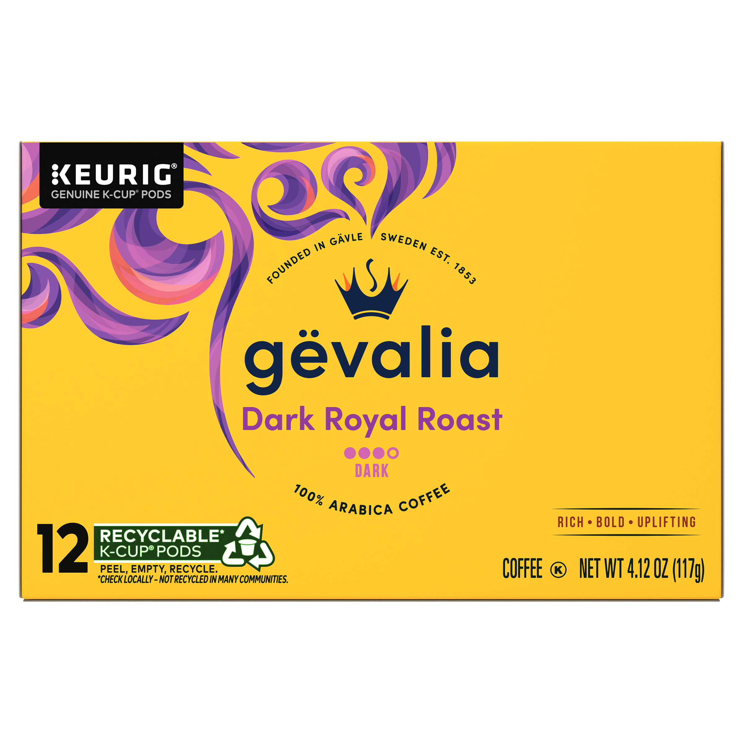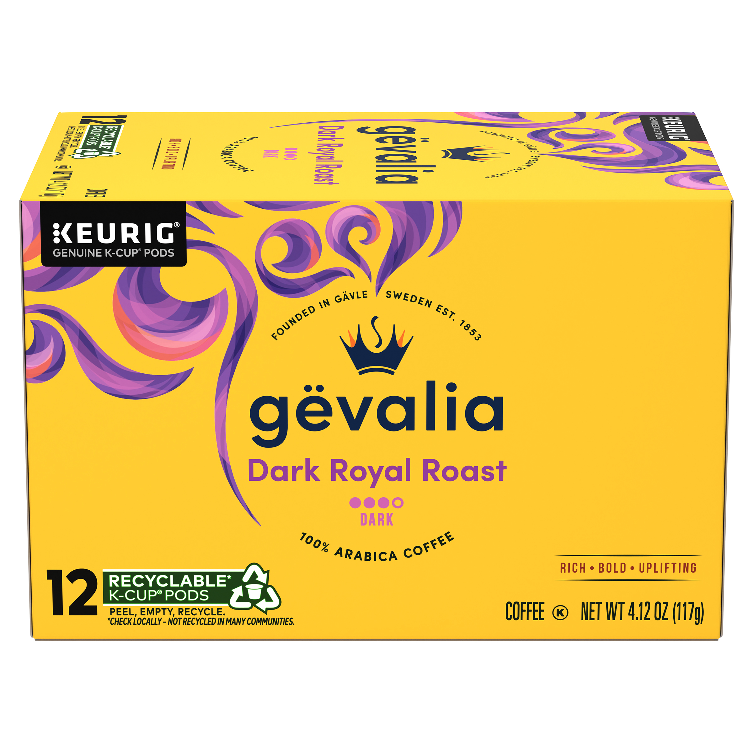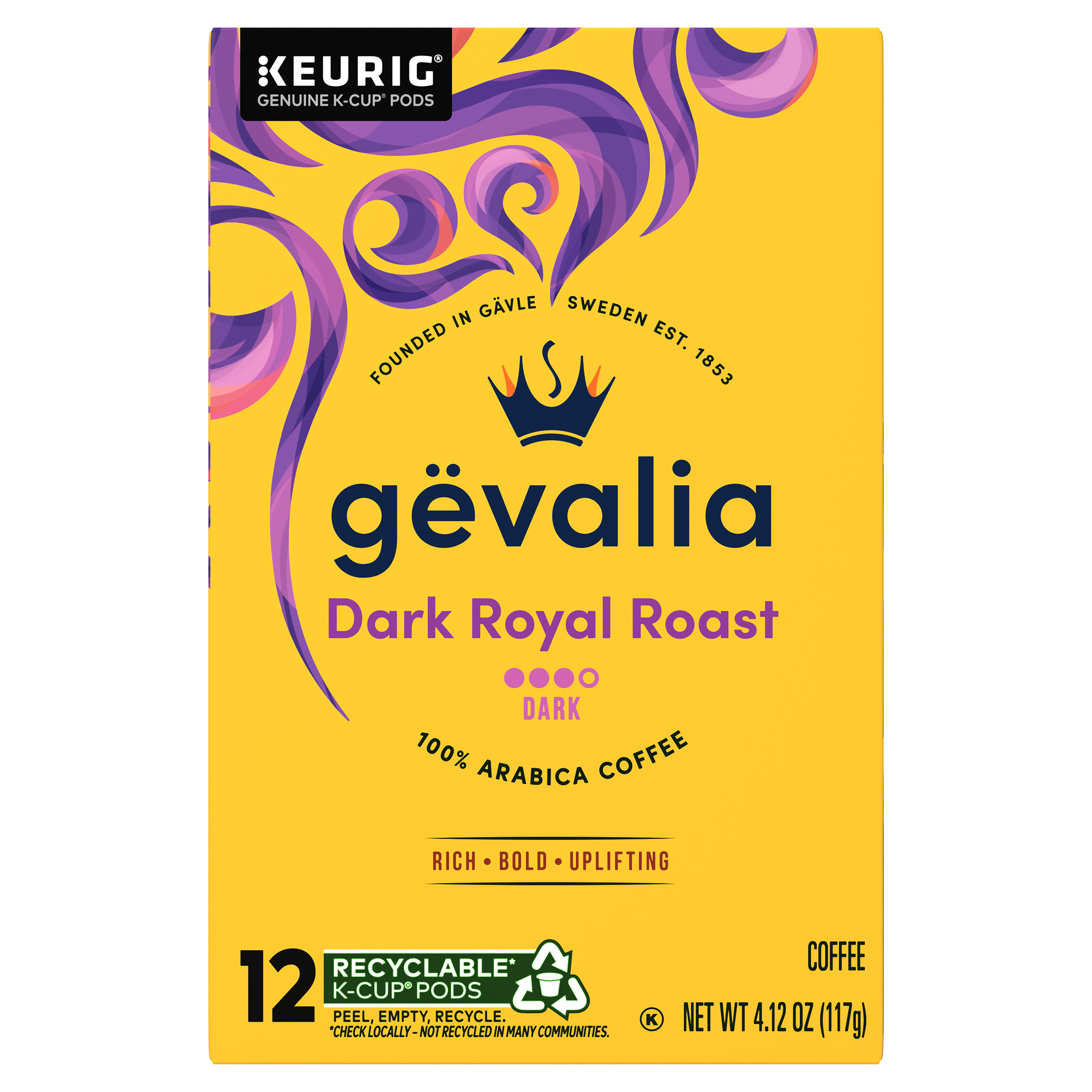 Product Description Gevalia Dark Royal Roast K Cup Coffee Pods fill your mug with rich and never-bitter dark roast coffee. Founded in Gavle, Sweden in 1853, Gevalia uses the perfect care to brew the perfect cup of coffee. Each K Cup pod is made with 100% Arabica beans that are slow-roasted and snap cooled. Our K Cups coffee is crafted from 100% Arabica coffee beans sourced from around the world. The perfect coffee pod for all Keurig® 1.0 & 2.0 brewing systems. Our 12-count box of Dark Royal Roast coffee pods are great for keeping Kosher. Gevalia K Cups lock in flavor until you are ready to enjoy. Try Gevalia K Cups and experience the taste of 150 years of Swedish tradition.