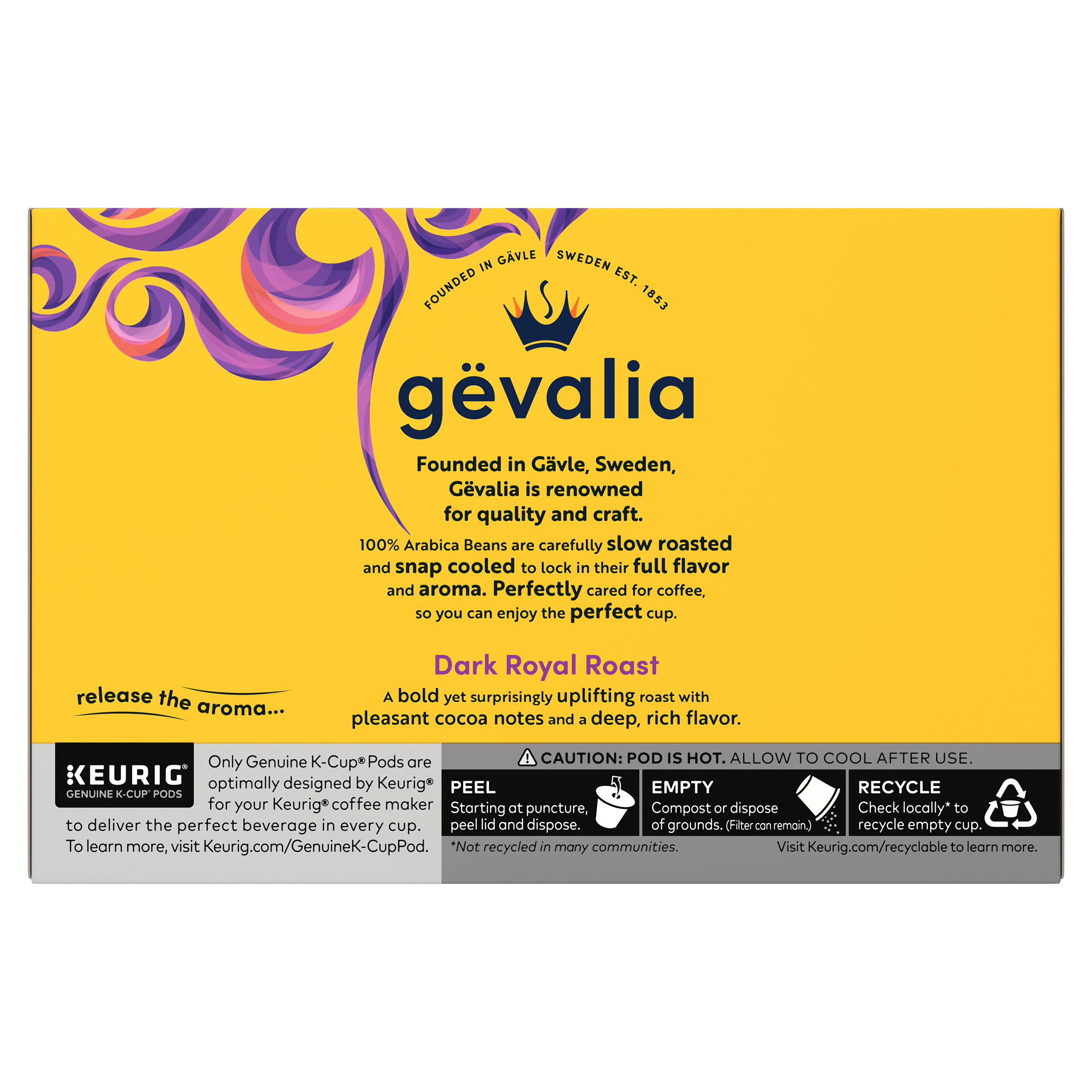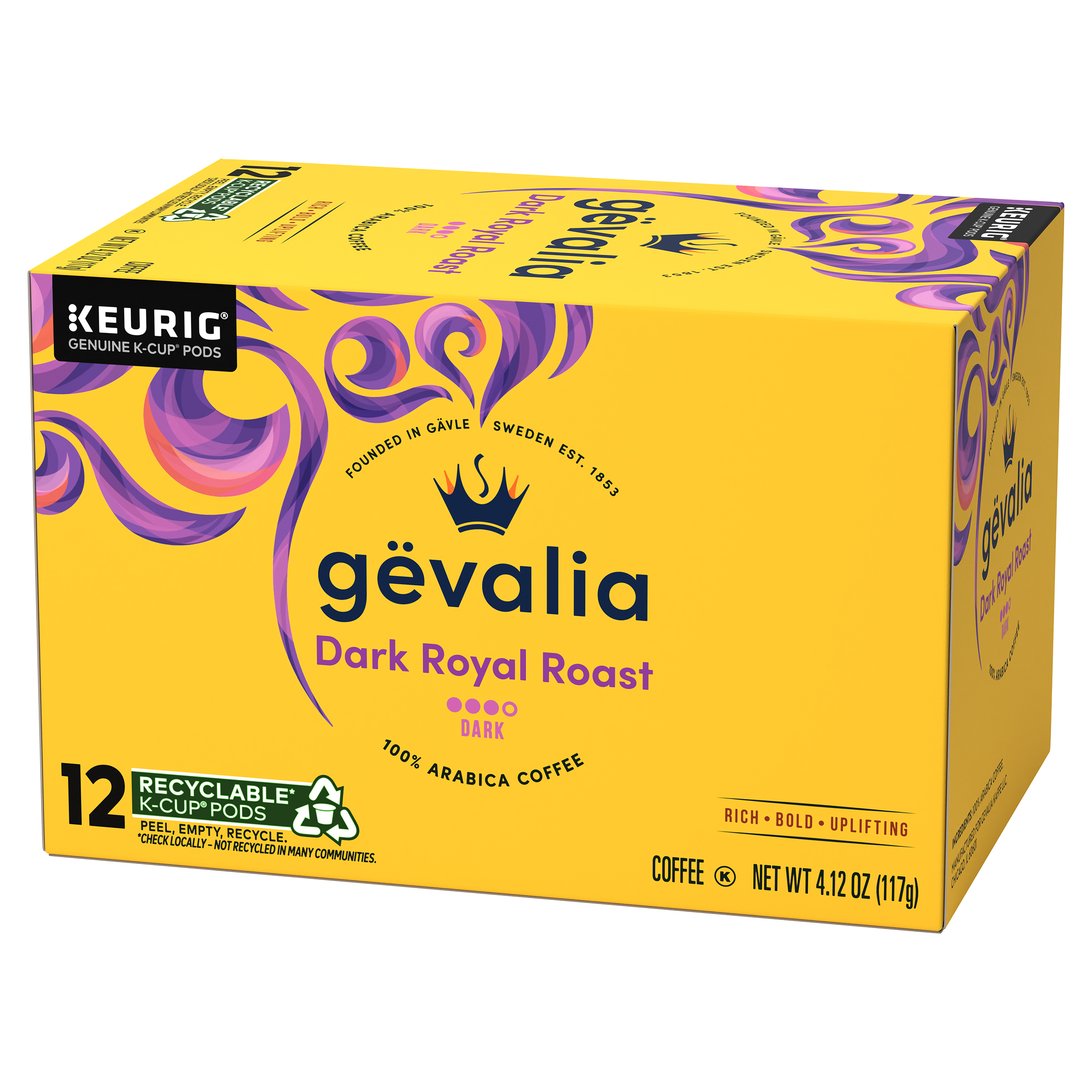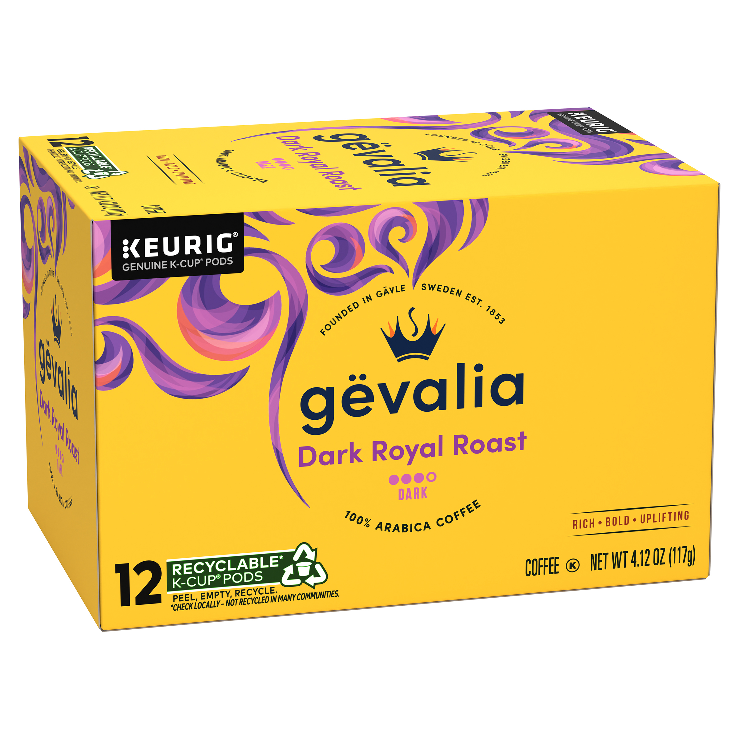 Product Description Gevalia Dark Royal Roast K Cup Coffee Pods fill your mug with rich and never-bitter dark roast coffee. Founded in Gavle, Sweden in 1853, Gevalia uses the perfect care to brew the perfect cup of coffee. Each K Cup pod is made with 100% Arabica beans that are slow-roasted and snap cooled. Our K Cups coffee is crafted from 100% Arabica coffee beans sourced from around the world. The perfect coffee pod for all Keurig® 1.0 & 2.0 brewing systems. Our 12-count box of Dark Royal Roast coffee pods are great for keeping Kosher. Gevalia K Cups lock in flavor until you are ready to enjoy. Try Gevalia K Cups and experience the taste of 150 years of Swedish tradition.
