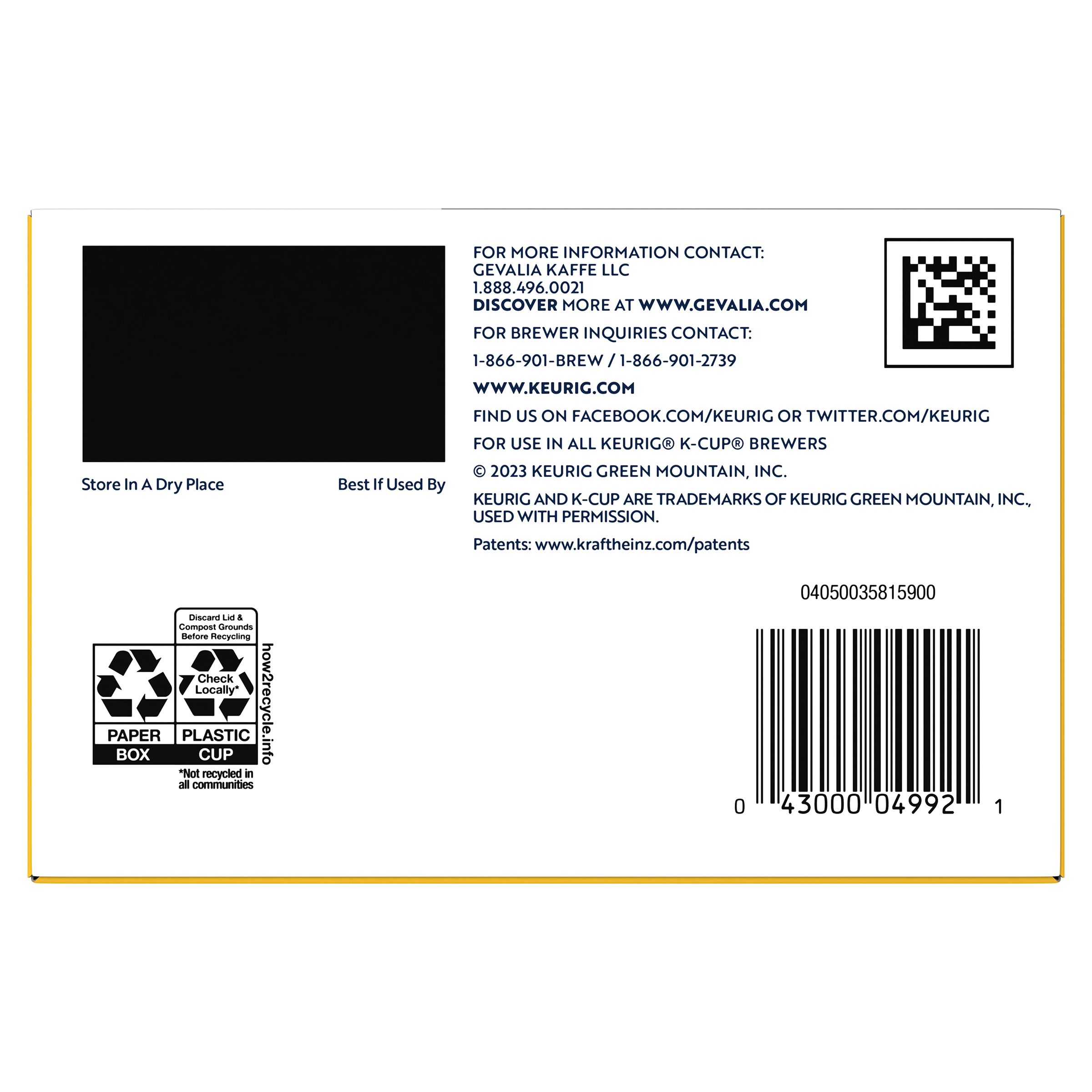 GTIN 00043000049921 Kraft Item Code (SKU) 00430000499270 Product Status Active Pack Level EACH Brand Name Gevalia Business Unit Meat Cheese Coffee & Snacks Catalog Platform Coffee Product Category Coffee Pods Consumer Unit Size 4.12 Consumer Unit Size UOM OZ Packaging Type (Computed) Box Packaging Type Code BOX/CARTON Packaging Type Code Override (Manual) BOX Sub Units Per Item 1 Variant Dark Royal Roast Global Product Classification Coffee/Coffee Substitutes - Beans/Ground Global Product Classification Code 10008179 Parent Reference 10043000049928 Quality Statement Best If Used By Storage Instructions Store In A Dry Place Customer Guarantee 90 Temperature Classification Ambient Prevailing Conditions Temperature Classification Code 01 Net Weight 0.258 Gross Weight 0.397 Weight UOM LB Height (in) 3.78 Length/Depth (in) 3.78 Width (in) 5.787 Case Cube 0.048 Parent Relation CASE_10043000049928 Parent Kraft Item Code (SKU) 00430000499200 Product Title Gevalia Dark Royal Roast Dark Roast K‐Cup® Coffee Pods, 12 ct. Box eCommerce Product Name (Generic Name) Dark Royal Roast Dark Roast K-Cup® Coffee Pods Product Benefits (Includes Seasonal + Formatting) - 12 ct box of Gevalia Dark Royal Roast Coffee K Cup Coffee Pods