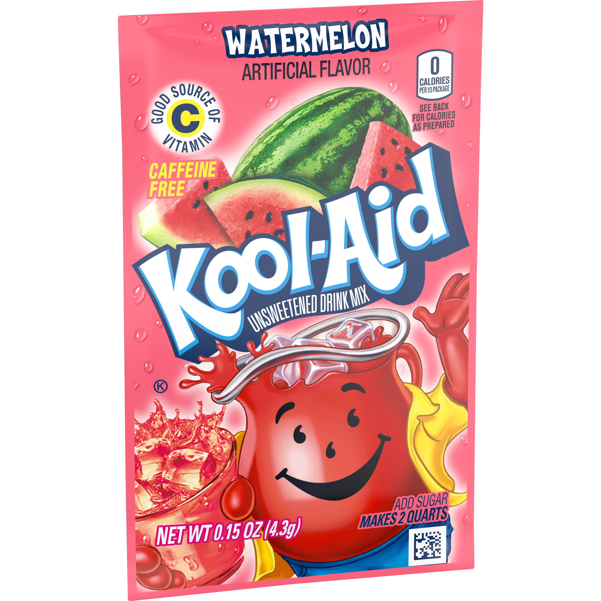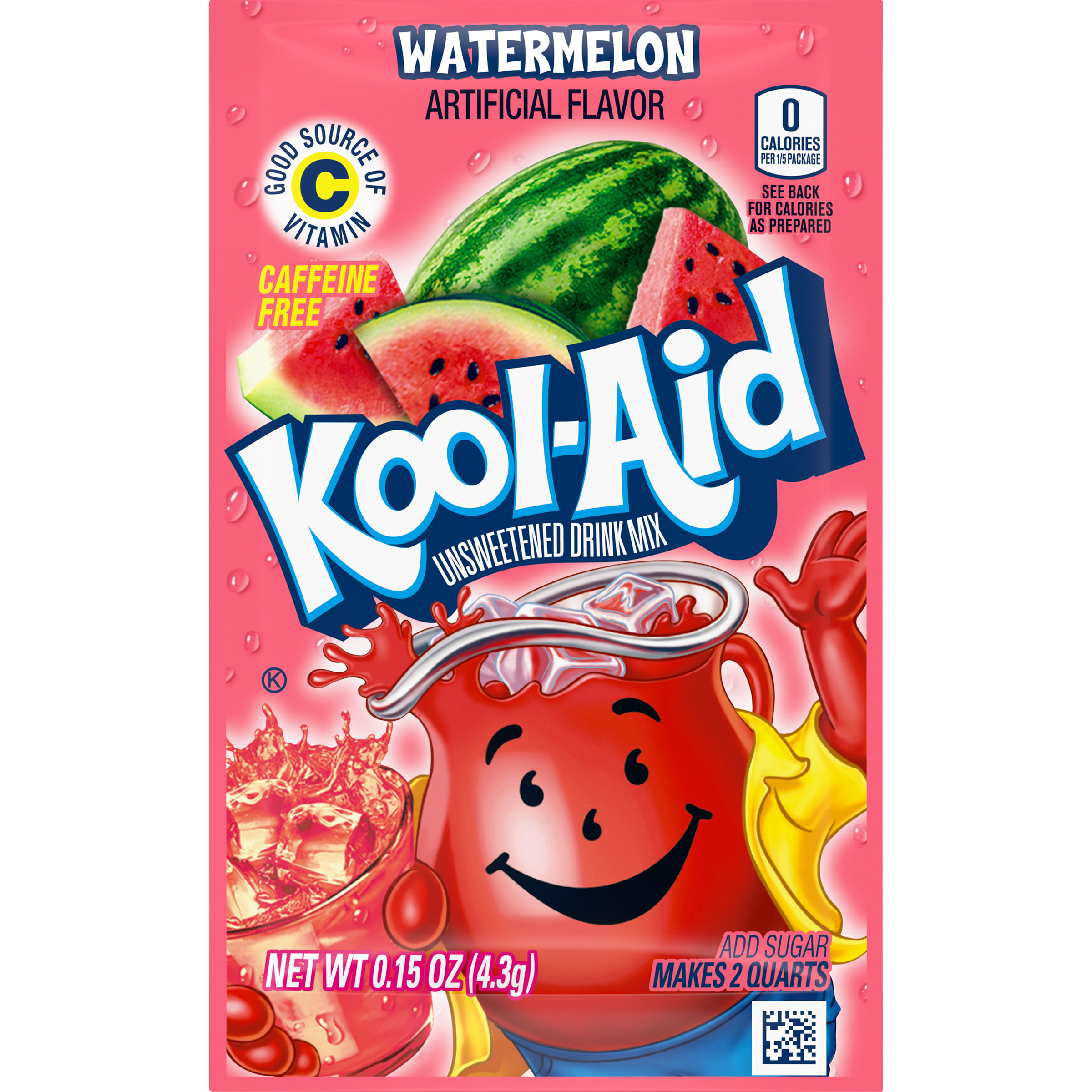 Product Description Oh Yeah! Quench your thirst with Kool-Aid Artificially Flavored Watermelon Unsweetened Drink Mix Packet. Refreshing and delicious, Kool-Aid mix powder makes it easy to prepare a tasty watermelon drink bursting with fruity flavor. With no caffeine, our artificially flavored powdered drink mix is always a great choice for the whole family. It's also a good source of vitamin C. Our handy Kool-Aid packets of unsweetened watermelon drink ensure that you always have a refreshing beverage ready to go. Enjoy anywhere—the beach, the pool or even at school! Drink mix packets are individually sealed until you're ready to prepare. Best of all, you can customize the sweetness to your taste with as little or as much sugar as you desire. Easy to prepare, just empty contents of the 0.15 ounce drink mix packet into a plastic or glass pitcher. Add 1 cup of sugar or sweetener of your choice. Then, add cold water and ice and stir. Every drink powder packet makes a 2 quart supply of tasty watermelon Kool-Aid, enough for 5 servings. Available in a rainbow of flavors, Kool-Aid is flavorful fun made easy! With so many different refreshingly awesome flavors to choose from, it's time to stir up some fun.