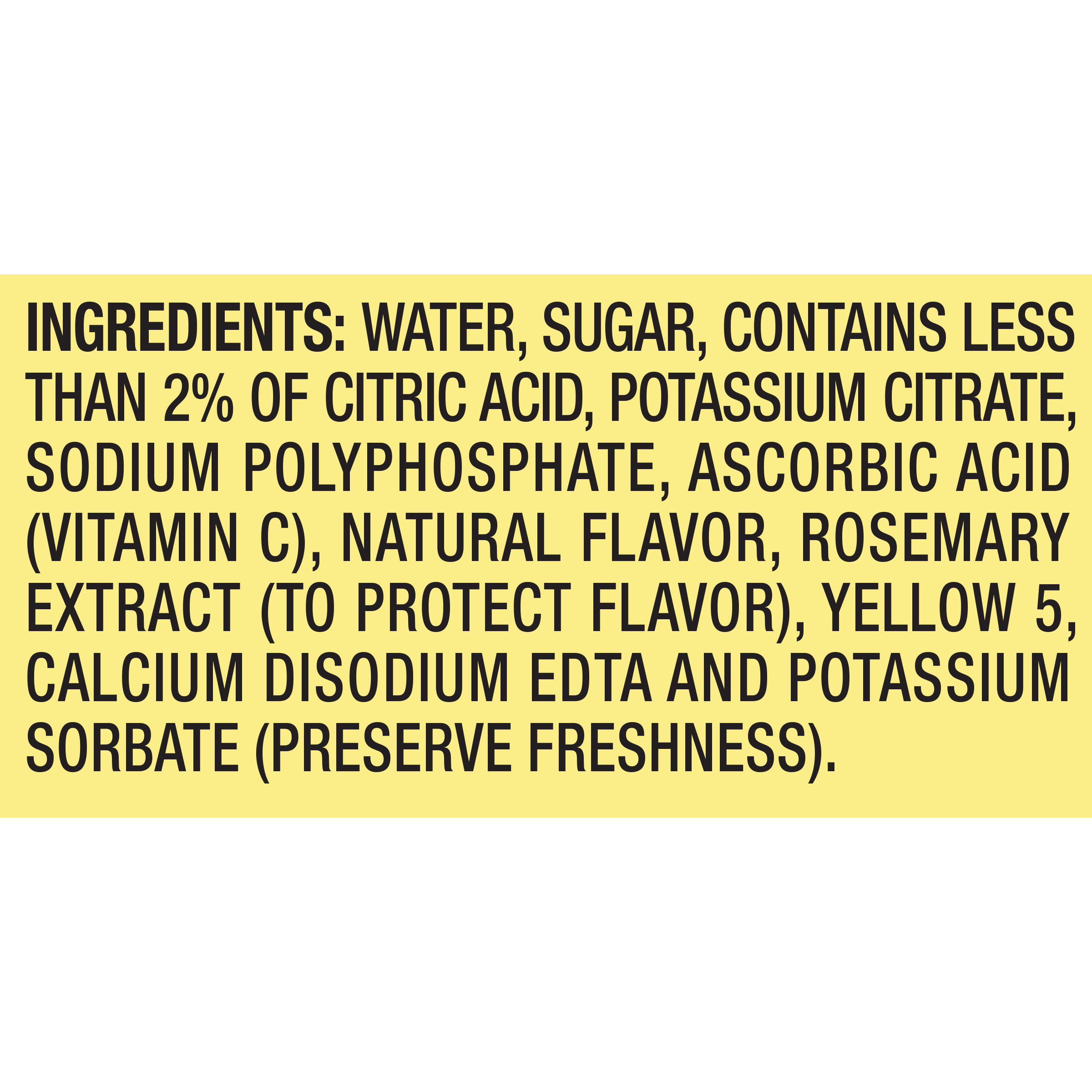 GTIN 00043000069950 Kraft Item Code (SKU) 00430000699570 Product Status Active Pack Level EACH Brand Name Country Time Business Unit Hydration Desserts & Meals Catalog Platform Hydration Product Category Ready To Drink Bottle Consumer Unit Size 64 Consumer Unit Size UOM FO Packaging Type (Computed) Bottle Packaging Type Code BOTTLE Packaging Type Code Override (Manual) BOTTLE Sub Units Per Item 1 Variant Lemonade Global Product Classification Juice Drinks - Ready to Drink (Shelf Stable) Global Product Classification Code 10000201 Computed Exports - Ingredients WATER, SUGAR, CONTAINS LESS THAN 2% OF CITRIC ACID, POTASSIUM CITRATE, SODIUM POLYPHOSPHATE, ASCORBIC ACID (VITAMIN C), NATURAL FLAVOR, ROSEMARY EXTRACT (TO PROTECT FLAVOR), YELLOW 5, CALCIUM DISODIUM EDTA AND POTASSIUM SORBATE (PRESERVE FRESHNESS). Parent Reference 10043000069957 Customer Guarantee 90 Temperature Classification Ambient Prevailing Conditions Temperature Classification Code 01 Net Weight 4 Gross Weight 4.624 Weight UOM LB Height (in) 10.492 Length/Depth (in) 3.572 Width (in) 4.528 Case Cube 0.098 Parent Relation CASE_10043000069957 Parent Kraft Item Code (SKU) 00430000699500 Product Title Country Time Artificially Flavored Drink, 1 Bottle, for Flavorful Hydration and Shareable Refreshment, Lemonade, No Artificial Sweeteners, Good Source of Vitamin C, 64 oz eCommerce Product Name (Generic Name) Lemonade Naturally Flavored Drink Product Benefits (Includes Seasonal + Formatting) - COUNTRY TIME BOTTLE: One 64 fl oz bottle of Country Time Lemonade Natural Flavored Drink
