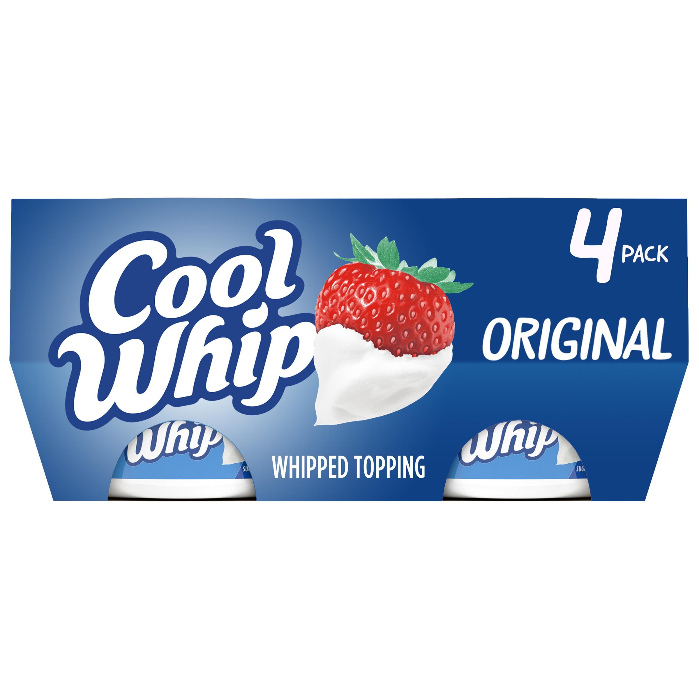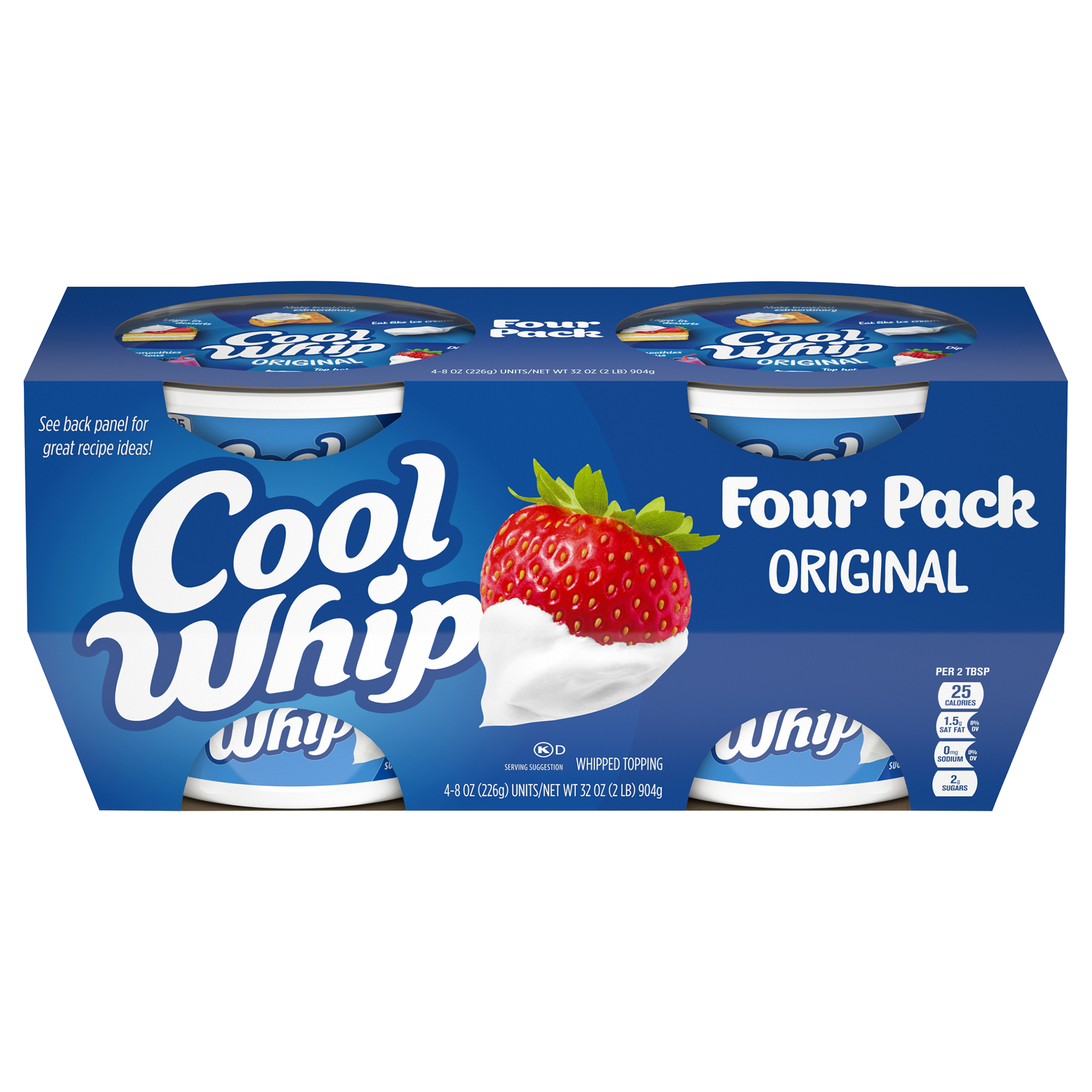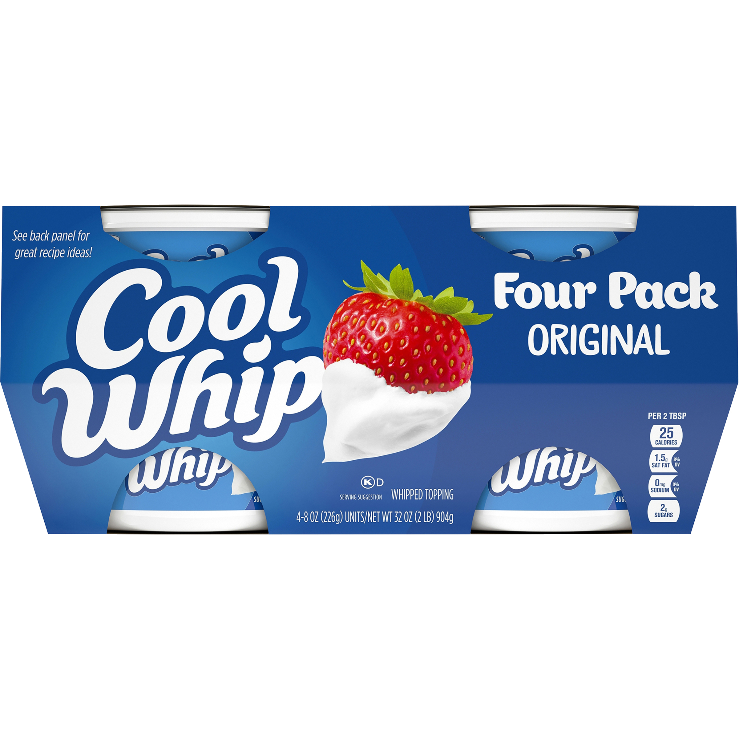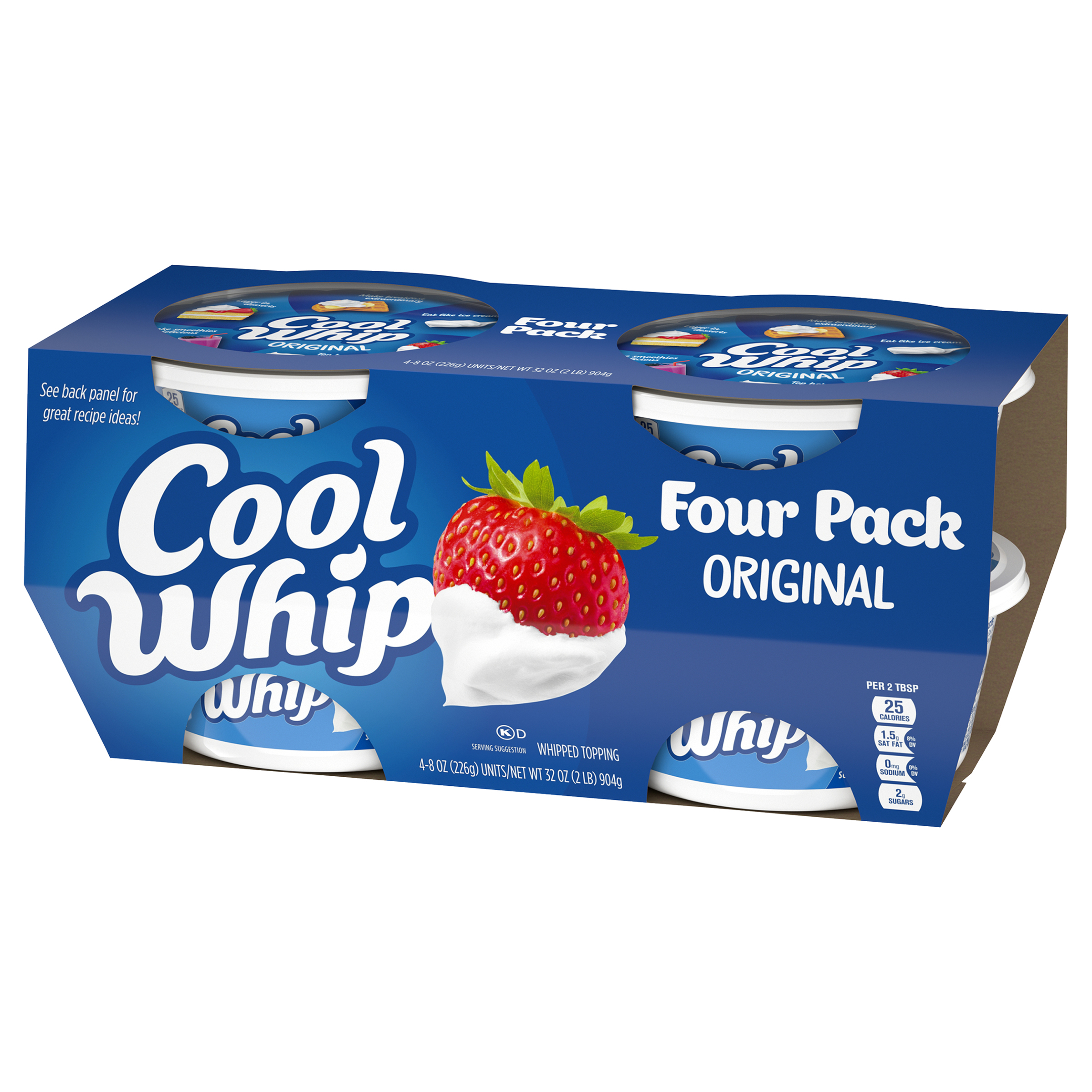 Product Description Cool and creamy, delicious and dreamy, Cool Whip is the dollop that makes desserts extra special. So light and fluffy, it adds a cloud of perfection to everything from pies to ice cream sundaes. Cool Whip is a one-of-a-kind creamy whipped topping. Each serving contains 25 calories and 1.5 grams of fat. Add to your favorite dessert creations like banana pudding, strawberry shortcake or parfaits. Top your hot chocolate, add to a smoothie or dip fresh fruit. The possibilities are endless! Stay stocked up with our 4-pack and keep our frozen whipped topping in the freezer until ready to thaw and enjoy. Each of our 8-ounce tubs of Cool Whip stays Fridge Fresh for two weeks. Just dollop and enjoy!