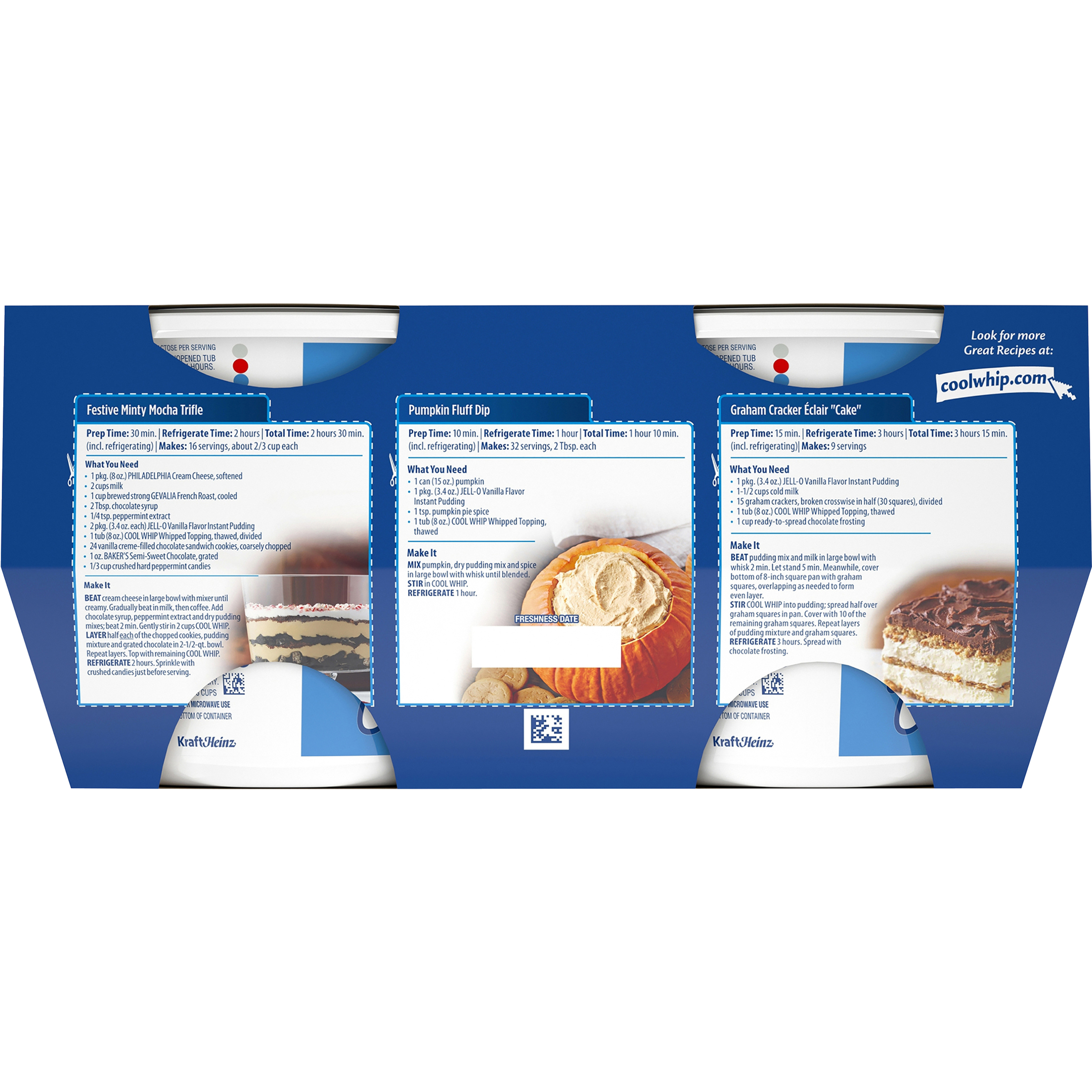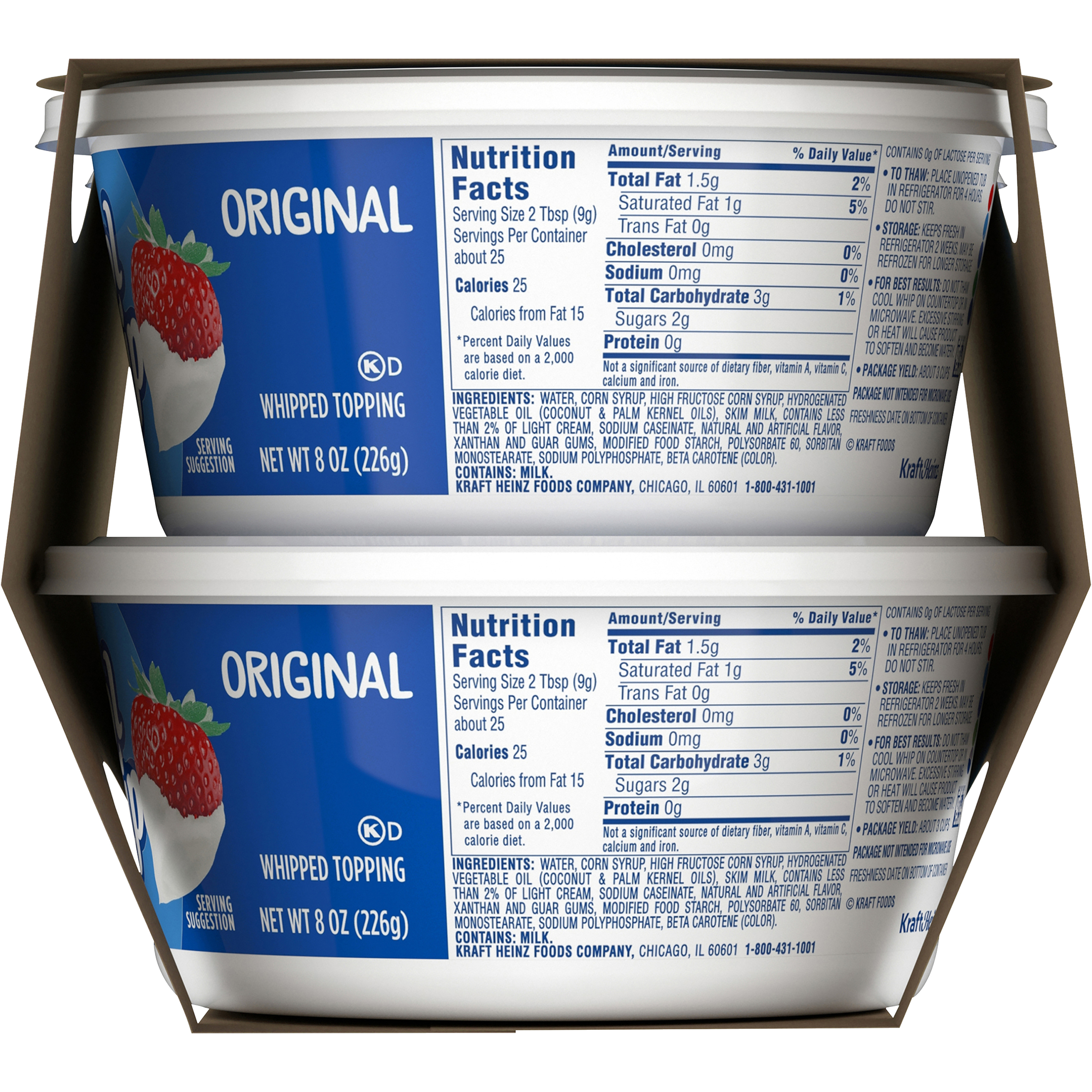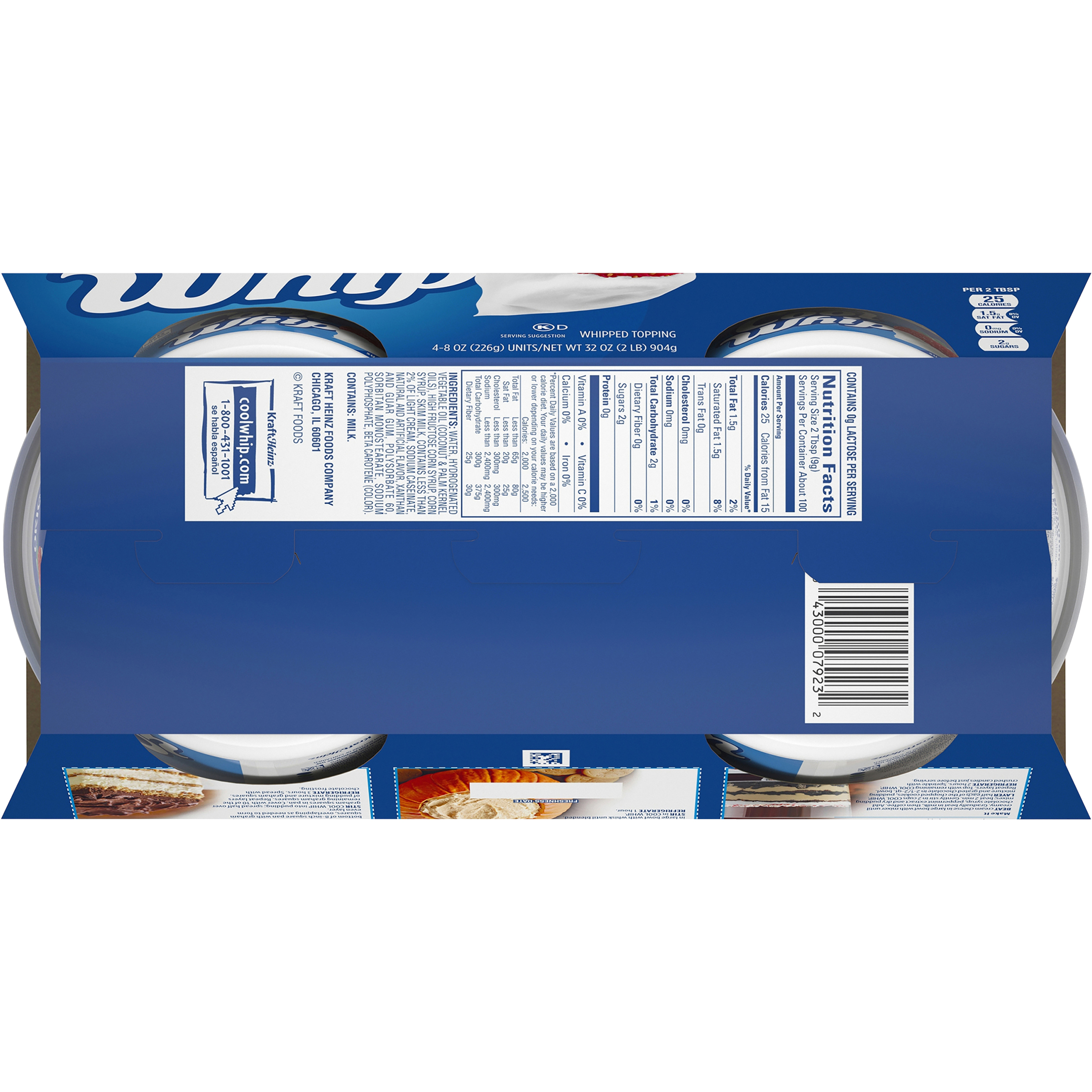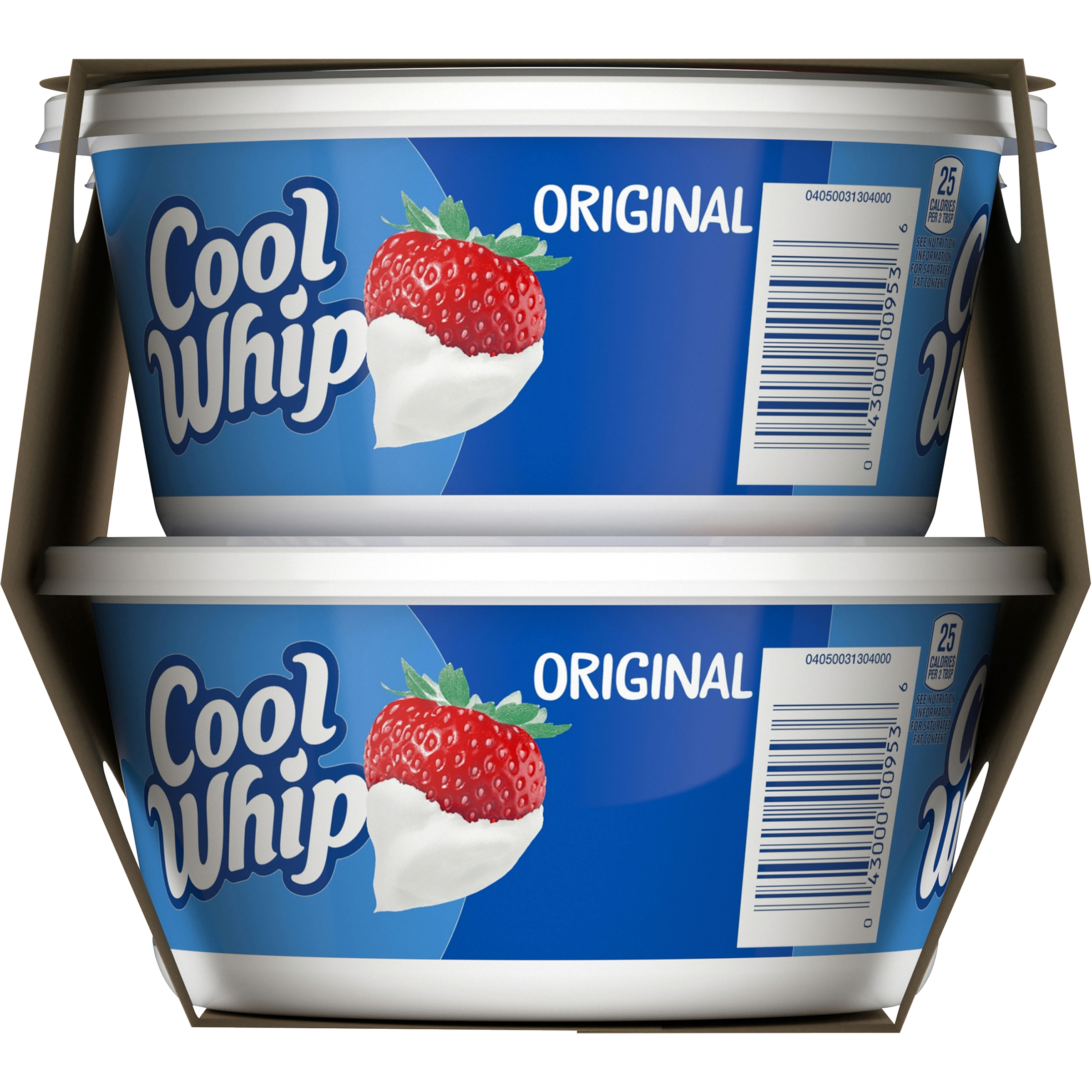 Product Description Cool and creamy, delicious and dreamy, Cool Whip is the dollop that makes desserts extra special. So light and fluffy, it adds a cloud of perfection to everything from pies to ice cream sundaes. Cool Whip is a one-of-a-kind creamy whipped topping. Each serving contains 25 calories and 1.5 grams of fat. Add to your favorite dessert creations like banana pudding, strawberry shortcake or parfaits. Top your hot chocolate, add to a smoothie or dip fresh fruit. The possibilities are endless! Stay stocked up with our 4-pack and keep our frozen whipped topping in the freezer until ready to thaw and enjoy. Each of our 8-ounce tubs of Cool Whip stays Fridge Fresh for two weeks. Just dollop and enjoy!