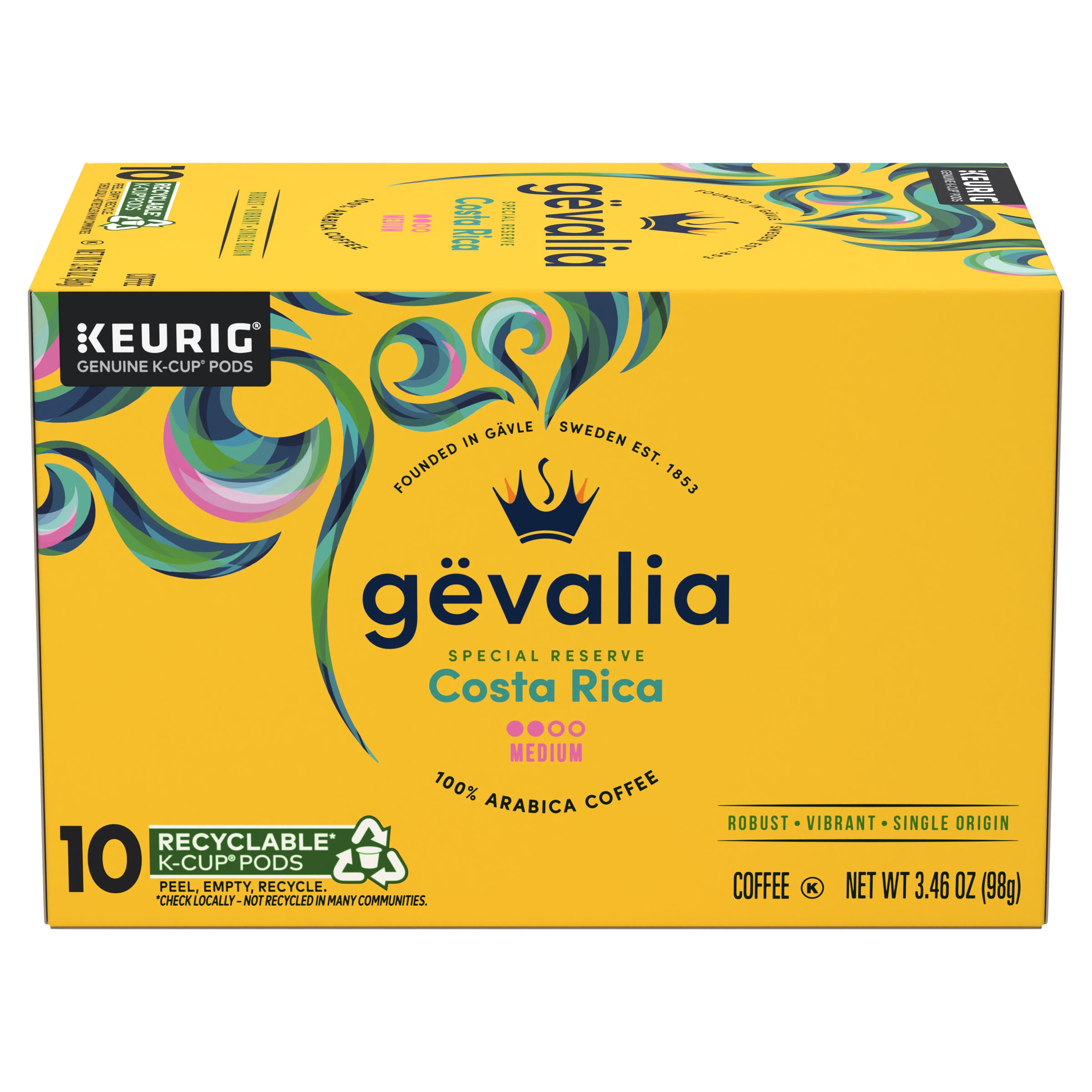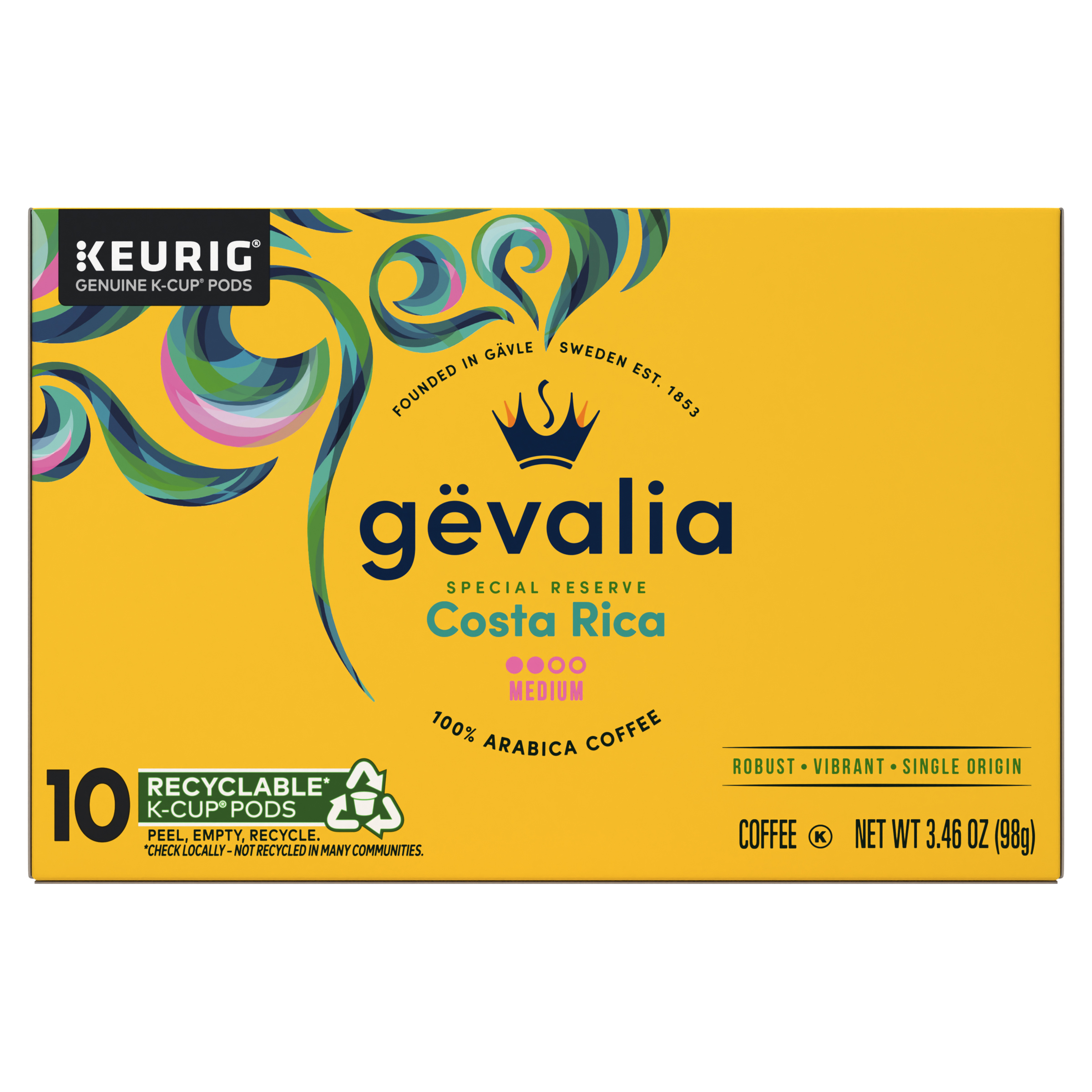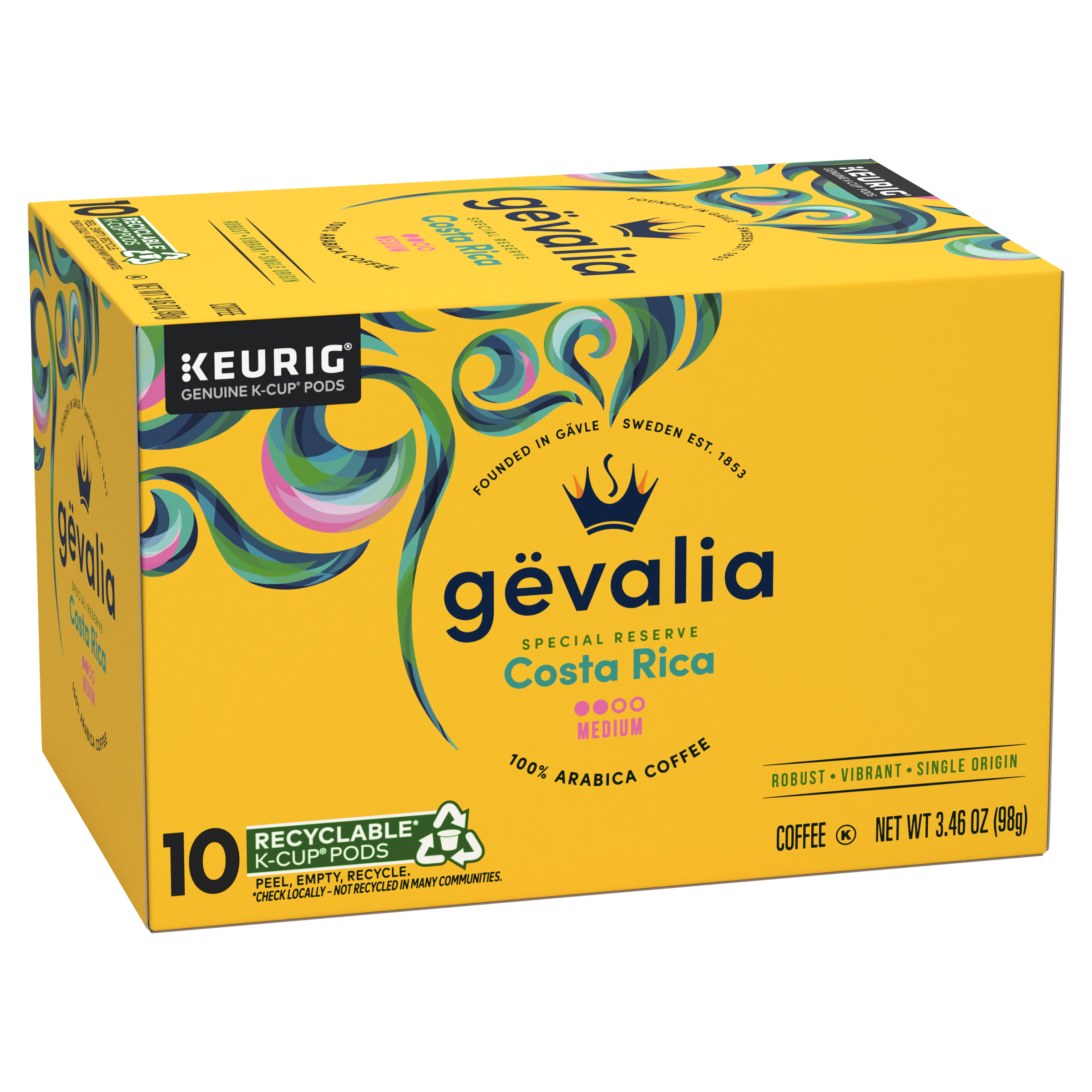 - Each box of Gevalia Costa Rica Single Origin Special Reserve K Cup Coffee Pods delivers medium-dark roast coffee to your home