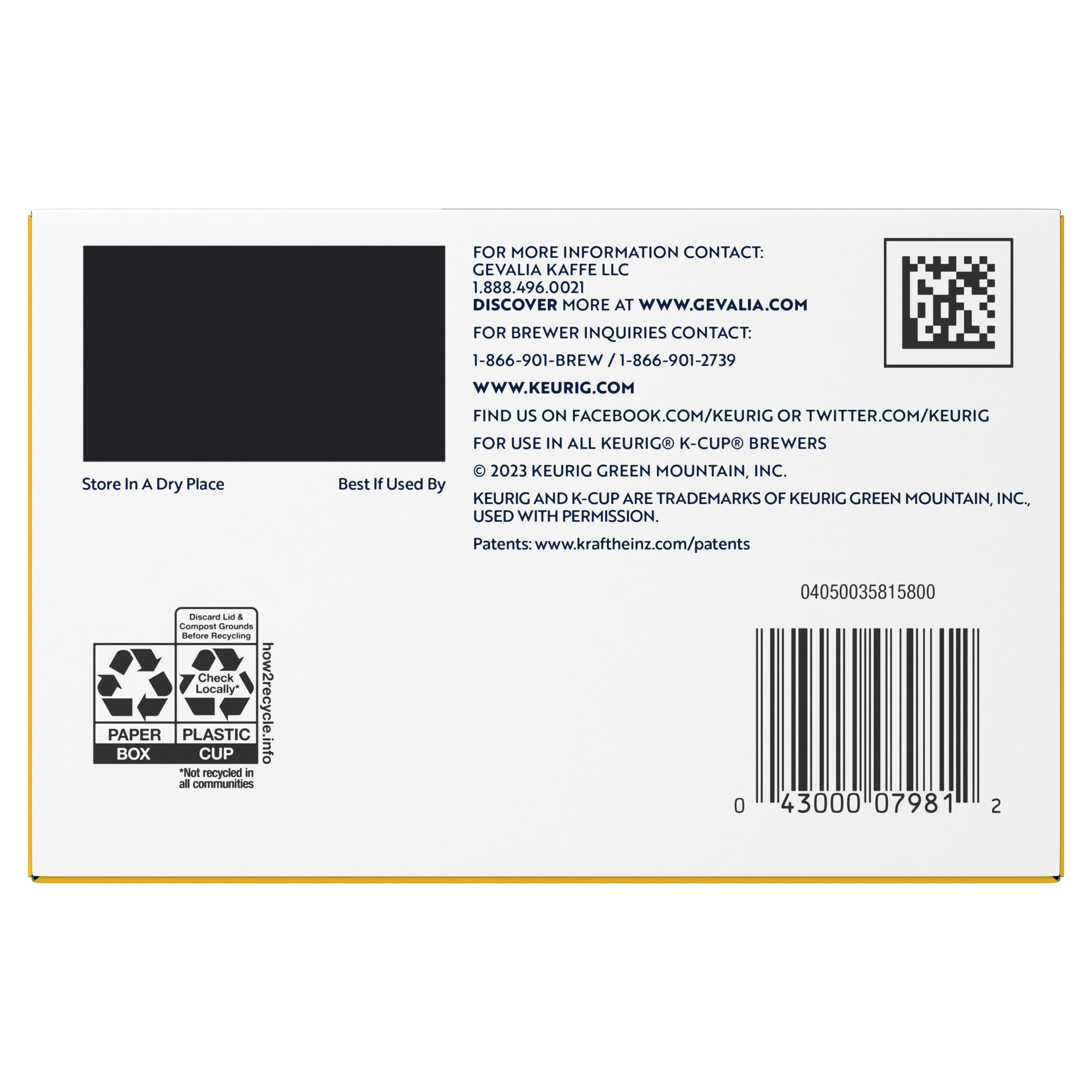 GTIN 00043000079812 Kraft Item Code (SKU) 00430000798170 Product Status Active Pack Level EACH Brand Name Gevalia Sub Brand SPECIAL RESERVE Business Unit Meat Cheese Coffee & Snacks Catalog Platform Coffee Product Category Coffee Pods Consumer Unit Size 3.46 Consumer Unit Size UOM OZ Packaging Type (Computed) Box Packaging Type Code BOX/CARTON Packaging Type Code Override (Manual) BOX Sub Units Per Item 1 Variant Costa Rica Global Product Classification Coffee/Coffee Substitutes - Beans/Ground Global Product Classification Code 10008179 Parent Reference 10043000079819 Quality Statement Best If Used By Storage Instructions Store In A Dry Place Customer Guarantee 90 Temperature Classification Ambient Prevailing Conditions Temperature Classification Code 01 Net Weight 0.216 Gross Weight 0.343 Weight UOM LB Height (in) 3.78 Length/Depth (in) 5.787 Width (in) 3.78 Case Cube 0.048 Parent Relation CASE_10043000079819 Parent Kraft Item Code (SKU) 00430000798100 Product Title Gevalia Special Reserve Costa Rica Single Origin Medium-Dark Roast K-Cup® Coffee Pods, 10 ct. Box eCommerce Product Name (Generic Name) Medium-Dark Roast K-Cup® Coffee Pods Product Benefits (Includes Seasonal + Formatting) - 10 ct box of Gevalia Costa Rica Single Origin Special Reserve K Cup Coffee Pods