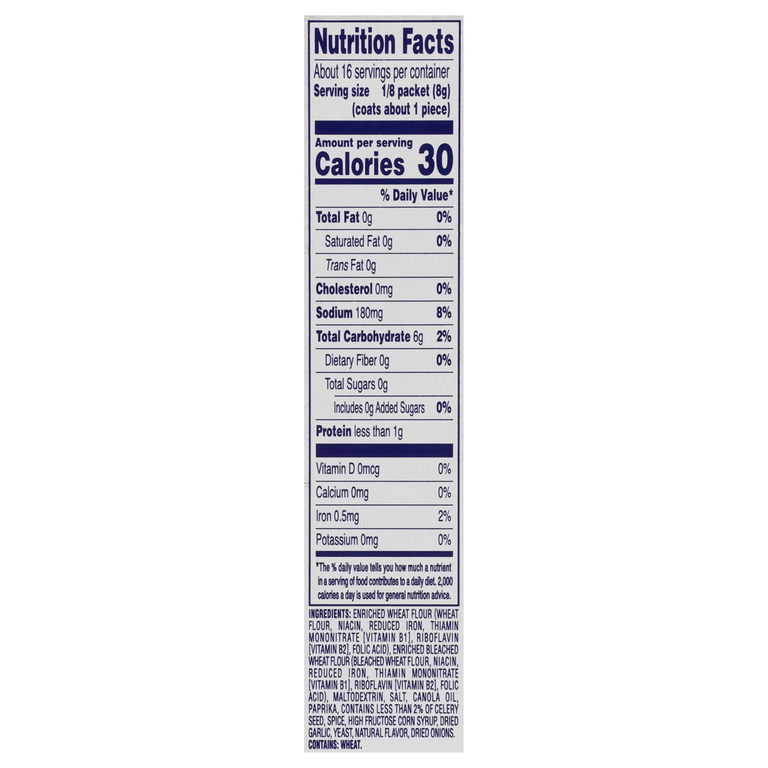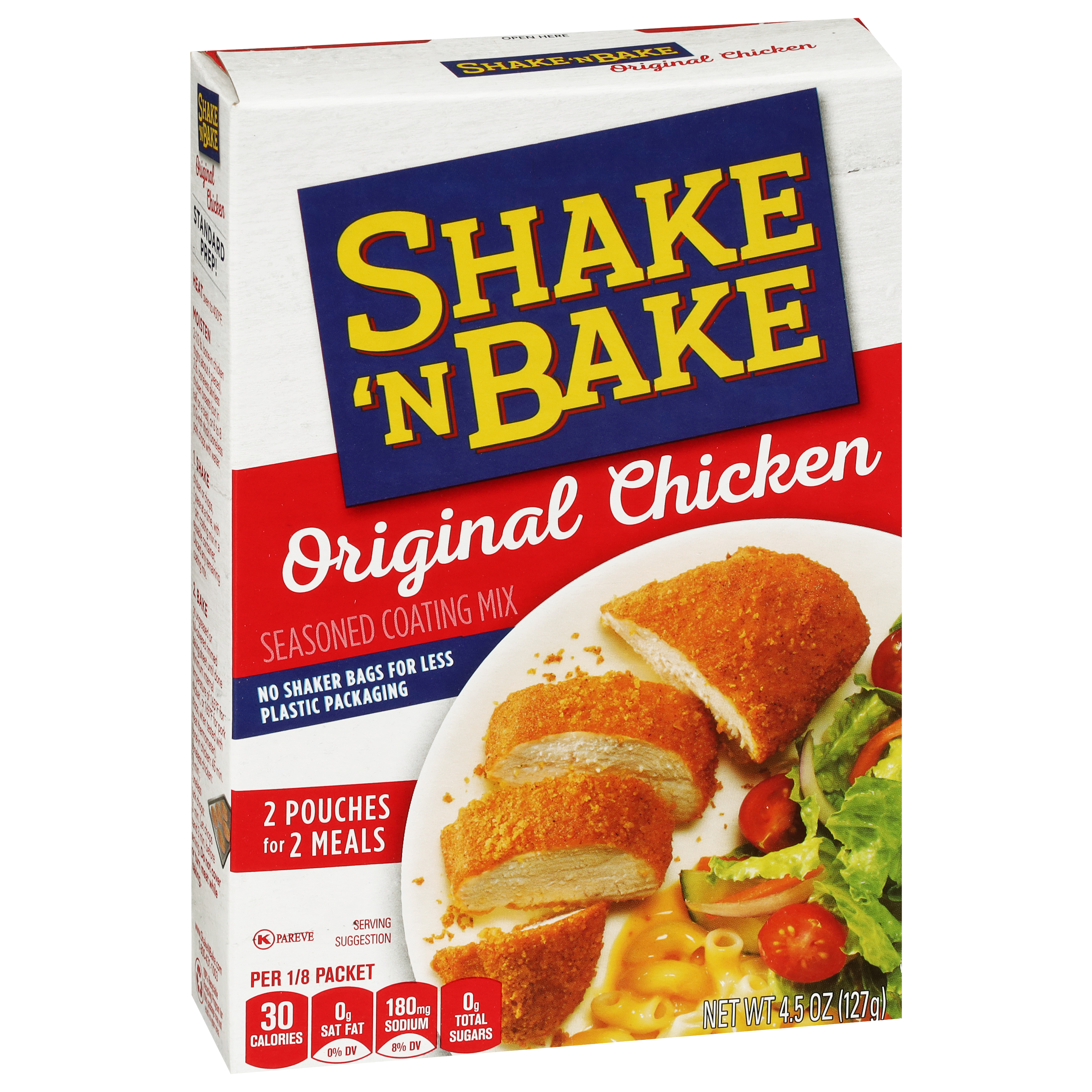 GTIN 00043000091548 Kraft Item Code (SKU) 00430000915400 Product Status Active Pack Level CASE Brand Name Shake 'N Bake Business Unit Elevation Catalog Platform Taste Elevation Product Category Coatings Consumer Unit Size 4.5 Consumer Unit Size UOM OZ Packaging Type (Computed) Box Packaging Type Code BOX/CARTON Sub Units Per Item 10 Variant Original Chicken Global Product Classification Code 10000156 Computed Exports - Ingredients ENRICHED WHEAT FLOUR (WHEAT FLOUR, NIACIN, REDUCED IRON, THIAMIN MONONITRATE [VITAMIN B1], RIBOFLAVIN [VITAMIN B2], FOLIC ACID), ENRICHED BLEACHED WHEAT FLOUR (BLEACHED WHEAT FLOUR, NIACIN, REDUCED IRON, THIAMIN MONONITRATE [VITAMIN B1], RIBOFLAVIN [VITAMIN B2], FOLIC ACID), MALTODEXTRIN, SALT, CANOLA OIL, PAPRIKA, CONTAINS LESS THAN 2% OF CELERY SEED, SPICE, HIGH FRUCTOSE CORN SYRUP, DRIED GARLIC, YEAST, NATURAL FLAVOR, DRIED ONIONS. Parent Reference 20043000091542 Child Reference 00043000057889 Customer Guarantee 180 Temperature Classification Code 09 Net Weight 2.812 Gross Weight 4.13 Weight UOM LB Height (in) 7.5 Length/Depth (in) 10 Width (in) 7.875 Case Cube 0.342 Child Relation EACH_00043000057889 Parent Relation PALLET_20043000091542 Cases per Tier 24 Tiers per Pallet 6 Cases per Pallet 144 Pallet Stack Limit 2 Product Title Shake 'N Bake Original Chicken Seasoned Coating Mix, 10 ct Case Product Description Shake 'N Bake Original Chicken Seasoned Coating Mix, 10 ct Case