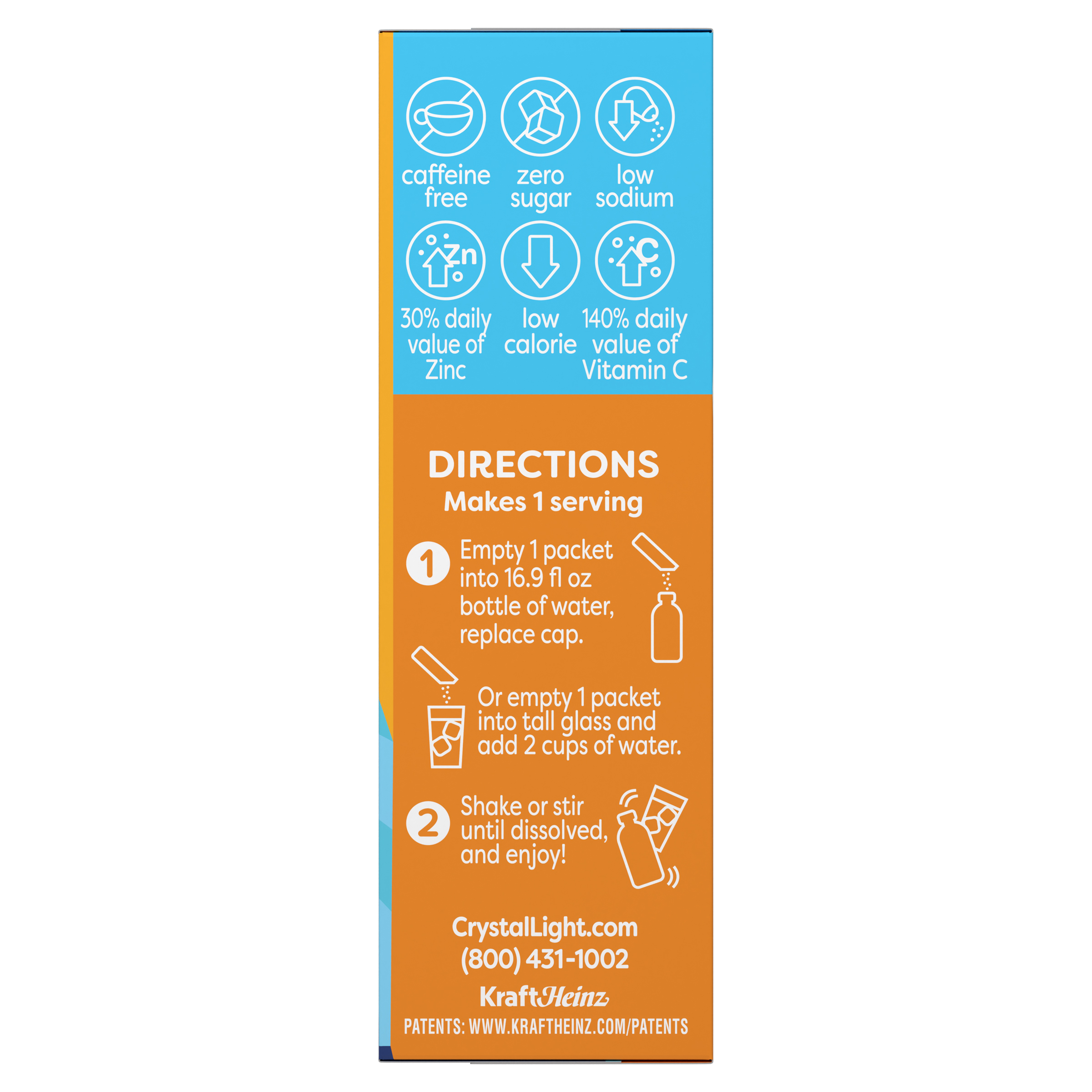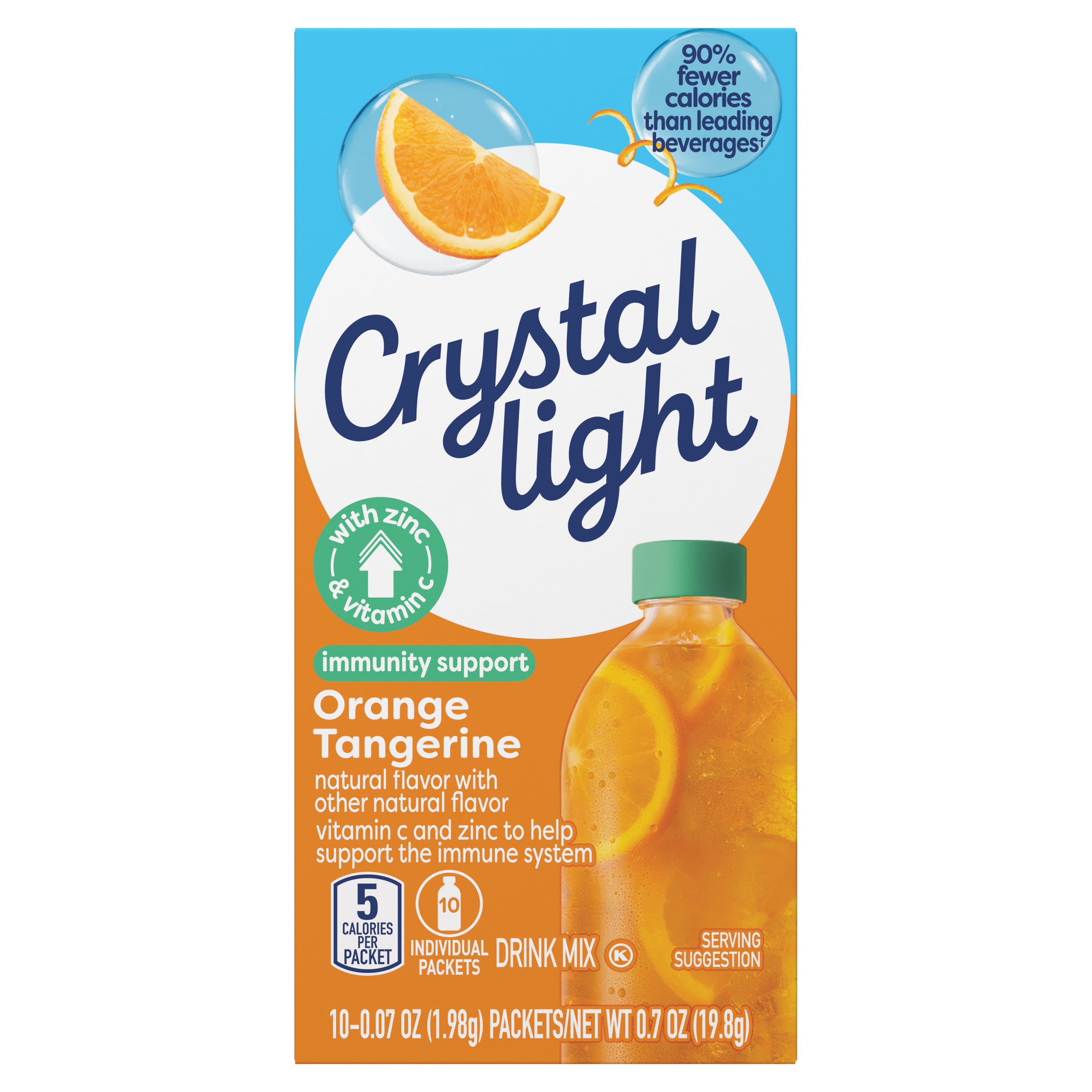 Product Description Rise and shine with a refreshing beverage infused with zinc and vitamin C to help support your immune system. Crystal Light Immunity Support Orange Tangerine Powdered Drink Mix contains 30% daily value of zinc and 140% daily value of vitamin C. Our powdered drink mix packets are caffeine free, zero sugar, low calorie and low sodium. Each .07-ounce low-calorie drink mix packet contains 90% fewer calories than leading beverages (per 16 fl oz beverage, this product is 5 calories; leading beverages are 130 calories). To prepare, pour one orange tangerine packet into a water bottle or tall glass of water, shake or stir until dissolved, and enjoy. Enjoy a boost of zinc and vitamin C at home or work, or bring our single-serving packets on the go for a refreshing citrus beverage wherever the day takes you. Crystal Light lets you enjoy fruity refreshment from morning to night. Start your day with our Immunity Support, recharge with Energy Boost and relax with Mixology.