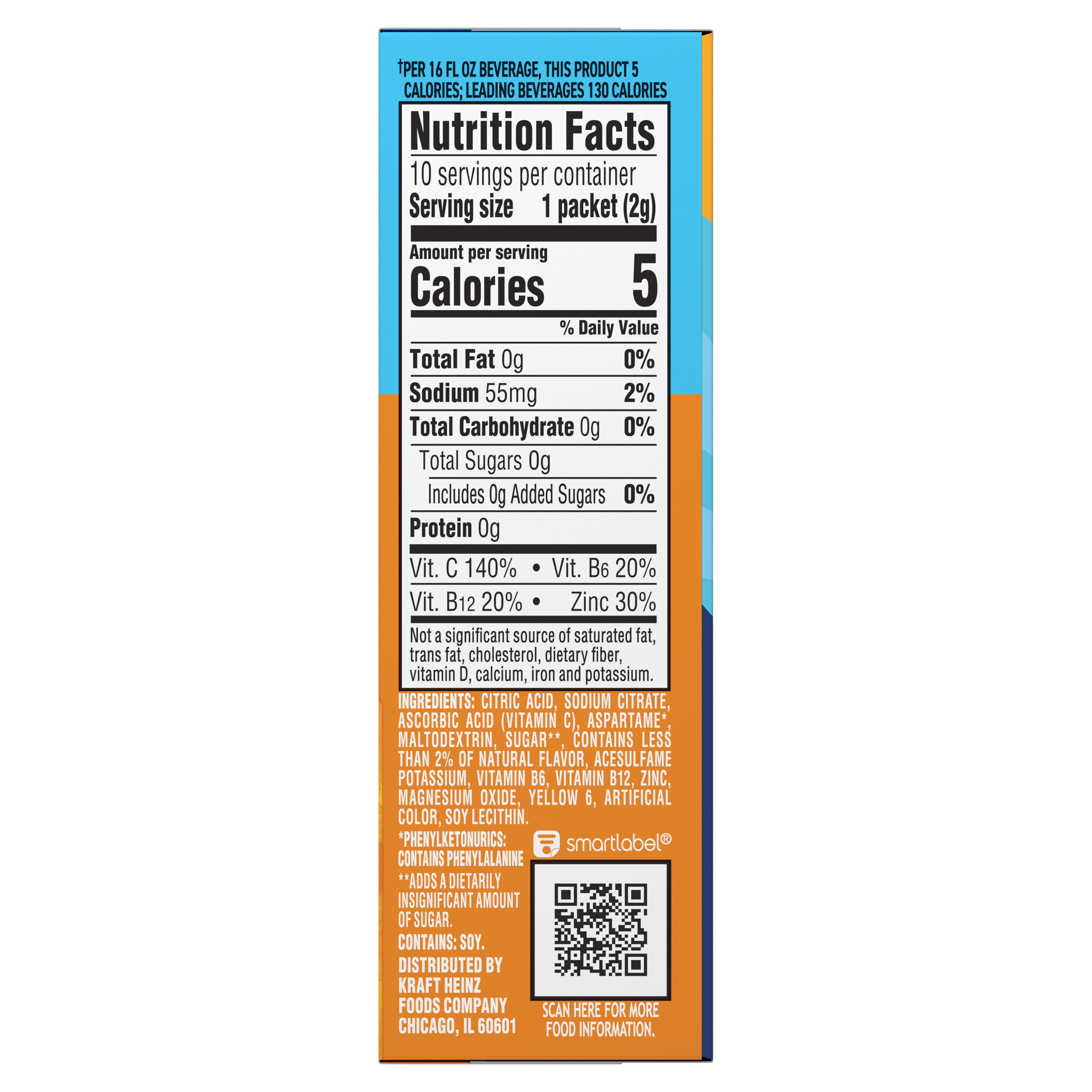 - Each drink mix packet contains 90% fewer calories than leading beverages (per 16 fl oz beverage, this product is 5 calories; leading beverages are 130 calories)