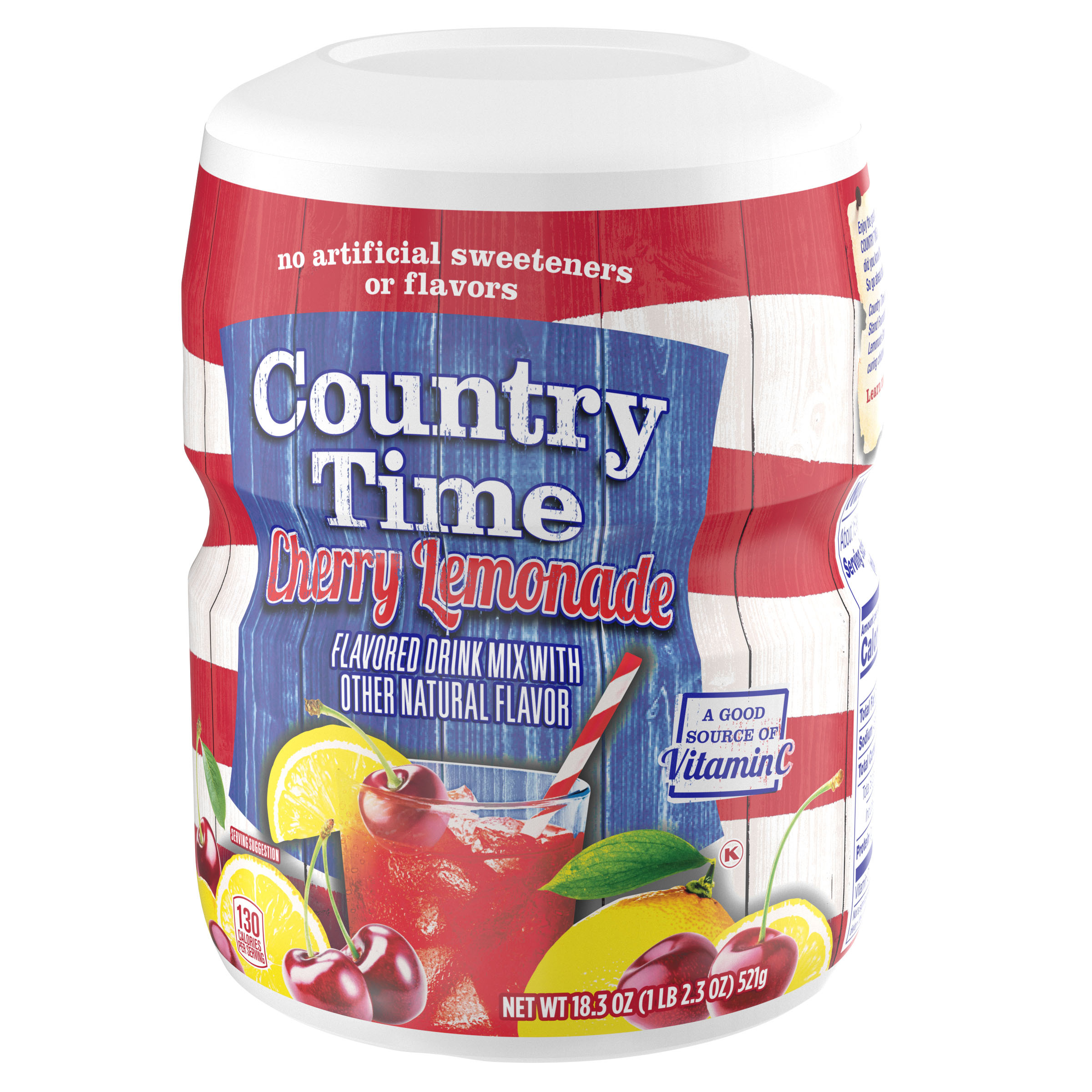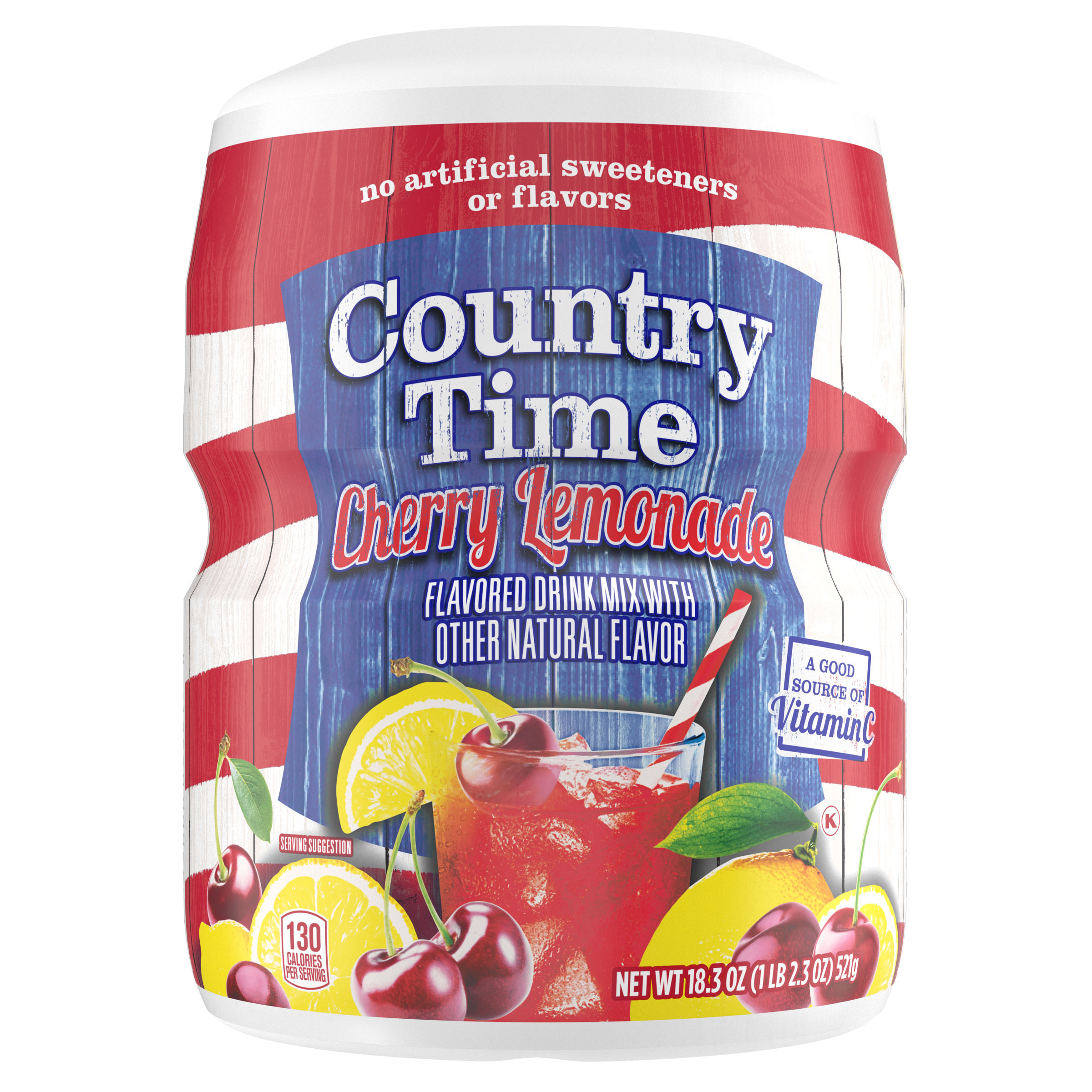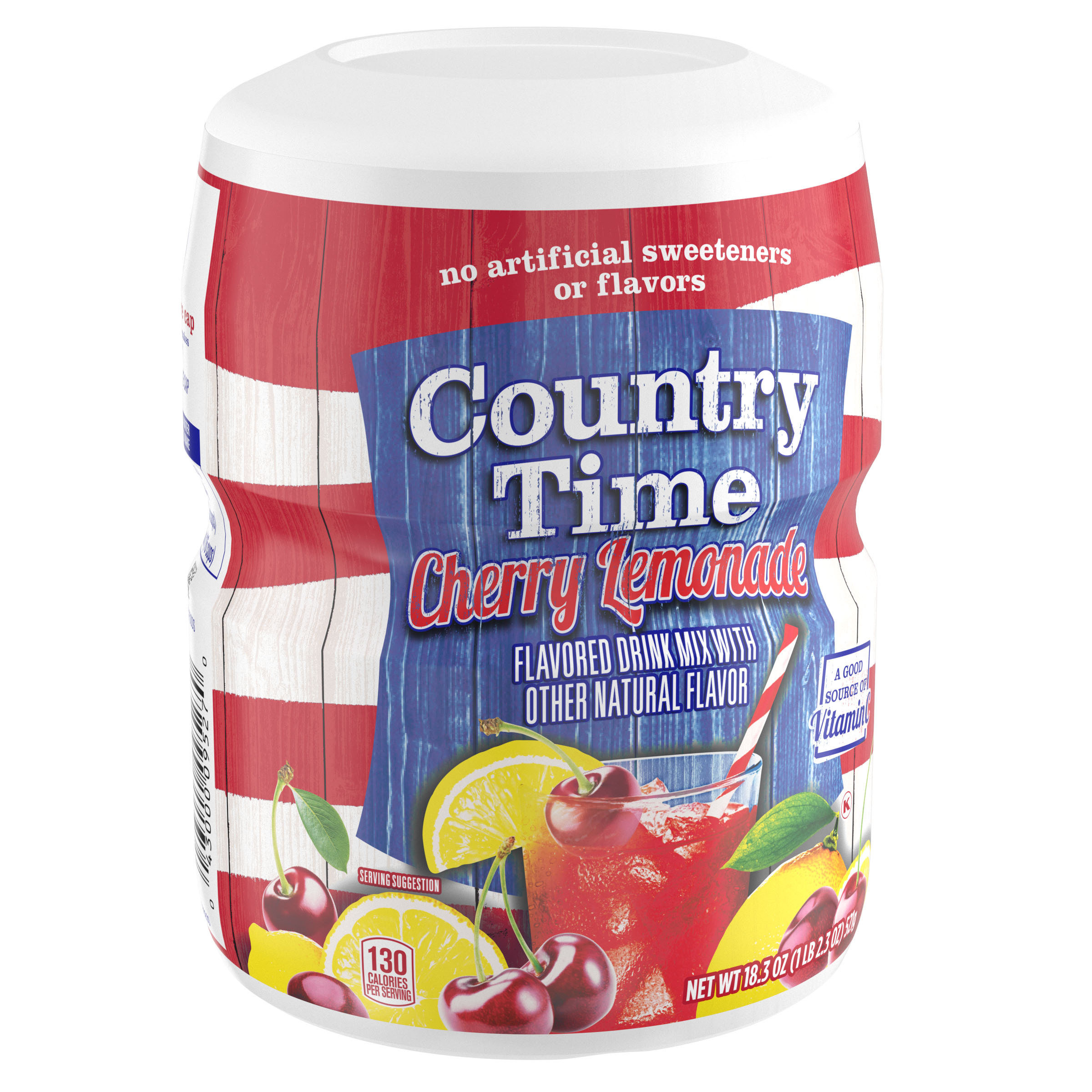 Product Description A bold and fruity twist on classic lemonade, naturally flavored Country Time Cherry Lemonade Powdered Drink Mix combines the great taste of summer and old-fashioned lemonade in our satisfying refreshment. A good source of vitamin C, made with real sugar and no artificial flavors or sweeteners, Country Time’s powdered lemonade mix is the perfect choice to help keep you cool on warm days. A classic since 1976, Country Time Lemonade has established itself as a beverage staple in homes nationwide. Whether you're offering cups at your child’s first lemonade stand or sharing a cold glass of lemonade with a friend on a sunny day, our cherry lemonade powder mix is the go-to option for making lasting memories with those you love. Great with grilled fare such as burgers and hot dogs, or as a tasty refreshment at your next picnic in the park, Country Time's sweet and tart flavor makes every occasion delicious. Our kosher cherry lemonade powder comes in a resealable canister to keep the product fresh and comes with an easy-measure lid for simple preparation. Each 18.3 oz canister makes about 15 servings of cherry lemonade, so there is enough drink mix for the whole family to enjoy! To prepare, simply pour our powder drink mix into a plastic or glass pitcher, add water and ice, stir and serve. Enjoy the great taste of summer, any time of year, with Country Time!