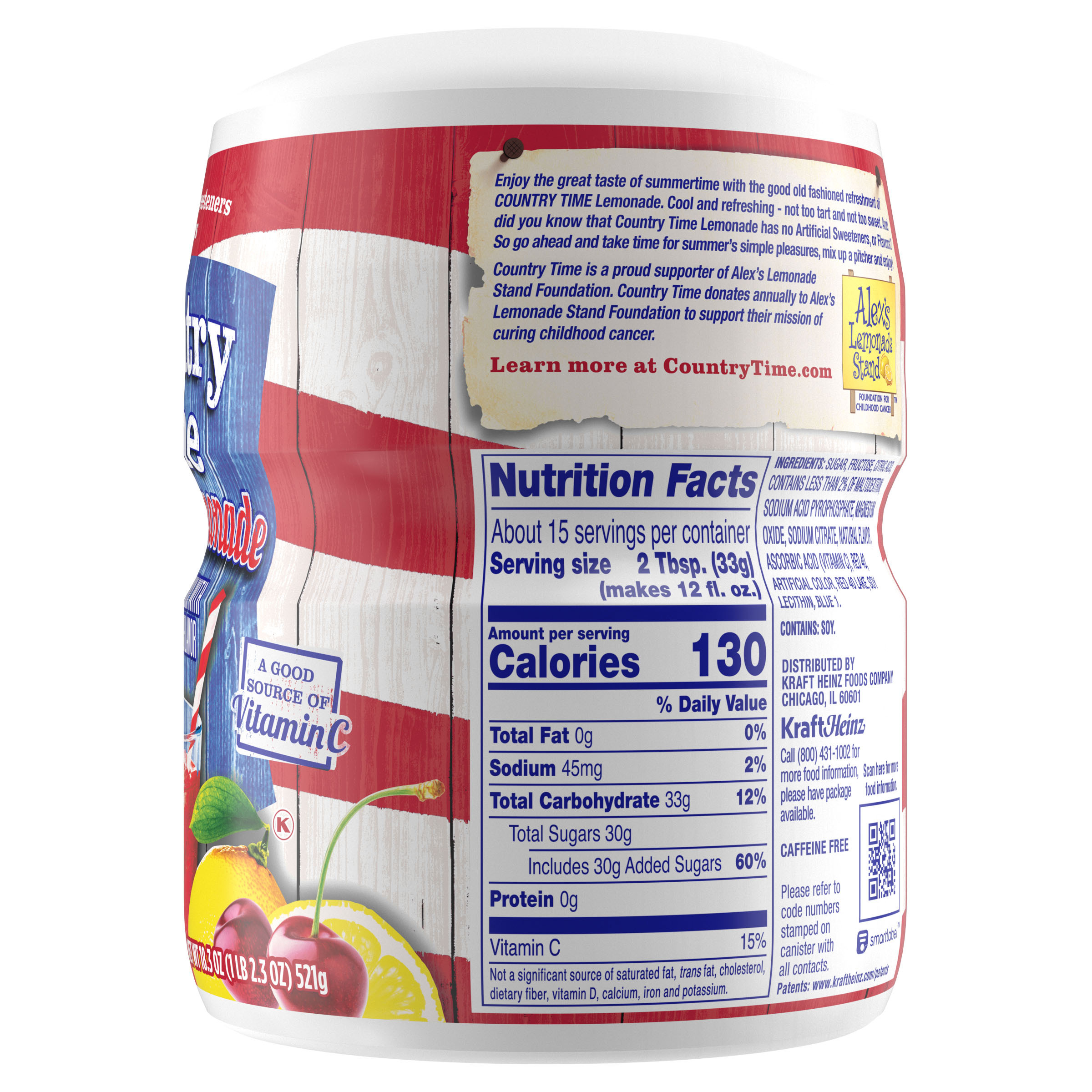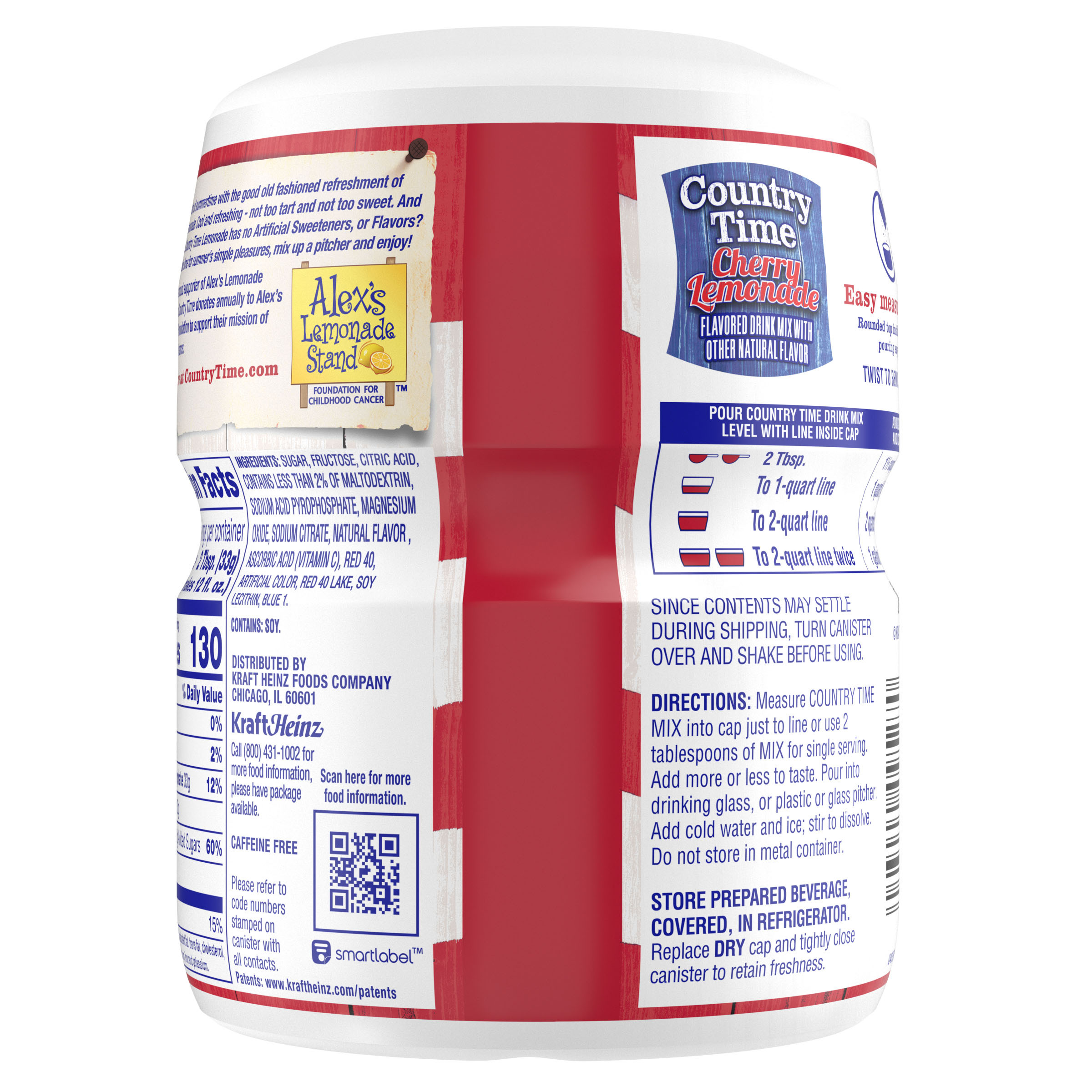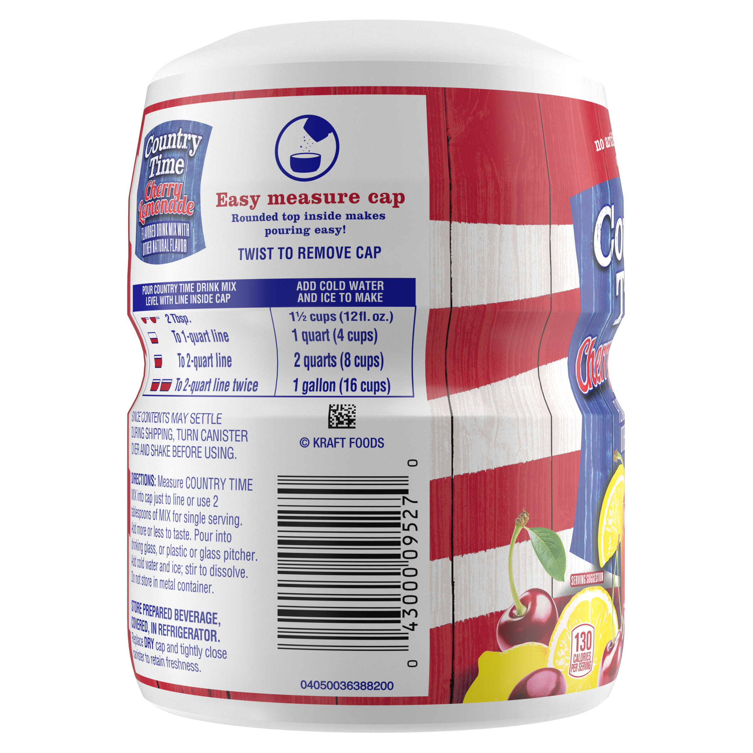 Product Description A bold and fruity twist on classic lemonade, naturally flavored Country Time Cherry Lemonade Powdered Drink Mix combines the great taste of summer and old-fashioned lemonade in our satisfying refreshment. A good source of vitamin C, made with real sugar and no artificial flavors or sweeteners, Country Time’s powdered lemonade mix is the perfect choice to help keep you cool on warm days. A classic since 1976, Country Time Lemonade has established itself as a beverage staple in homes nationwide. Whether you're offering cups at your child’s first lemonade stand or sharing a cold glass of lemonade with a friend on a sunny day, our cherry lemonade powder mix is the go-to option for making lasting memories with those you love. Great with grilled fare such as burgers and hot dogs, or as a tasty refreshment at your next picnic in the park, Country Time's sweet and tart flavor makes every occasion delicious. Our kosher cherry lemonade powder comes in a resealable canister to keep the product fresh and comes with an easy-measure lid for simple preparation. Each 18.3 oz canister makes about 15 servings of cherry lemonade, so there is enough drink mix for the whole family to enjoy! To prepare, simply pour our powder drink mix into a plastic or glass pitcher, add water and ice, stir and serve. Enjoy the great taste of summer, any time of year, with Country Time!
