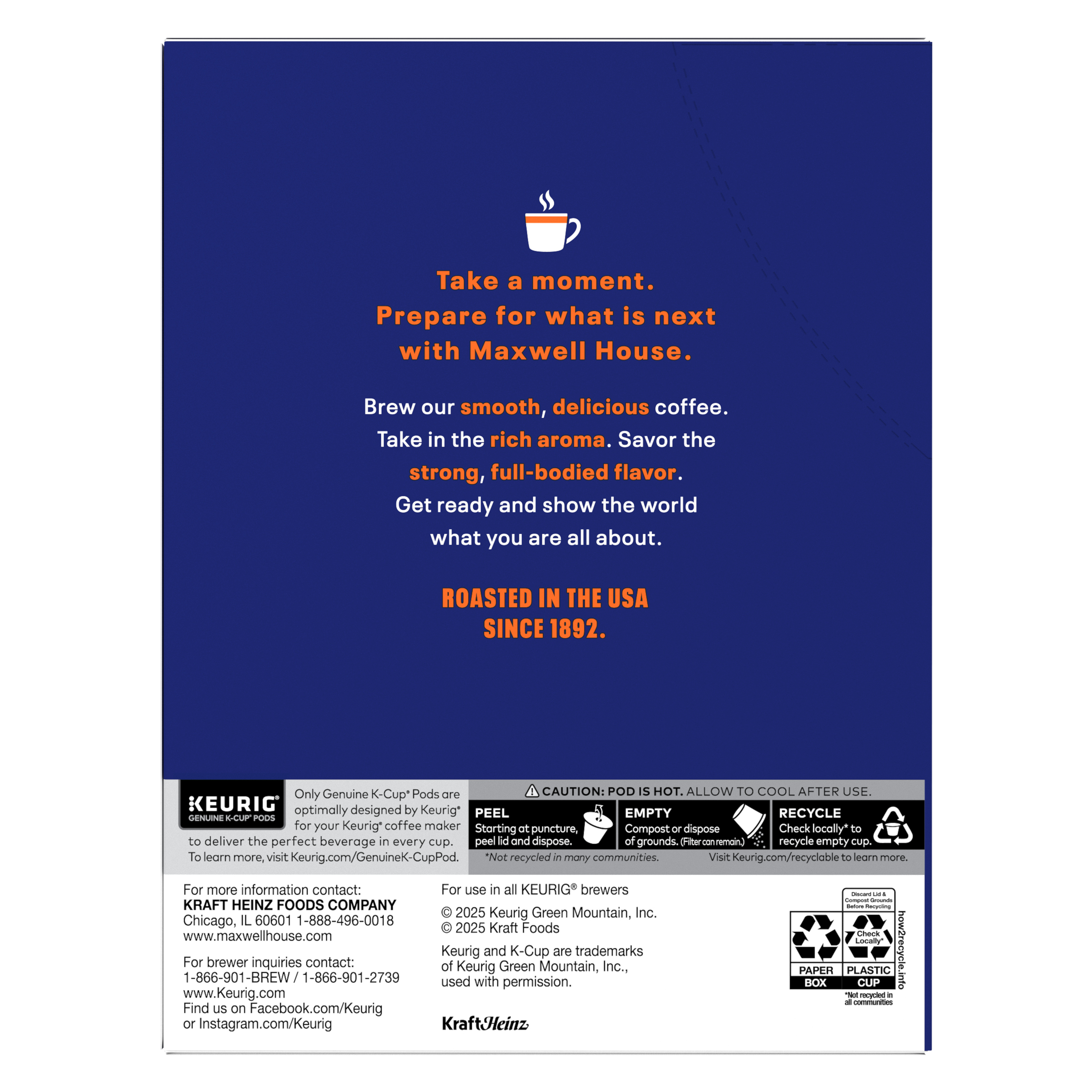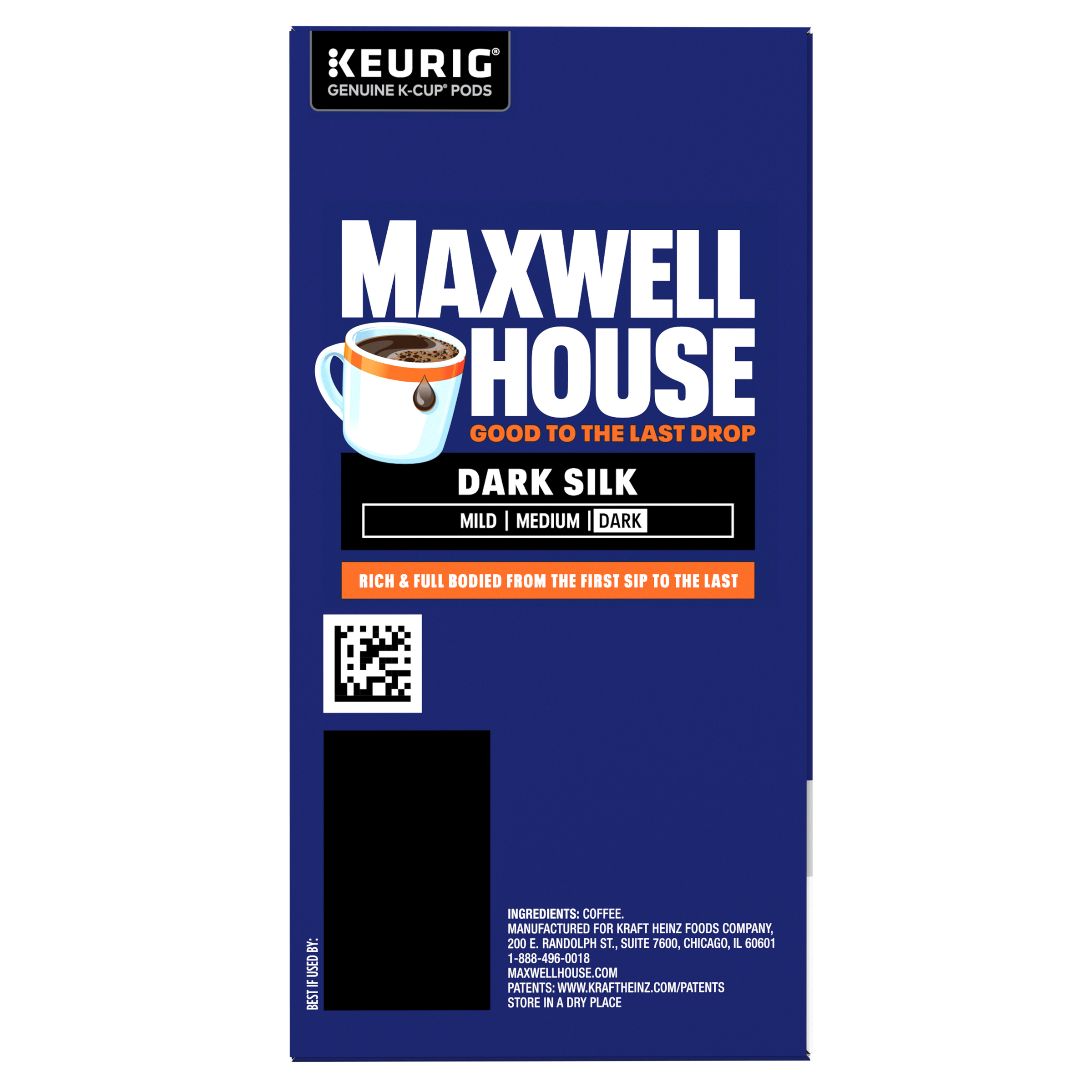 GTIN 00043000095508 Kraft Item Code (SKU) 00430000955070 Product Status Active Pack Level EACH Brand Name Maxwell House Business Unit Meat Cheese Coffee & Snacks Catalog Platform Coffee Product Category Coffee Pods Consumer Unit Size 6.8 Consumer Unit Size UOM OZ Packaging Type (Computed) Box Packaging Type Code BOX/CARTON Sub Units Per Item 1 Variant Dark Silk Sub Variant Dark Roast Global Product Classification Code 10008179 Computed Exports - Ingredients COFFEE. Parent Reference 10043000095505 Quality Statement Best If Used By Storage Instructions Store In A Dry Place Customer Guarantee 90 Temperature Classification Code 01 Net Weight 0.425 Gross Weight 0.696 Weight UOM LB Height (in) 7.4 Length/Depth (in) 3.74 Width (in) 5.6 Case Cube 0.09 Parent Relation CASE_10043000095505 Parent Kraft Item Code (SKU) 00430000955000 Product Title Maxwell House Dark Silk Dark Roast Keurig K-Cup Coffee Pods, 22 ct. Box Product Description Maxwell House Dark Silk Dark Roast Keurig K-Cup Coffee Pods, 22 ct. Box