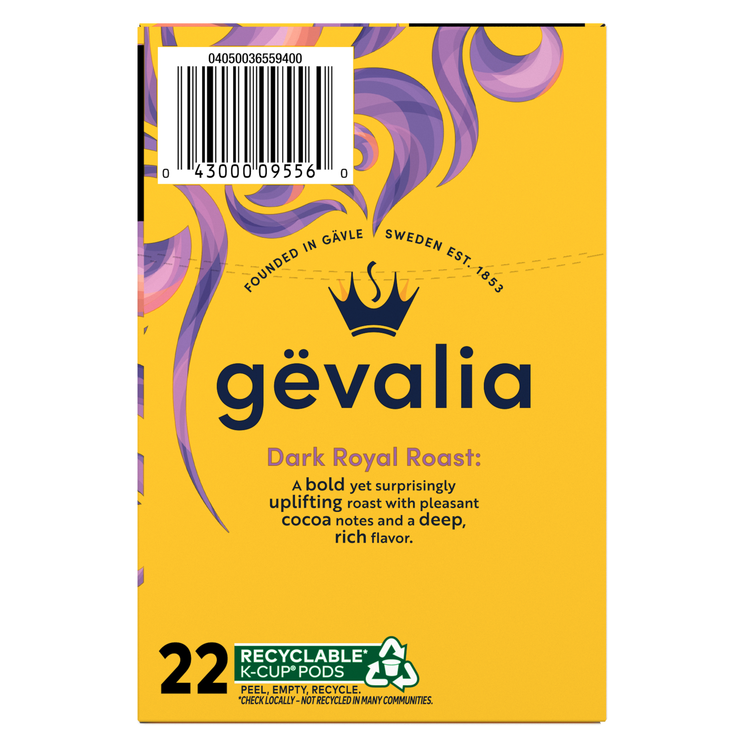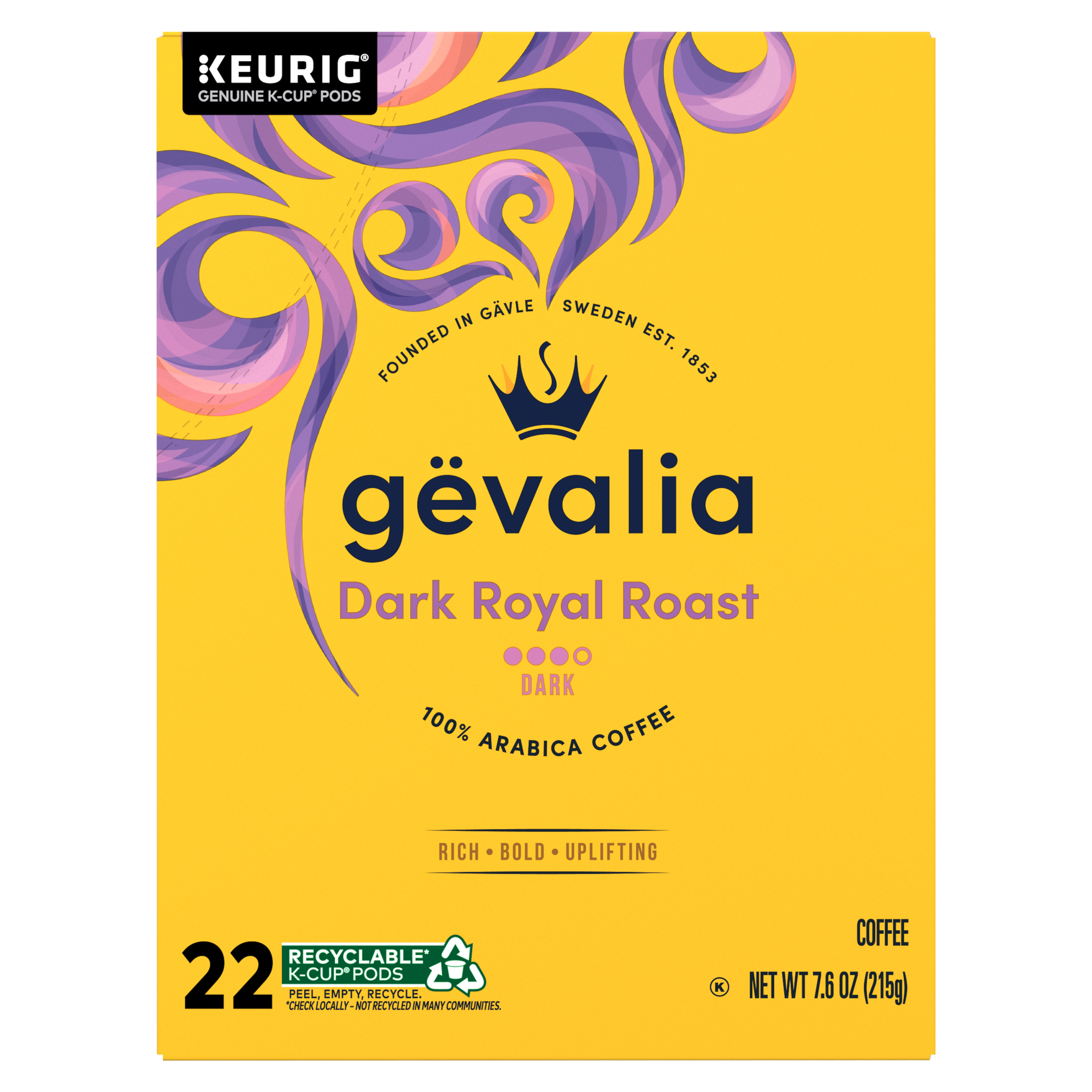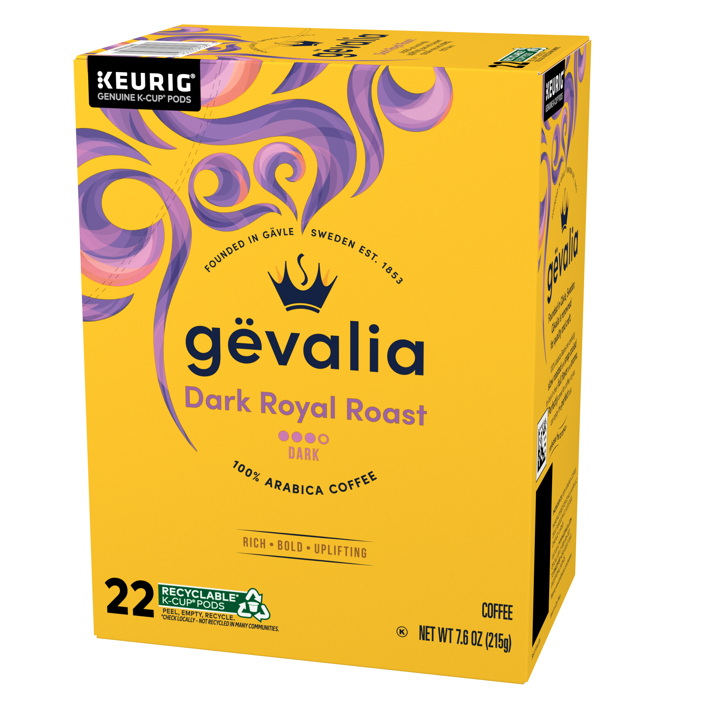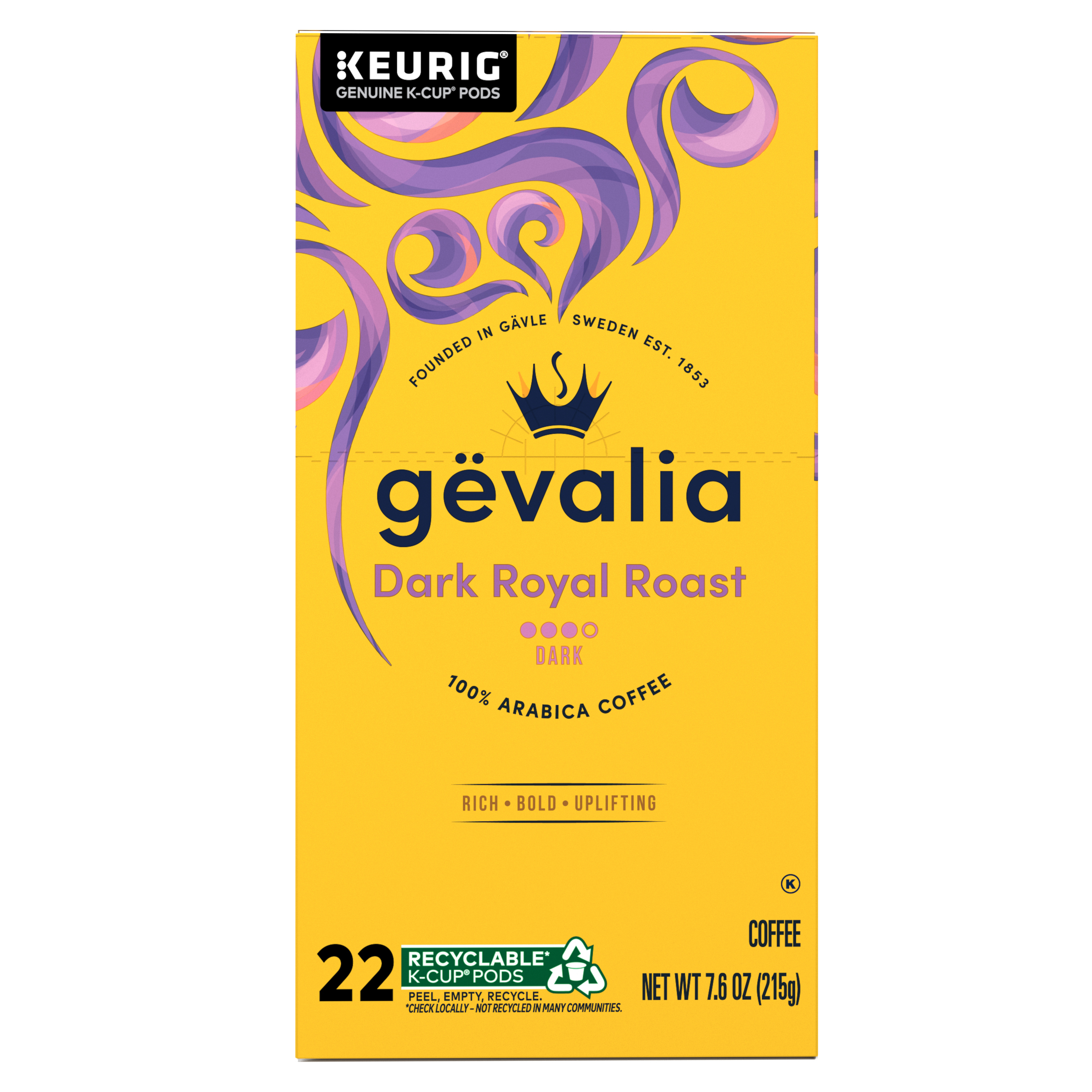 Product Description Gevalia Dark Royal Roast K-Cup® Coffee Pods fill your mug with rich-tasting dark roast coffee. Founded in Gavle, Sweden in 1853, Gevalia uses the perfect care to brew your perfect cup of coffee. Whether you're rushing to work or enjoying a leisurely breakfast at home, enjoy the rich aroma and bold, uplifting taste of our coffee to start your day with a smile. Each K-Cup® pod is made with 100% Arabica beans that are slow-roasted and snap-cooled to lock in flavor and aroma. Gevalia coffee pods are perfect for all Keurig® brewers. Our 22-count box of Dark Royal Roast coffee pods is great for those keeping Kosher. Gevalia K-Cup® coffee pods lock in flavor until you are ready to enjoy. Whether you crave a smooth morning brew or a bold afternoon pick-me-up, Gevalia offers something to suit every mood and occasion. Try Gevalia and experience the taste of over 150 years of Swedish tradition.