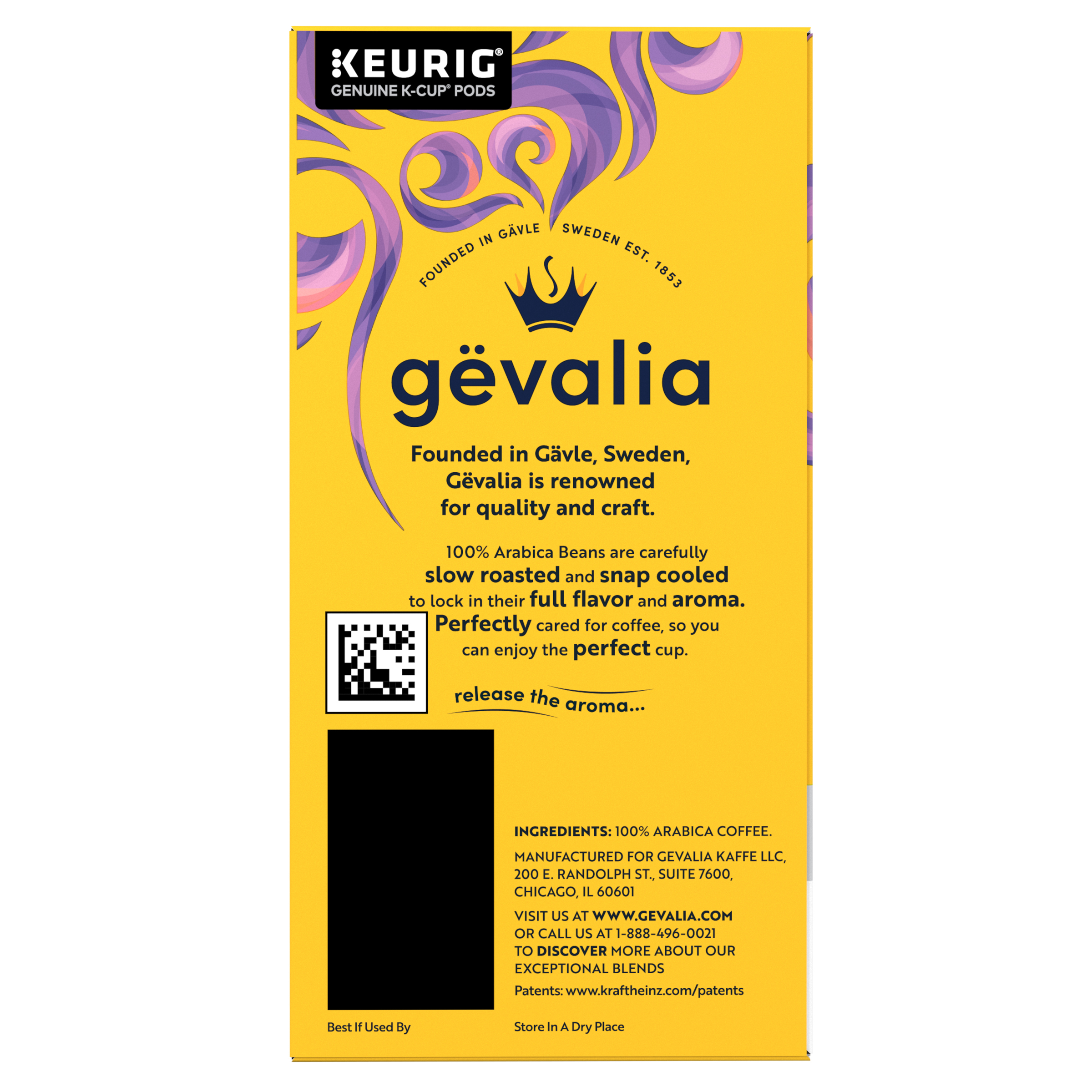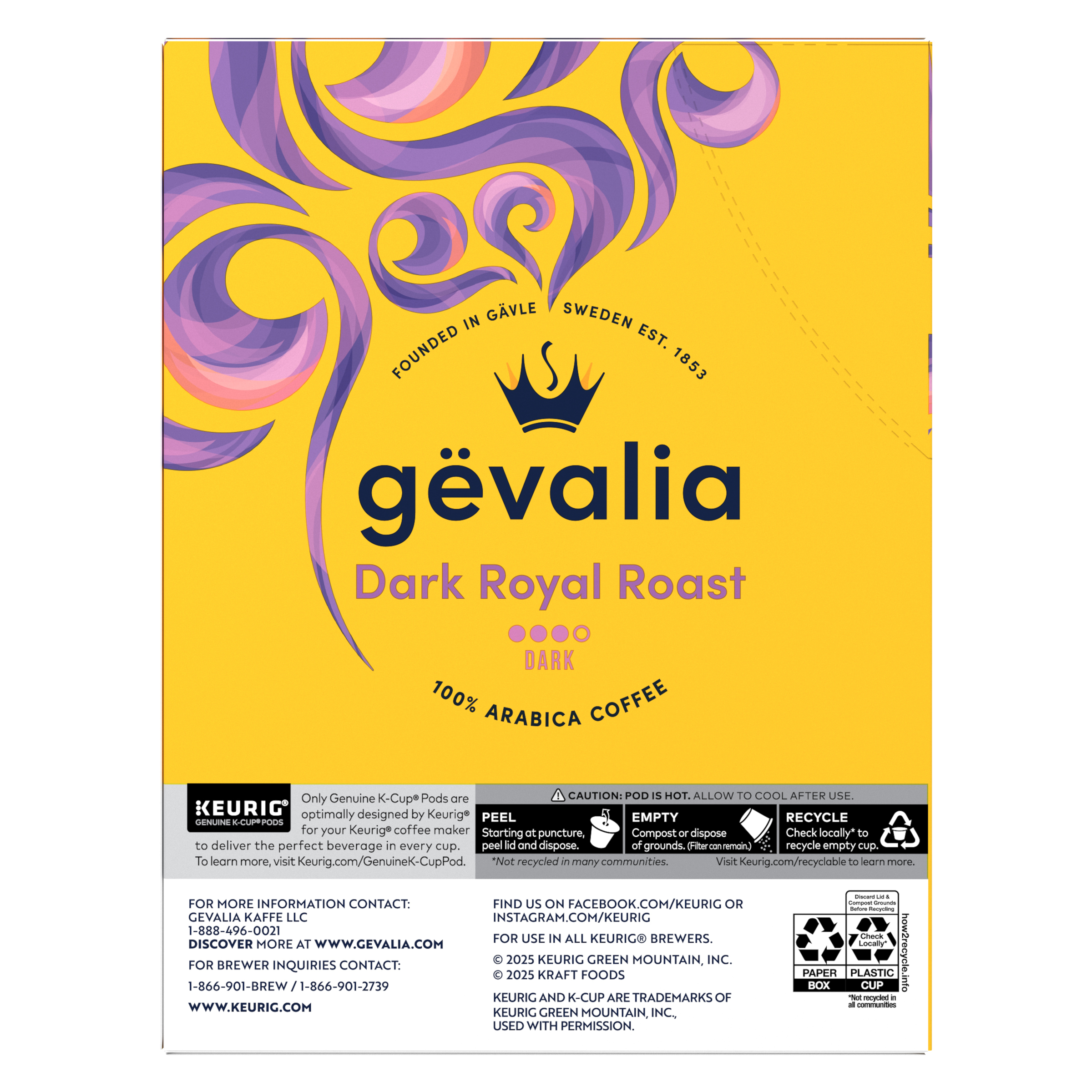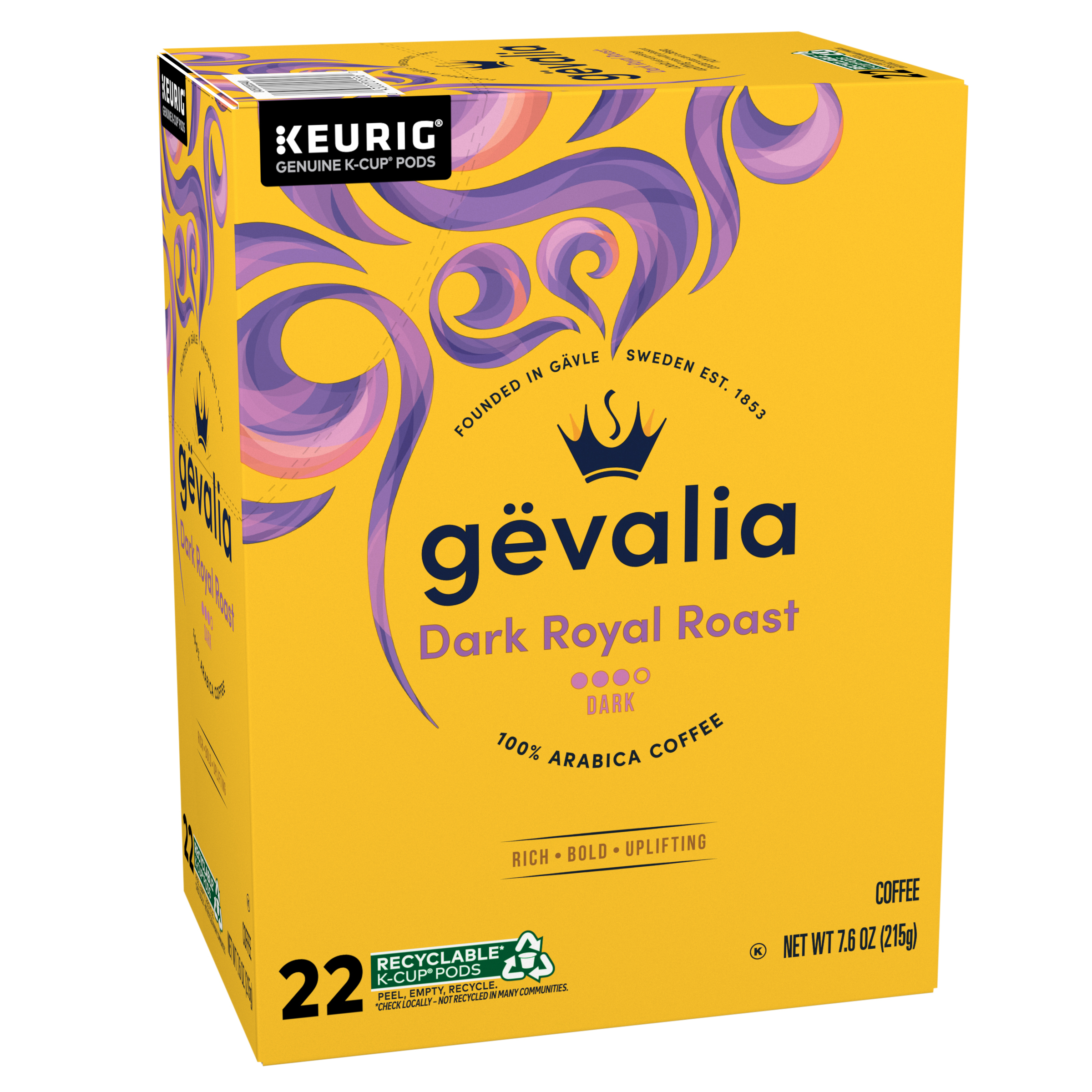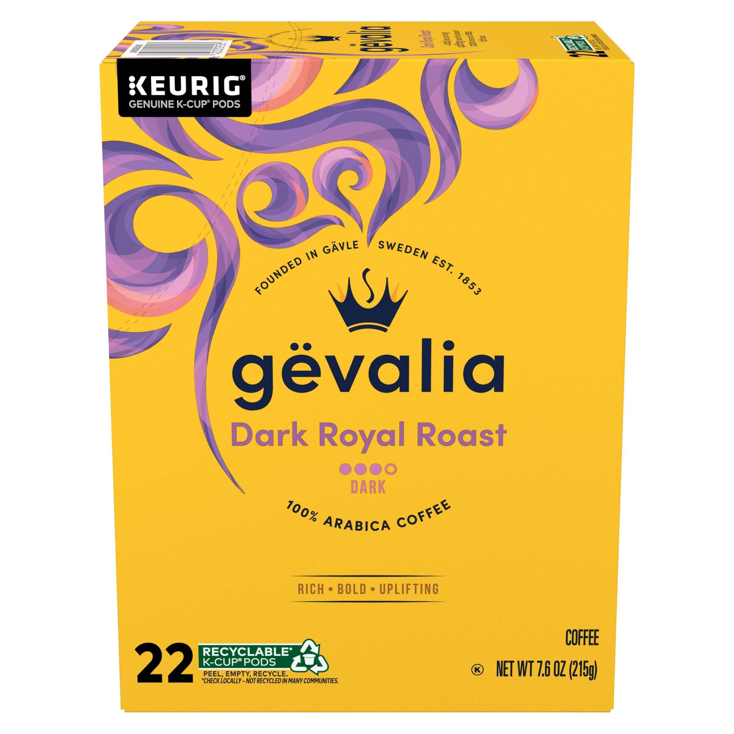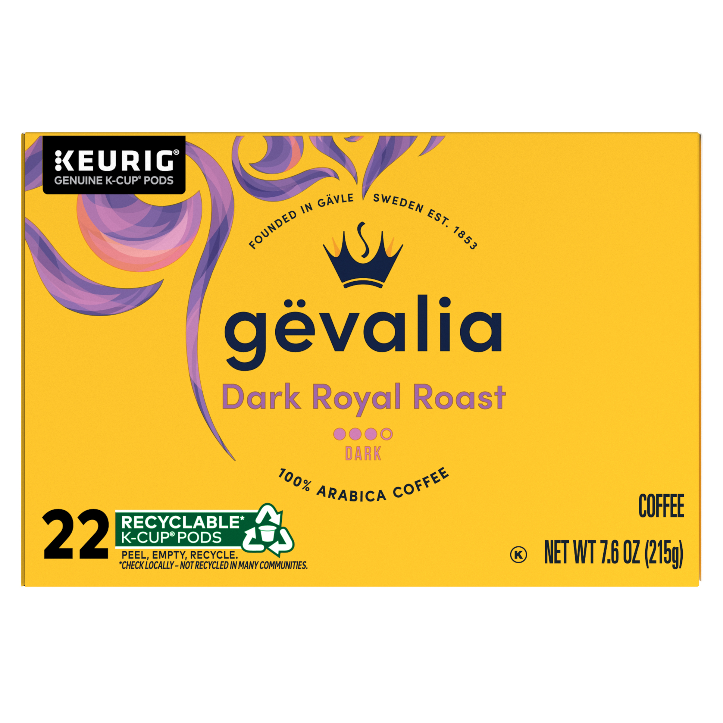 Product Description Gevalia Dark Royal Roast K-Cup® Coffee Pods fill your mug with rich-tasting dark roast coffee. Founded in Gavle, Sweden in 1853, Gevalia uses the perfect care to brew your perfect cup of coffee. Whether you're rushing to work or enjoying a leisurely breakfast at home, enjoy the rich aroma and bold, uplifting taste of our coffee to start your day with a smile. Each K-Cup® pod is made with 100% Arabica beans that are slow-roasted and snap-cooled to lock in flavor and aroma. Gevalia coffee pods are perfect for all Keurig® brewers. Our 22-count box of Dark Royal Roast coffee pods is great for those keeping Kosher. Gevalia K-Cup® coffee pods lock in flavor until you are ready to enjoy. Whether you crave a smooth morning brew or a bold afternoon pick-me-up, Gevalia offers something to suit every mood and occasion. Try Gevalia and experience the taste of over 150 years of Swedish tradition.