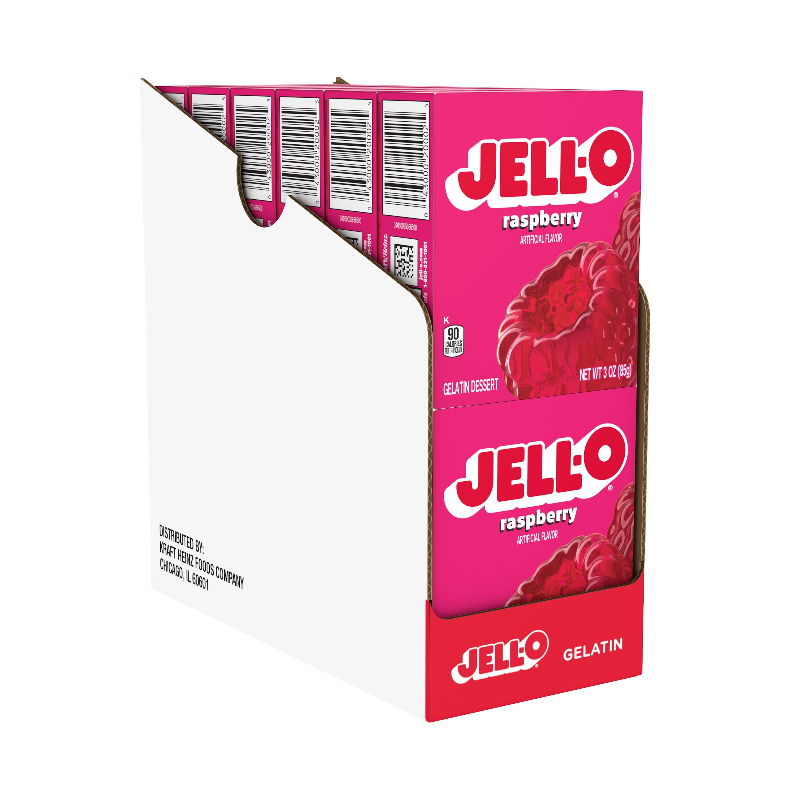 GTIN 00043000096055 Kraft Item Code (SKU) 00430000960500 Product Status Active Pack Level CASE Brand Name Jell-O Business Unit Hydration Desserts & Meals Catalog Platform Desserts Product Category Dry Package Dessert Consumer Unit Size 3 Consumer Unit Size UOM OZ Packaging Type (Computed) Box Packaging Type Code BOX/CARTON Sub Units Per Item 12 Variant Raspberry Global Product Classification Code 10000312 Computed Exports - Ingredients SUGAR, GELATIN, ADIPIC ACID, CONTAINS LESS THAN 2% OF SODIUM CITRATE, SODIUM PHOSPHATE, RED 40, FUMARIC ACID, NATURAL AND ARTIFICIAL FLAVOR. Parent Reference 20043000096059 Child Reference 00043000200025 Customer Guarantee 180 Temperature Classification Code 01 Net Weight 2.25 Gross Weight 2.67 Weight UOM LB Height (in) 3.125 Length/Depth (in) 7.188 Width (in) 6.75 Case Cube 0.088 Child Relation EACH_00043000200025 Parent Relation PALLET_20043000096059 Cases per Tier 35 Tiers per Pallet 13 Cases per Pallet 455 Pallet Stack Limit 2 Product Title Jell-O Raspberry Artificially Flavored Gelatin Dessert Mix, 12 ct Case Product Description Jell-O Raspberry Artificially Flavored Gelatin Dessert Mix, 12 ct Case