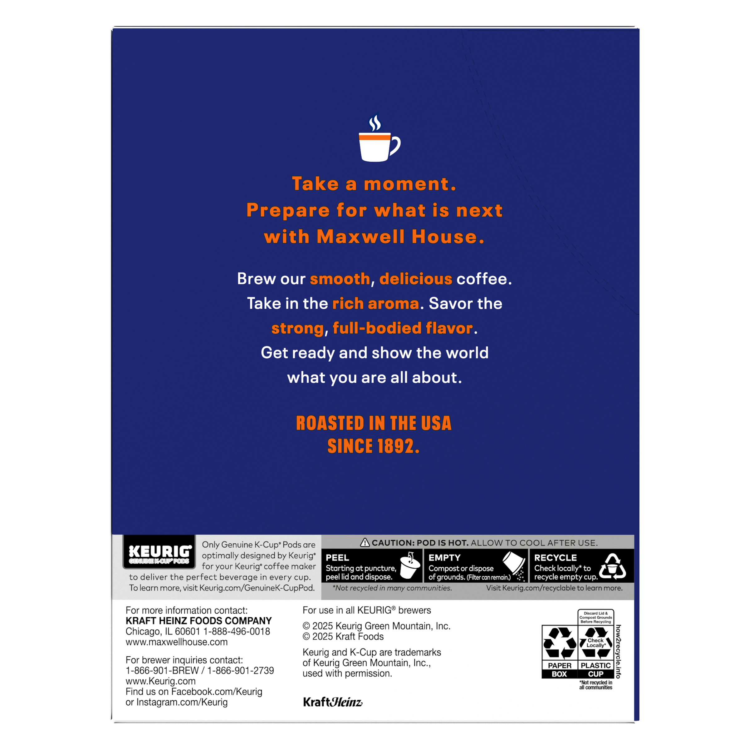 GTIN 00043000096499 Kraft Item Code (SKU) 00430000964970 Product Status Active Pack Level EACH Brand Name Maxwell House Business Unit Meat Cheese Coffee & Snacks Catalog Platform Coffee Product Category Coffee Pods Consumer Unit Size 6.8 Consumer Unit Size UOM OZ Packaging Type (Computed) Box Packaging Type Code BOX/CARTON Sub Units Per Item 1 Variant Smooth Bold Sub Variant Bold Global Product Classification Code 10008179 Computed Exports - Ingredients 100% ARABICA COFFEE. Parent Reference 10043000096496 Quality Statement Best If Used By Storage Instructions Store In A Dry Place Customer Guarantee 90 Temperature Classification Code 01 Net Weight 0.425 Gross Weight 0.696 Weight UOM LB Height (in) 7.4 Length/Depth (in) 3.74 Width (in) 5.6 Case Cube 0.09 Parent Relation CASE_10043000096496 Parent Kraft Item Code (SKU) 00430000964900 Product Title Maxwell House Smooth Bold Roast K-Cup® Coffee Pods, 22 ct. Box Product Description Maxwell House Smooth Bold Roast K-Cup® Coffee Pods, 22 ct. Box