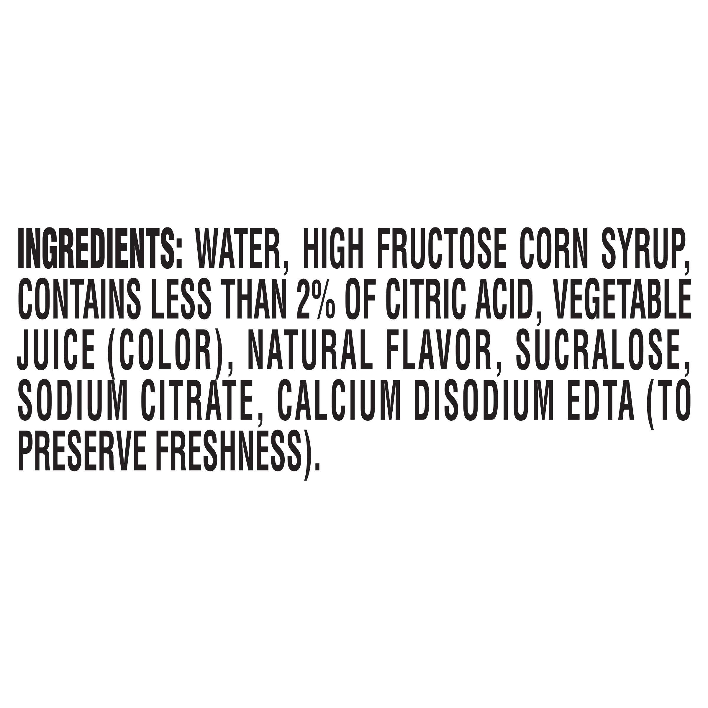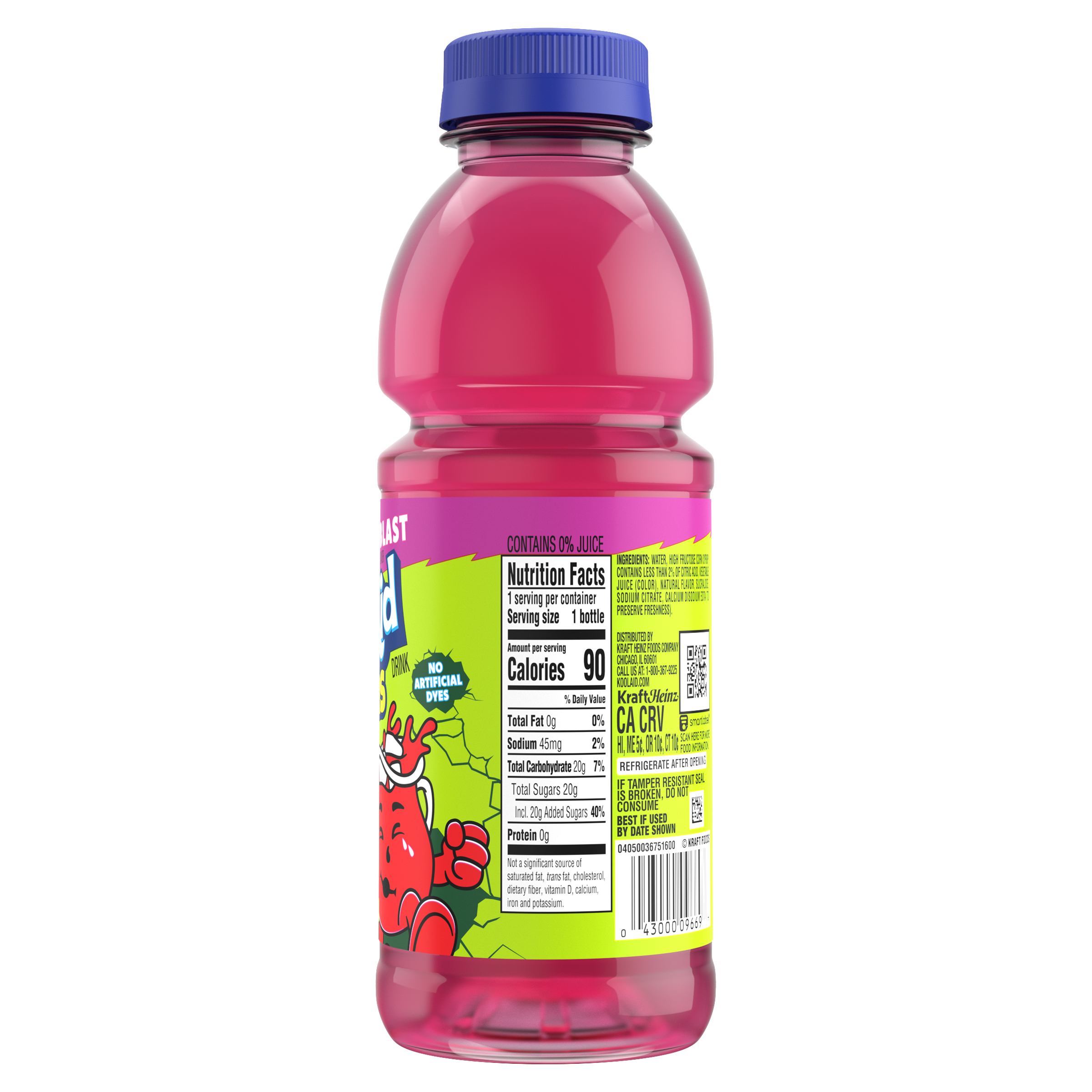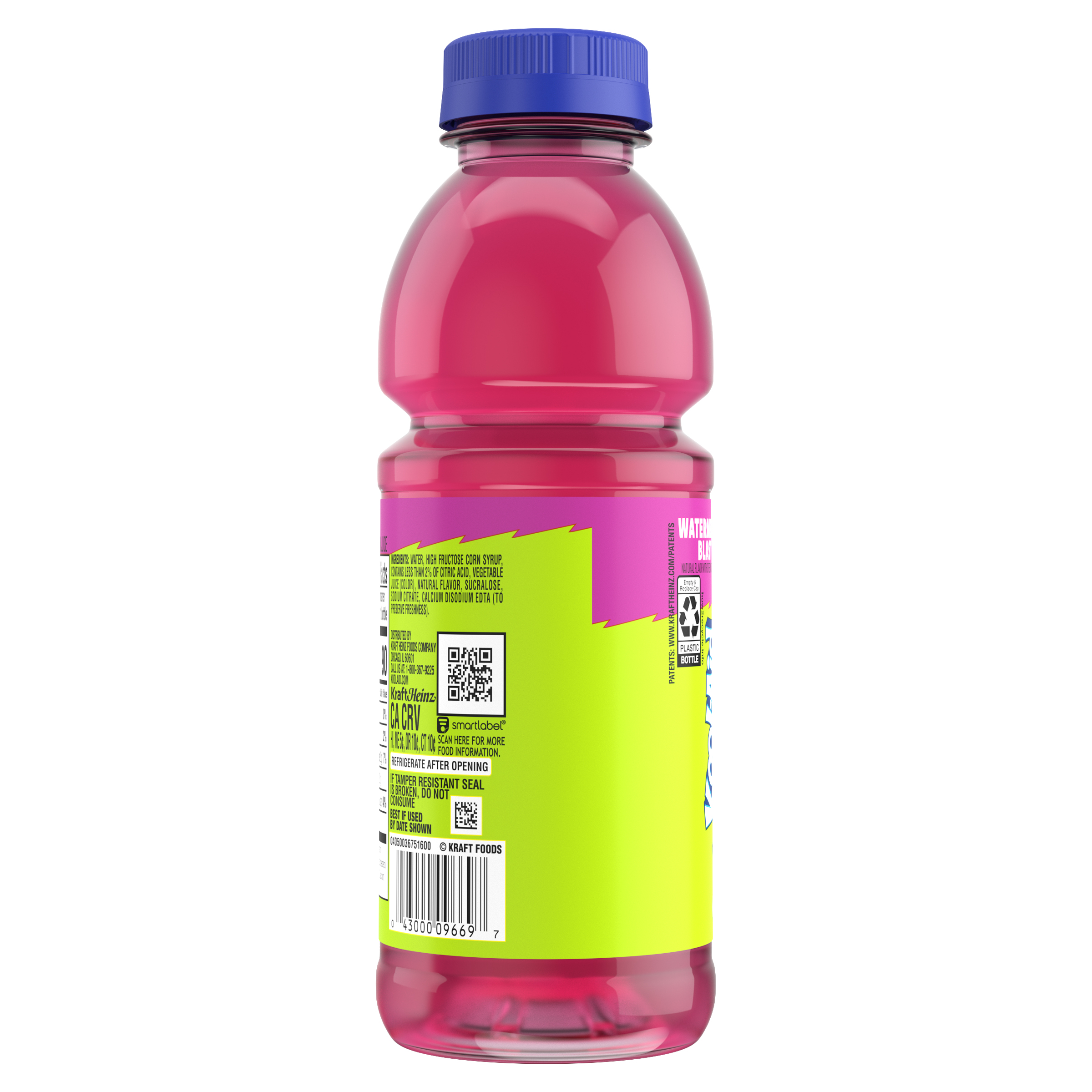 GTIN 00043000096697 Kraft Item Code (SKU) 00430000966970 Product Status Active Pack Level EACH Brand Name Kool-Aid Business Unit Hydration Desserts & Meals Catalog Platform Hydration Product Category Ready To Drink Bottle Consumer Unit Size 16 Consumer Unit Size UOM FO Packaging Type (Computed) Bottle Packaging Type Code BOTTLE Packaging Type Code Override (Manual) BOTTLE Sub Units Per Item 1 Variant Watermelon Sub Variant Sour Global Product Classification Code 10000201 Computed Exports - Ingredients WATER, HIGH FRUCTOSE CORN SYRUP, CONTAINS LESS THAN 2% OF CITRIC ACID, VEGETABLE JUICE (COLOR), NATURAL FLAVOR, SUCRALOSE, SODIUM CITRATE, CALCIUM DISODIUM EDTA (TO PRESERVE FRESHNESS). Parent Reference 10043000096694 Quality Statement Best If Used By Date Shown Storage Instructions Refrigerate After Opening Customer Guarantee 90 Temperature Classification Code 01 Net Weight 1 Gross Weight 1.164 Weight UOM LB Height (in) 7.45 Length/Depth (in) 2.736 Width (in) 2.736 Case Cube 0.032 Parent Relation CASE_10043000096694 Parent Kraft Item Code (SKU) 00430000966900 Product Title Kool-Aid Sours Naturally Flavored with other Natural Flavor Drink, 1 Bottle, for On-the-Go Hydration, Watermelon Blast, Sour Candy Flavor, No Artificial Dyes, 16 oz eCommerce Product Name (Generic Name) Sours Watermelon Blast Artificially Flavored Drink Product Benefits (Includes Seasonal + Formatting) - KOOL-AID BOTTLE: One 16 fl oz resealable bottle of Kool-Aid Sours Watermelon Blast