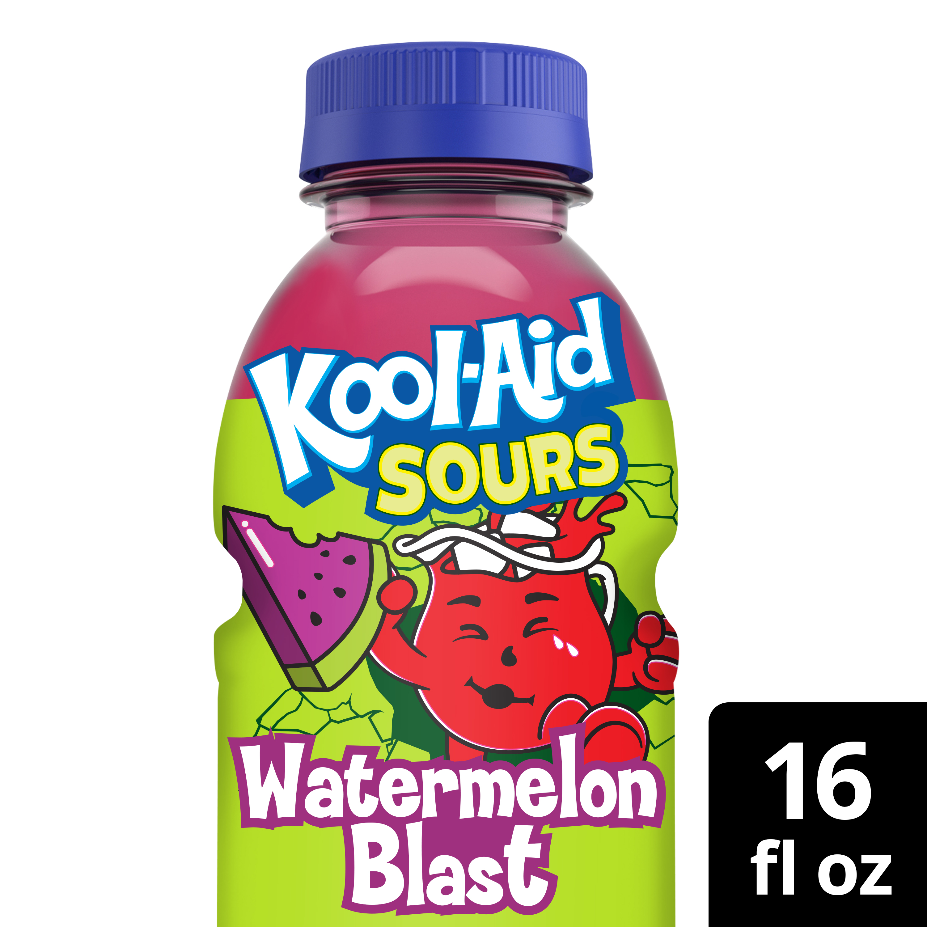 Product Description Calling all flavor explorers, Kool-Aid Sours have entered the chat. Kool-Aid's Watermelon Blast drink is a puckering ode to sour candy. It's a sure-fire way to raise the fun level for kids and nostalgia-hearted adults alike. Kool-Aid Sours Watermelon Blast is conveniently packaged in a 16-ounce bottle, so you can enjoy the sweet and tart beverage anytime, anywhere. While you can totally take our bottles on the go, you can also quench your thirst right at home with savor-worthy sour flavor that'll wake up your taste buds. They're ready when you are, no mixing or mess required! Just pop them in the fridge to make them even more refreshing. Kool-Aid Sours have you and your family's smiles in mind, while being mindful of your insides. That means Watermelon Blast is free of not-so-fun artificial dyes and is just 90 calories per bottle. It's a treat you can feel good about you and your family drinking. Flavorful fun this good deserves to be shared! Kool-Aid Sours promise to liven up birthday parties, BBQs, and every get-together, really! In addition to Watermelon Blast, Kool-Aid Sours are also available in Frostbite and Cherry Bomb, too. Equally as sour, equally as tongue-tickling, equally as delicious. Oh yeah, that's right!