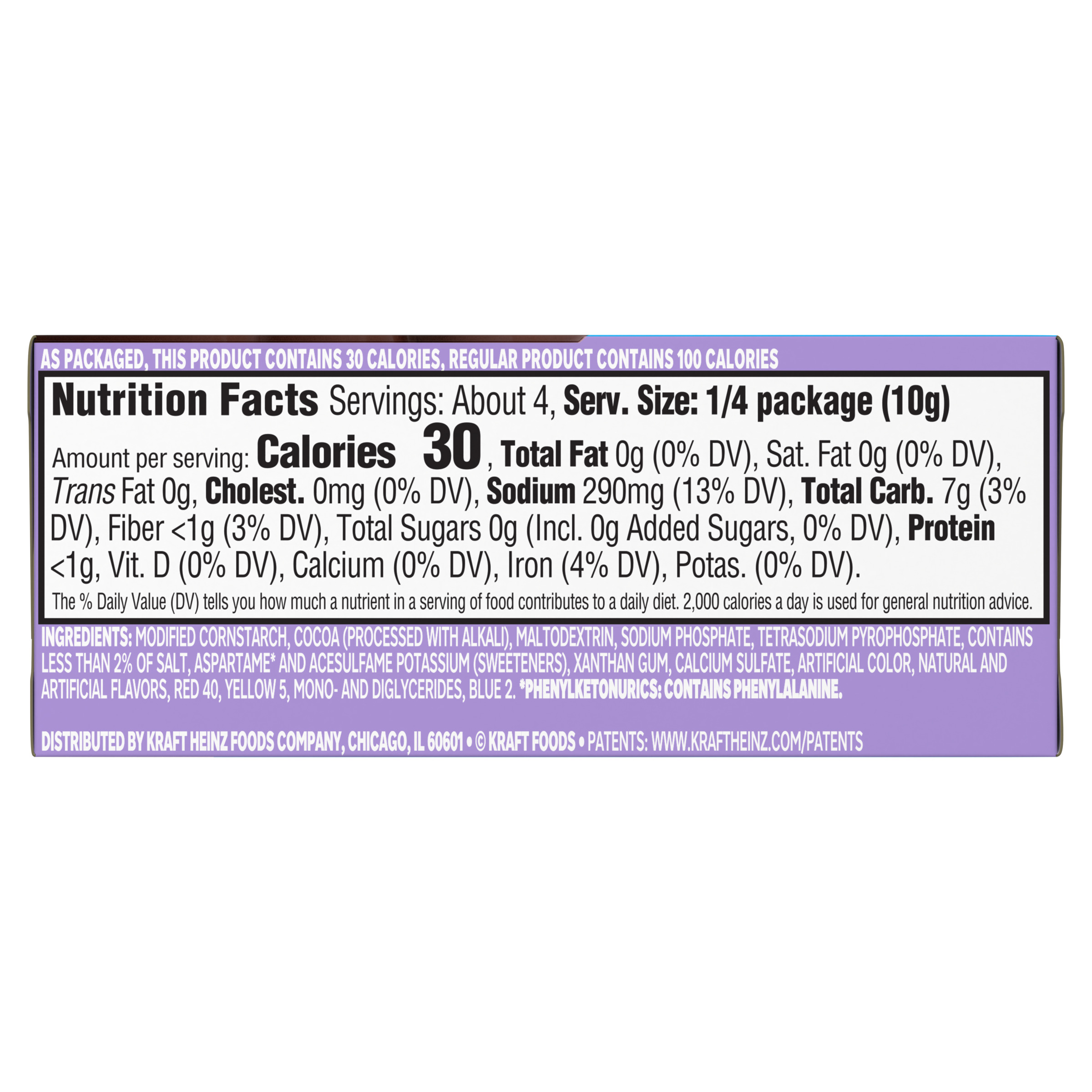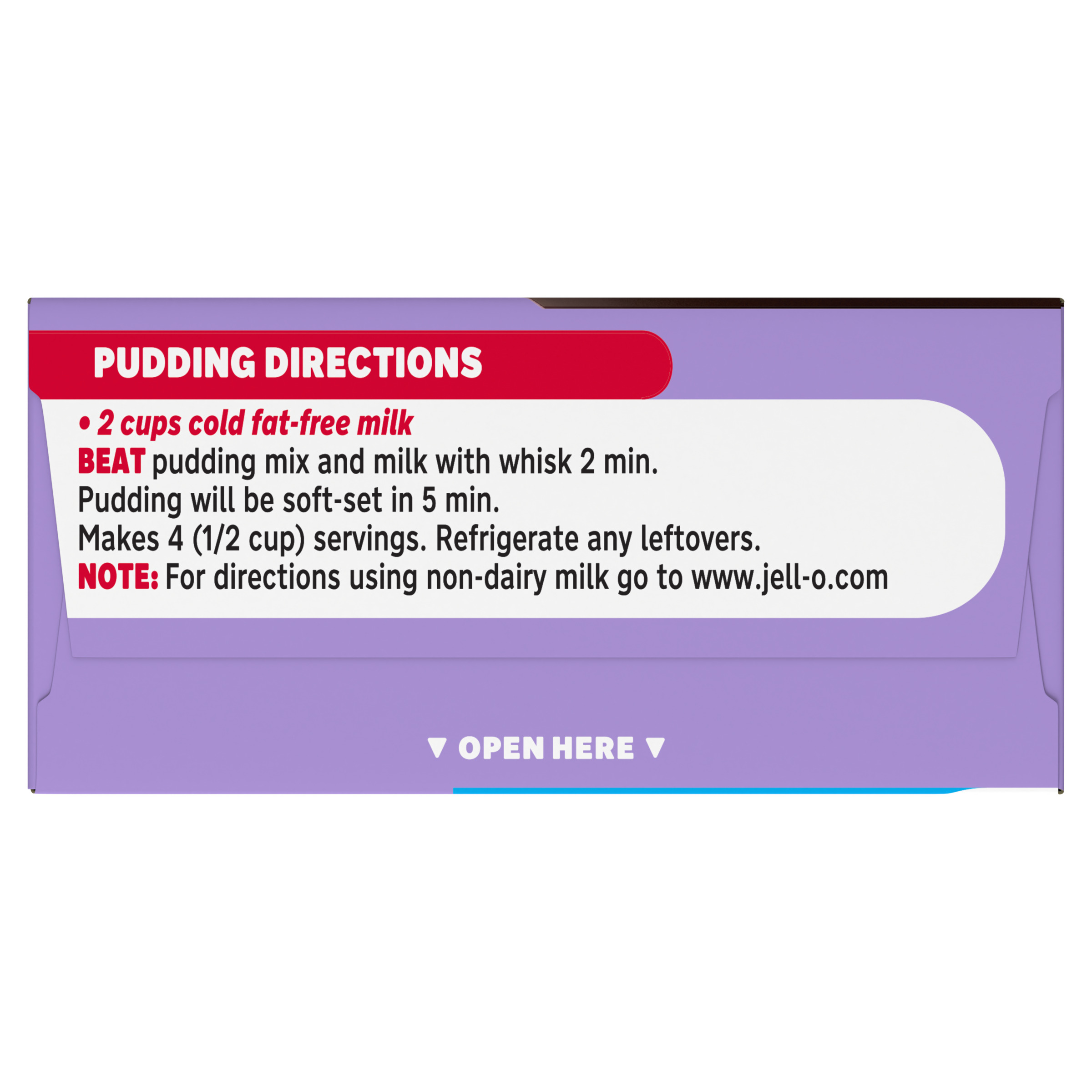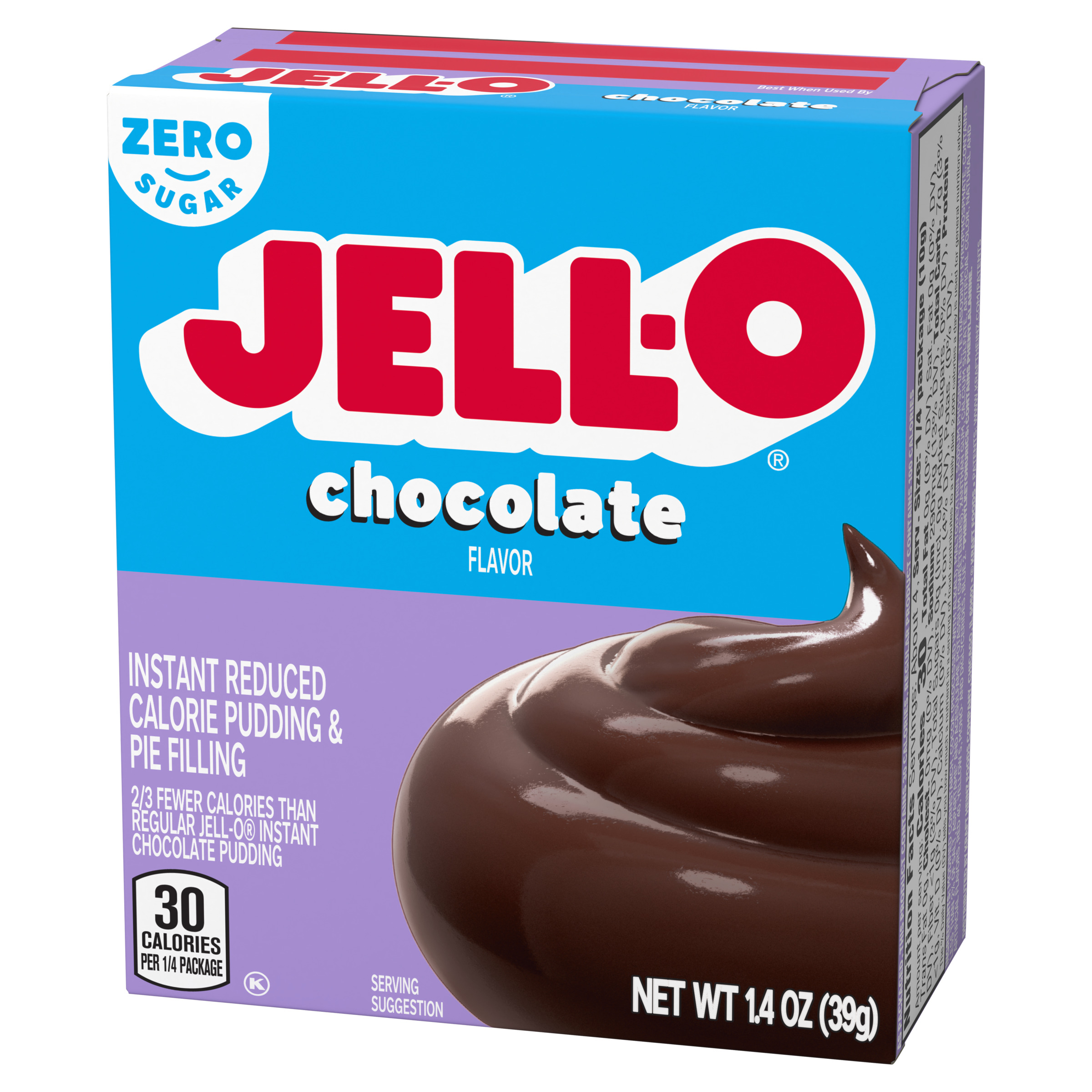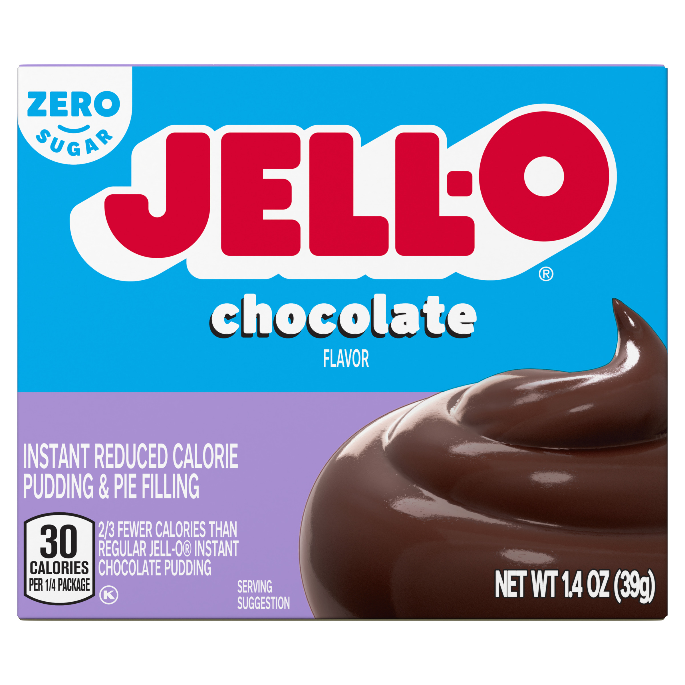 Product Description Snack happy. Jell-O Zero Sugar Chocolate Instant Reduced Calorie Pudding Mix & Pie Filling tastes delicious whether you enjoy it as a treat or use it as an ingredient in your favorite dessert recipes. Add some wonder to your day with a delicious snack. Fun to make with your kids, our zero sugar chocolate flavor pudding mix can also be used to create a poke cake, tasty crepes or chocolate pie filling. You'll feel good about serving our zero sugar pudding mix that is 2/3 fewer calories than regular Jell-O instant chocolate pudding; as packaged, this product contains 30 calories, regular product contains 100 calories. Our zero sugar chocolate flavor pudding is ready in as little as five minutes. Simply stir milk into the pudding mix and allow to set. Every zero sugar Jell-O pudding mix comes packaged in a 1.4-ounce sealed pouch. Pudding fun in every bite.