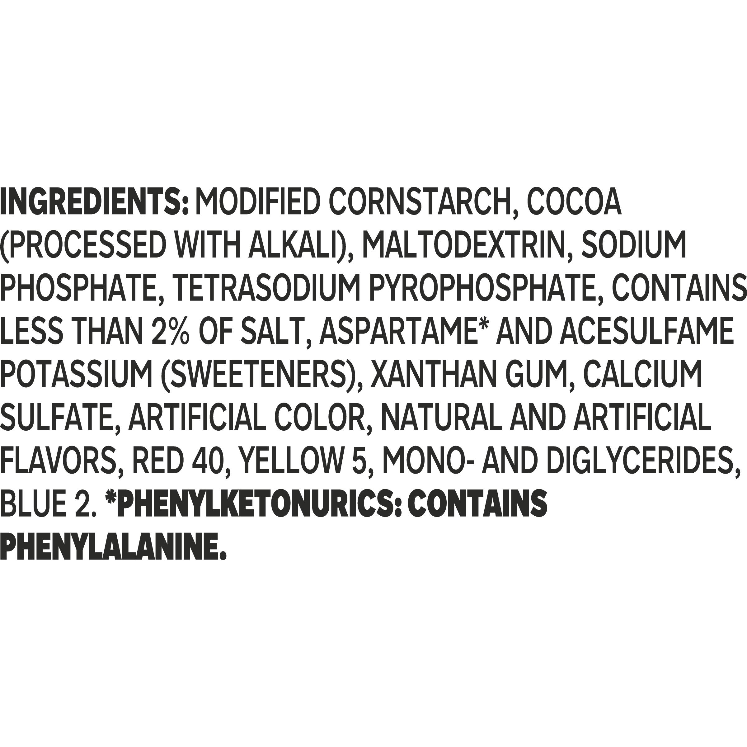 GTIN 00043000205518 Kraft Item Code (SKU) 00430002055170 Product Status Active Pack Level EACH Brand Name Jell-O Business Unit Hydration Desserts & Meals Catalog Platform Desserts Product Category Dry Package Dessert Consumer Unit Size 1.4 Consumer Unit Size UOM OZ Packaging Type (Computed) Box Packaging Type Code BOX/CARTON Packaging Type Code Override (Manual) BOX Sub Units Per Item 1 Variant Chocolate Sub Variant Zero Sugar Global Product Classification Desserts (Shelf Stable) Global Product Classification Code 10000312 Computed Exports - Ingredients MODIFIED CORNSTARCH, COCOA (PROCESSED WITH ALKALI), MALTODEXTRIN, SODIUM PHOSPHATE, TETRASODIUM PYROPHOSPHATE, CONTAINS LESS THAN 2% OF SALT, ASPARTAME* AND ACESULFAME POTASSIUM (SWEETENERS), XANTHAN GUM, CALCIUM SULFATE, ARTIFICIAL COLOR, NATURAL AND ARTIFICIAL FLAVORS, RED 40, YELLOW 5, MONO- AND DIGLYCERIDES, BLUE 2.*PHENYLKETONURICS: CONTAINS PHENYLALANINE. Parent Reference 10043000205515 Quality Statement Best When Used By Storage Instructions Store Ambient Customer Guarantee 180 Temperature Classification Ambient Prevailing Conditions Temperature Classification Code 01 Net Weight 0.088 Gross Weight 0.113 Weight UOM LB Height (in) 2.813 Length/Depth (in) 1.344 Width (in) 3.344 Case Cube 0.007 Parent Relation CASE_10043000205515 Parent Kraft Item Code (SKU) 00430002055100 Product Title Jell-O Chocolate Flavor Zero Sugar Instant Reduced Calorie Pudding & Pie Filling Mix, 1.4 oz Box eCommerce Product Name (Generic Name) Zero Sugar Chocolate Flavor Instant Pudding & Pie Filling Product Benefits (Includes Seasonal + Formatting) - One 1.4 oz box of Jell-O Zero Sugar Chocolate Flavor Instant Reduced Calorie Pudding Mix & Pie Filling