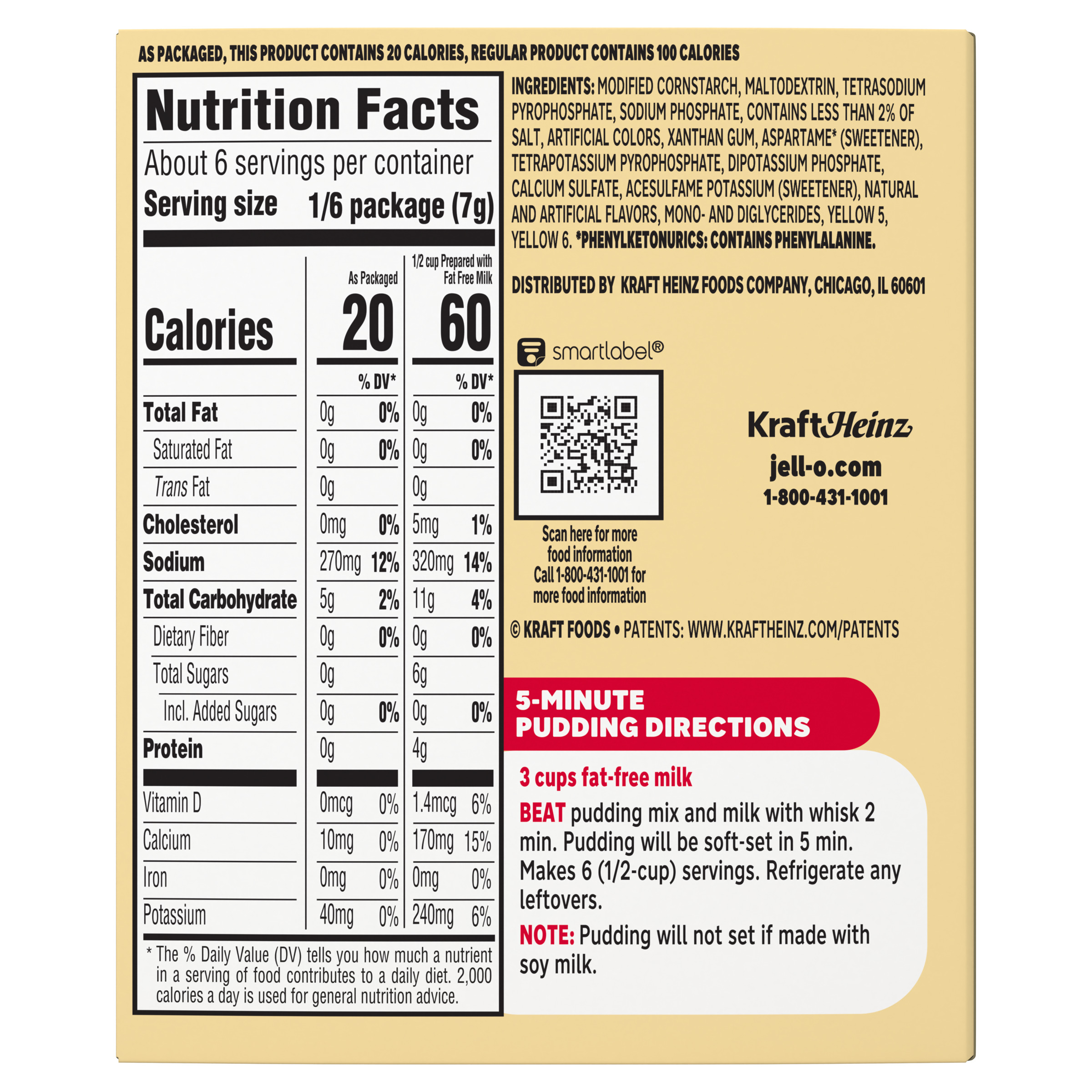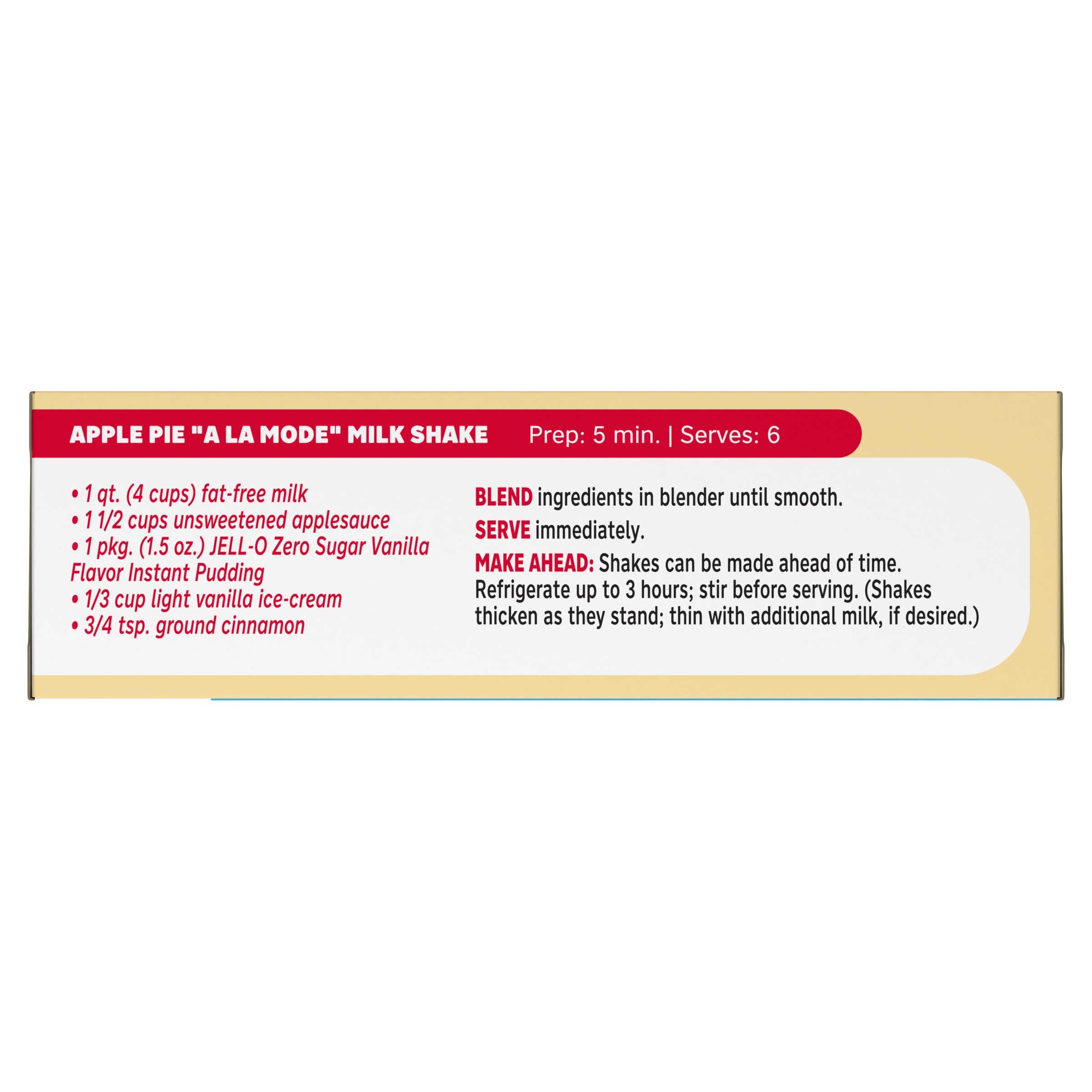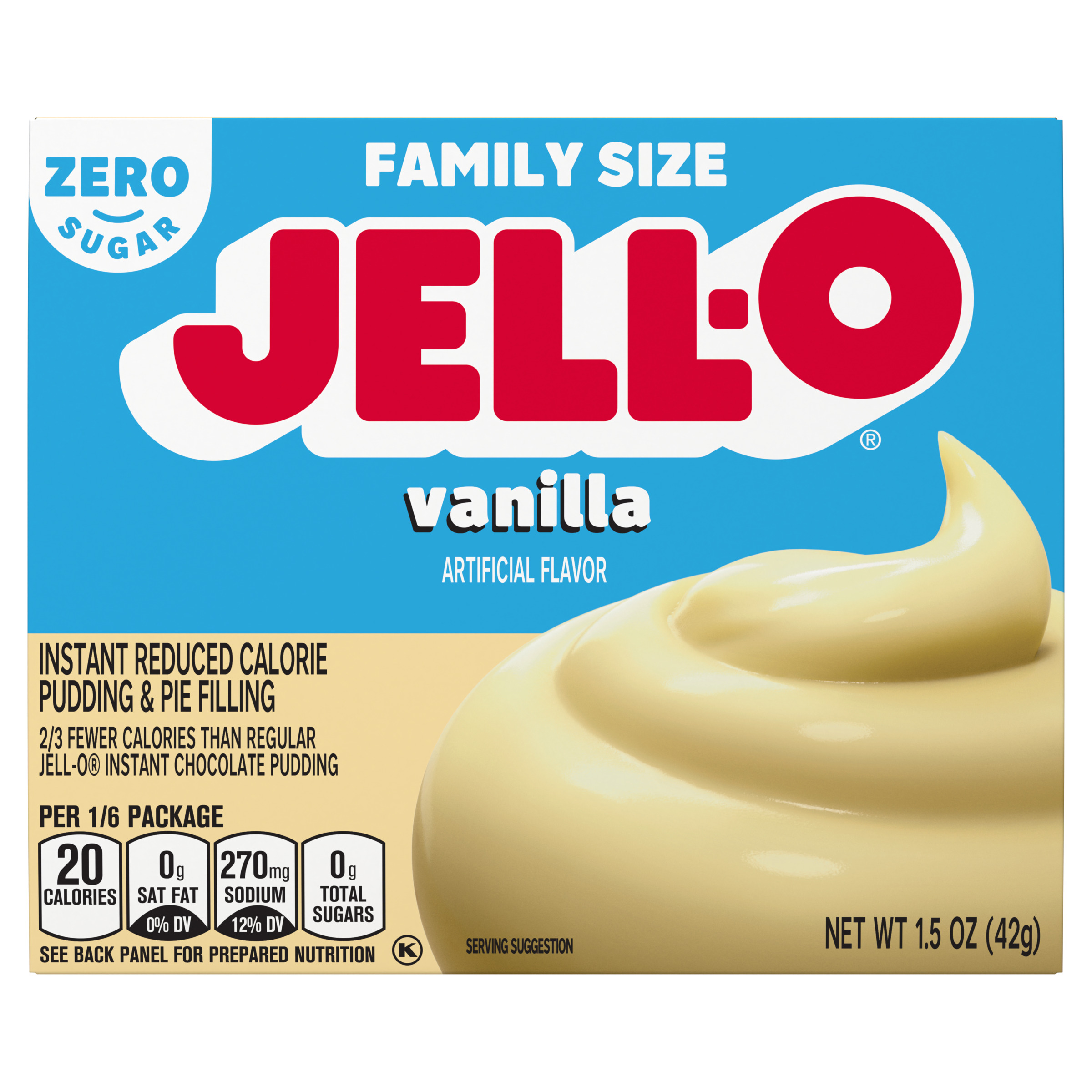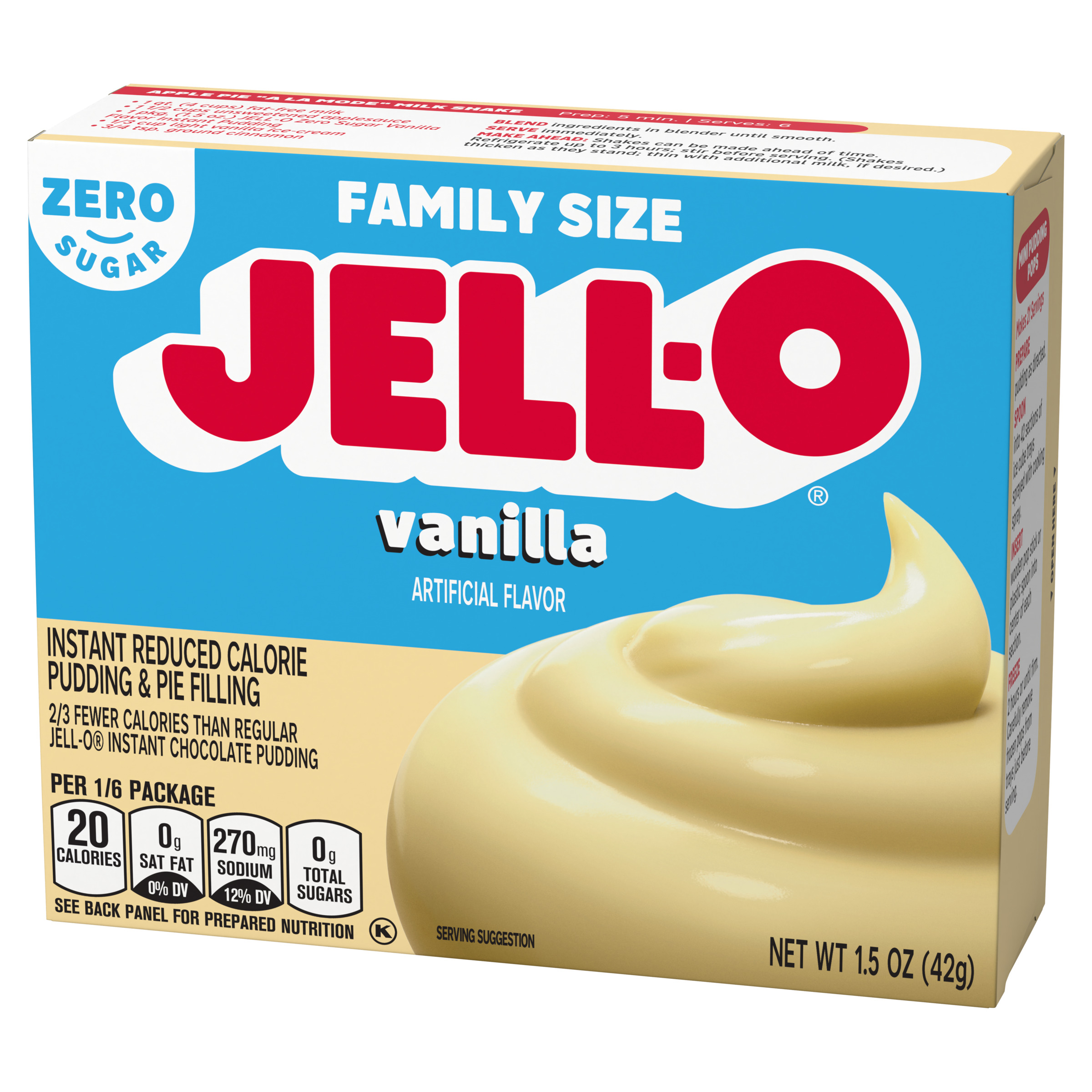 Product Description Snack happy. Jell-O Zero Sugar Vanilla Artificially Flavored Instant Reduced Calorie Pudding Mix & Pie Filling tastes delicious whether you enjoy it as a treat or use it as an ingredient in your favorite dessert recipes. Add some wonder to your day with a delicious snack. Fun to make with your kids, our zero sugar artificially flavored vanilla pudding mix can also be used to create a poke cake, tasty crepes or vanilla pie filling. You'll feel good about serving our zero sugar pudding mix that is 2/3 fewer calories than regular Jell-O instant chocolate pudding; as packaged, this product contains 20 calories, regular product contains 100 calories. Our zero sugar artificially flavored vanilla pudding is ready in as little as five minutes. Simply stir milk into the pudding mix and allow to set. Every zero sugar pudding mix comes packaged in a 1.5-ounce sealed pouch. Stock up with our convenient family-size box. Pudding fun in every bite.