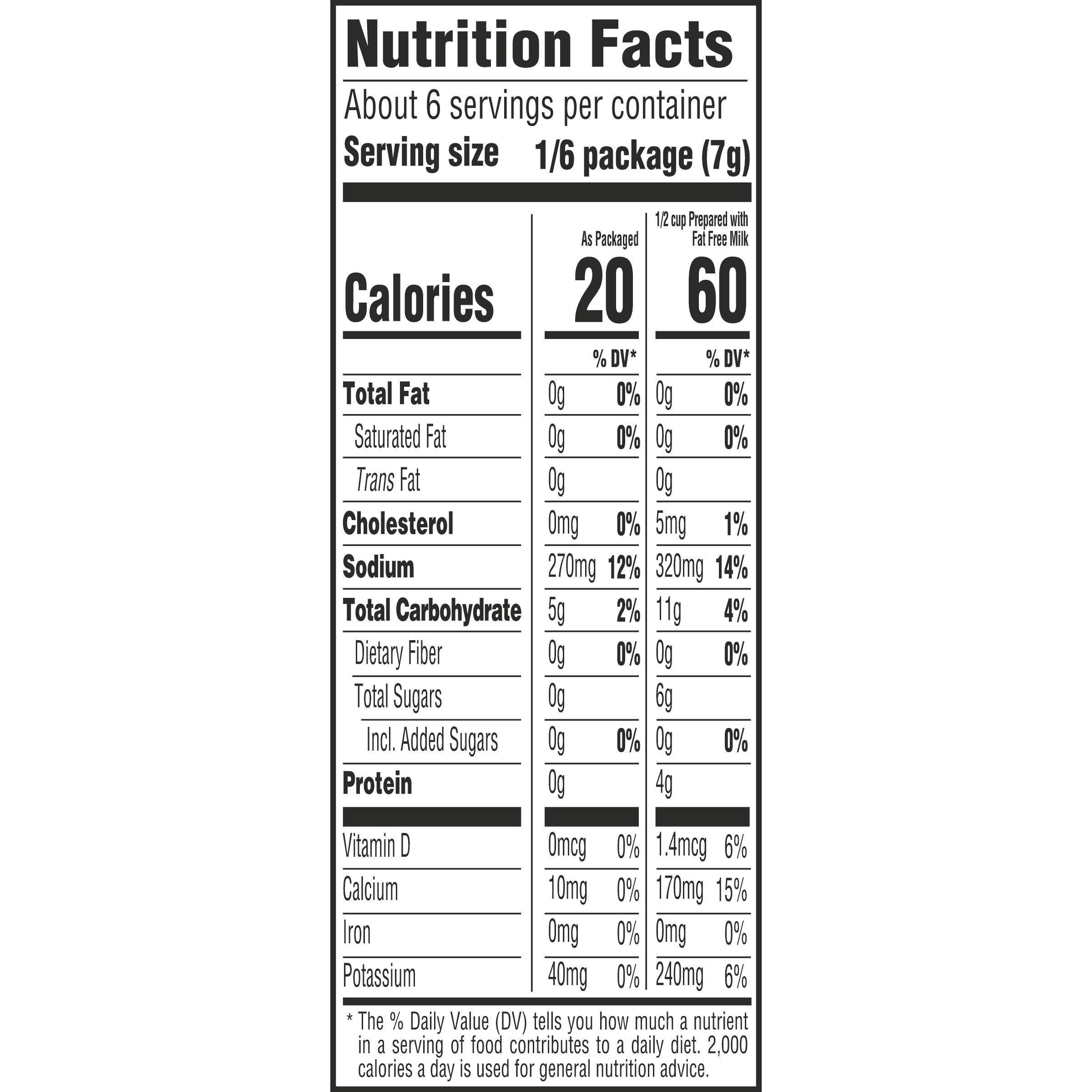 - Contains 2/3 fewer calories than regular Jell-O Instant Chocolate Pudding; as packaged, this product contains 20 calories, regular product contains 100 calories