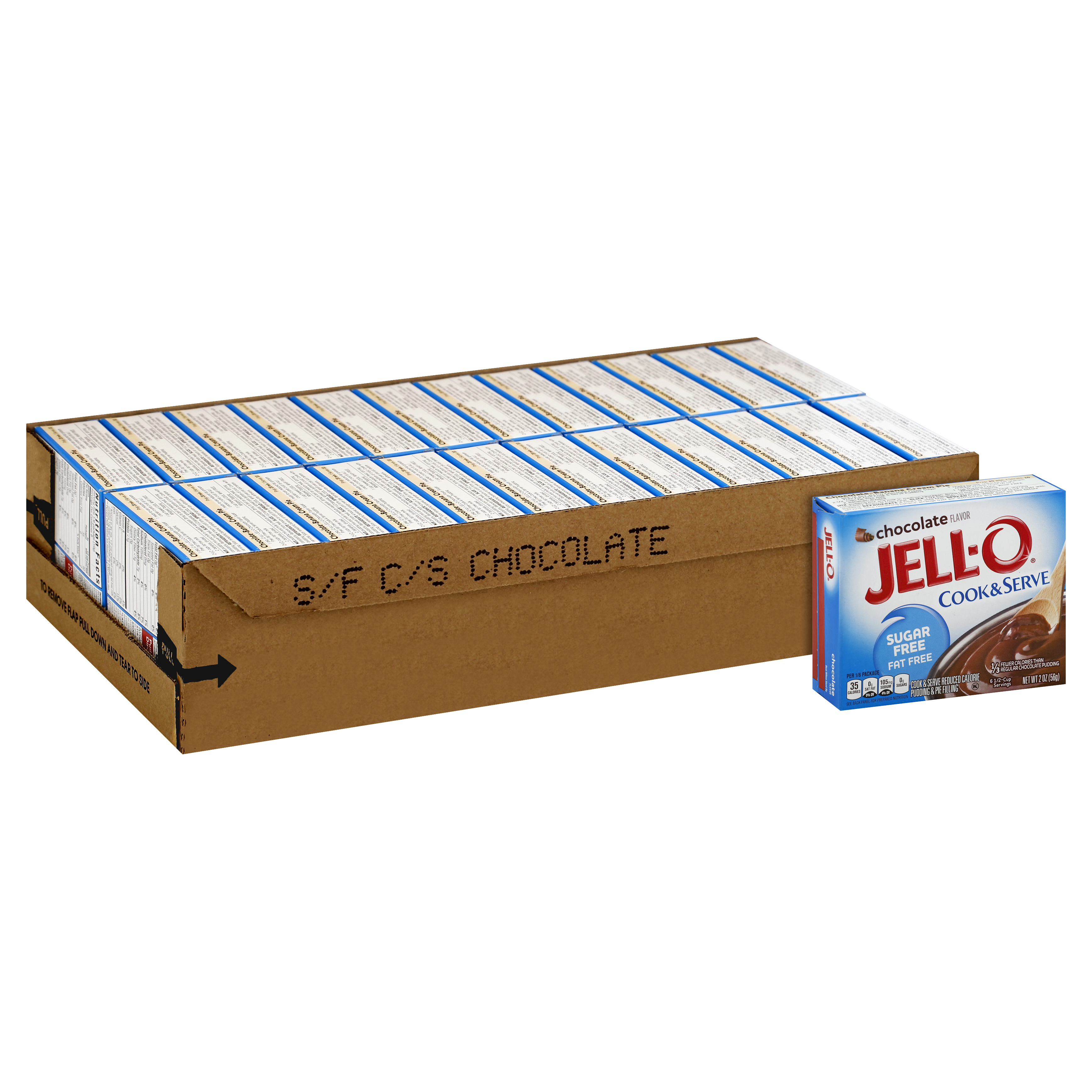 Product Description Jell-O Sugar Free Cook and Serve Chocolate Pudding Mix offers a delicious flavor, whether you eat it as a standalone treat or use it as an ingredient in your favorite dessert recipe. This sugar free pudding has 1/3 fewer calories than regular chocolate pudding, and is also fat free per serving, for the perfect guilt-free indulgent dessert. The 2 ounce cook and serve chocolate pudding come individually packaged in sealed pouches and are easy to cook on the stove top by simply adding milk. Serve this Jell-O simply with some whipped cream topping or use in your favorite cupcake recipe to create a decadent treat.