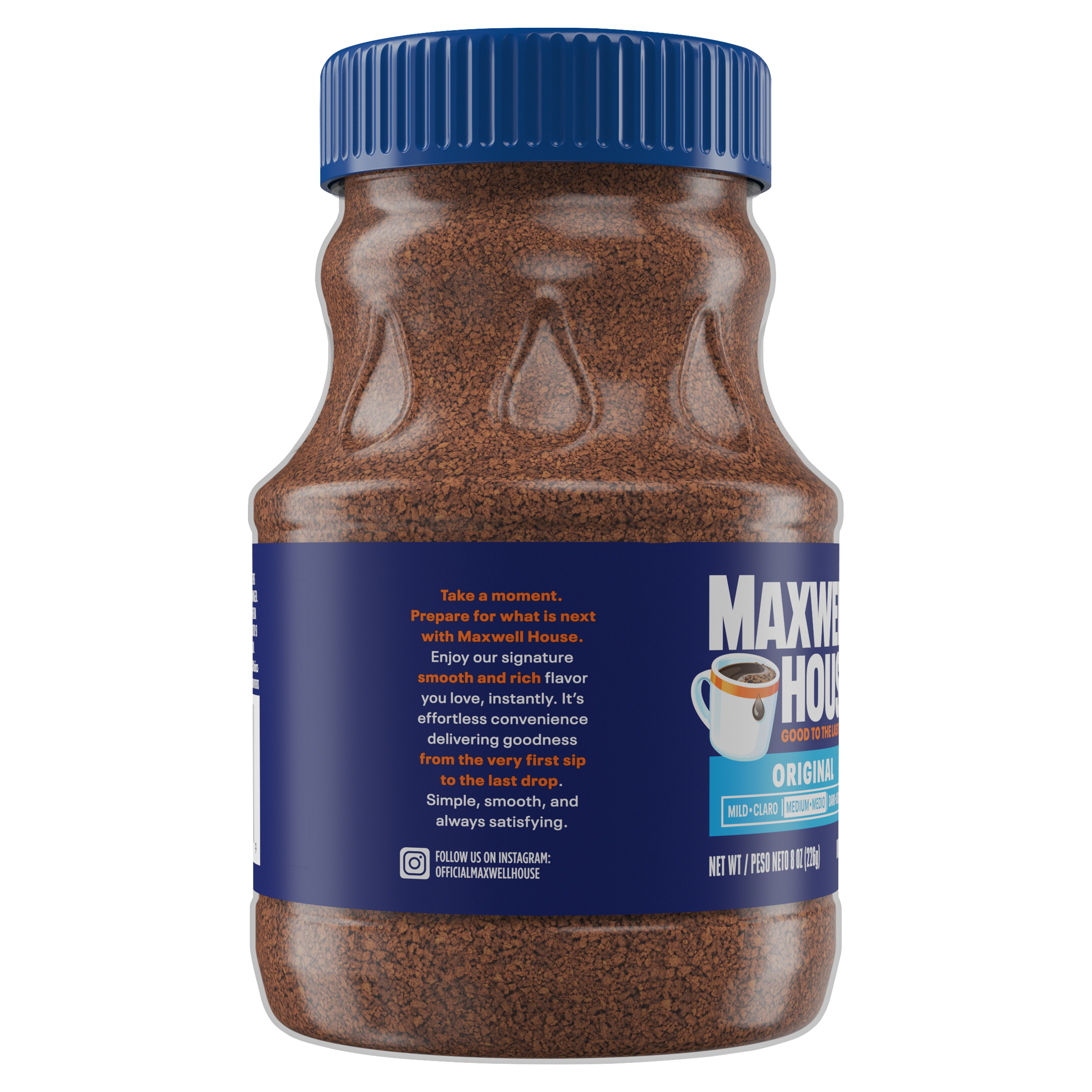 Product Description Take a break with the coffee that practically invented breaks. The day's been a whirlwind and it's far from over. But here's the thing — you're not stressing it. Because you've got it all figured out. You're gonna prepare the medium roast made for kicking back and enjoying the aroma. Maxwell House Original Roast Instant Coffee. Just sit back and savor every sip from your steaming cup full of strong, full-bodied Maxwell House flavor. Reset with that consistently delicious taste that hits the spot from the very first sip to the very last drop. And when that cup's empty and you're finally fueled up, you can squint your eyes, gather your gear and roll up your sleeves. Now, you're ready to tackle anything, and there’s plenty of Maxwell House Original Roast Instant Coffee ready for you in your 8-ounce jar. Let's show 'em what you're made of. Maxwell House. To Your Max.