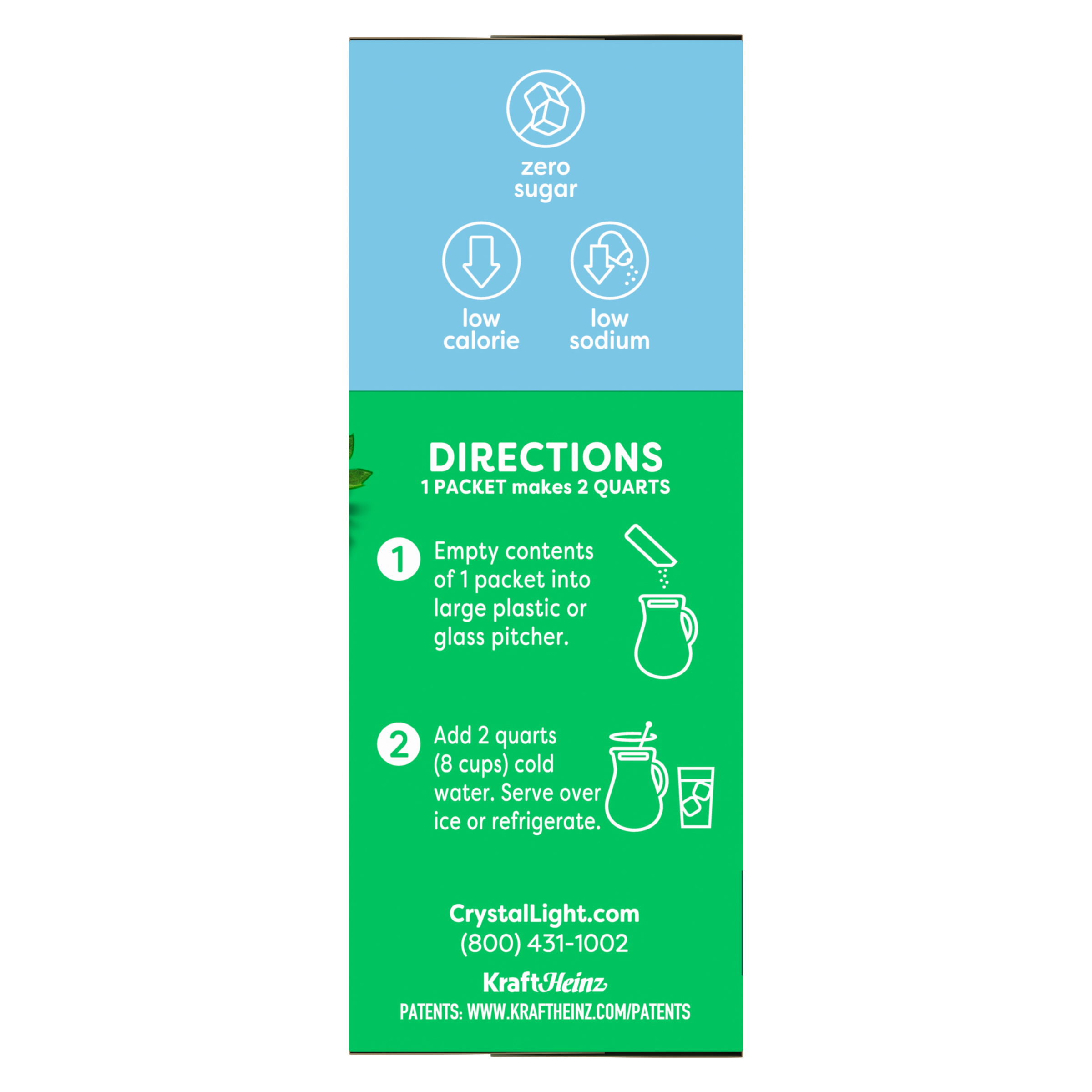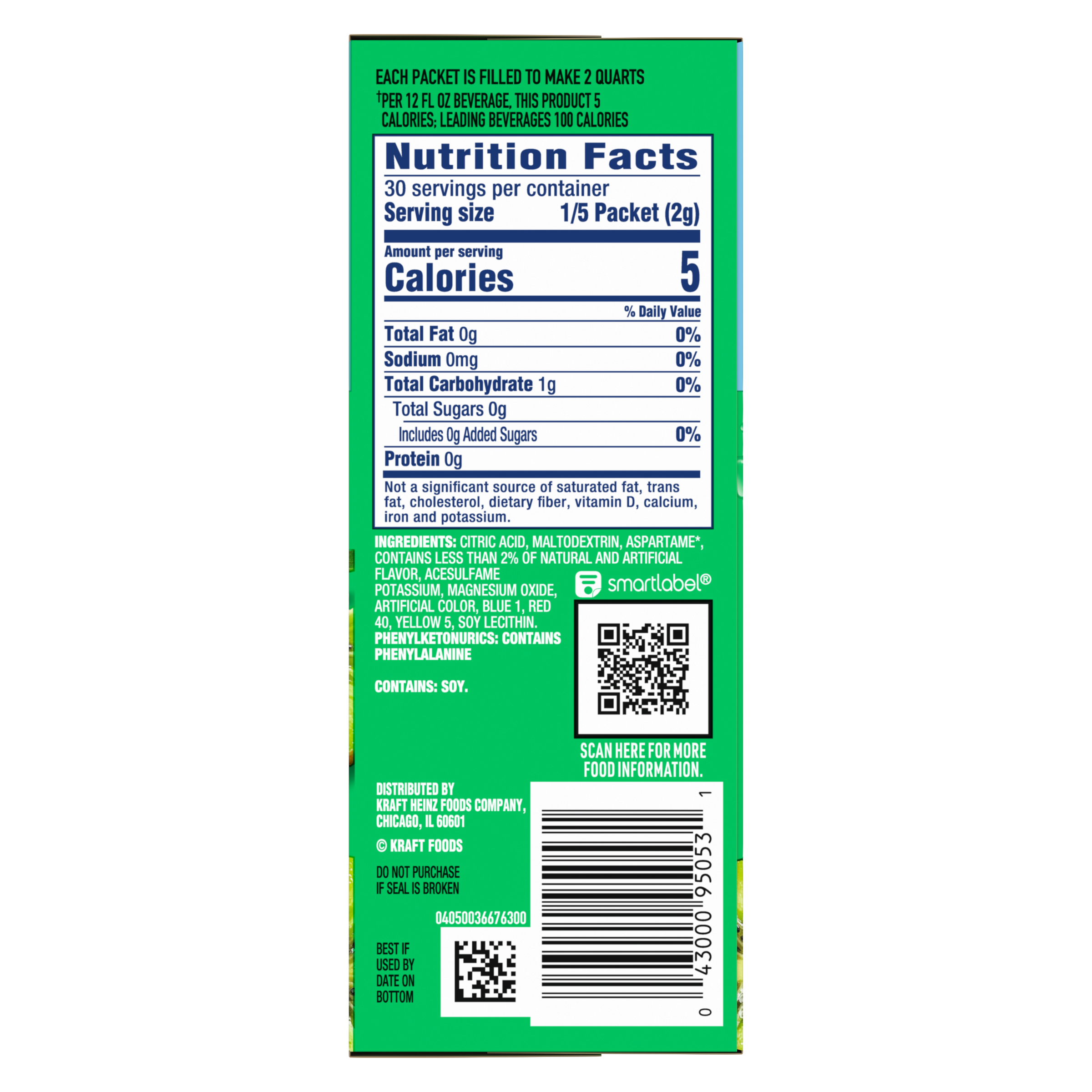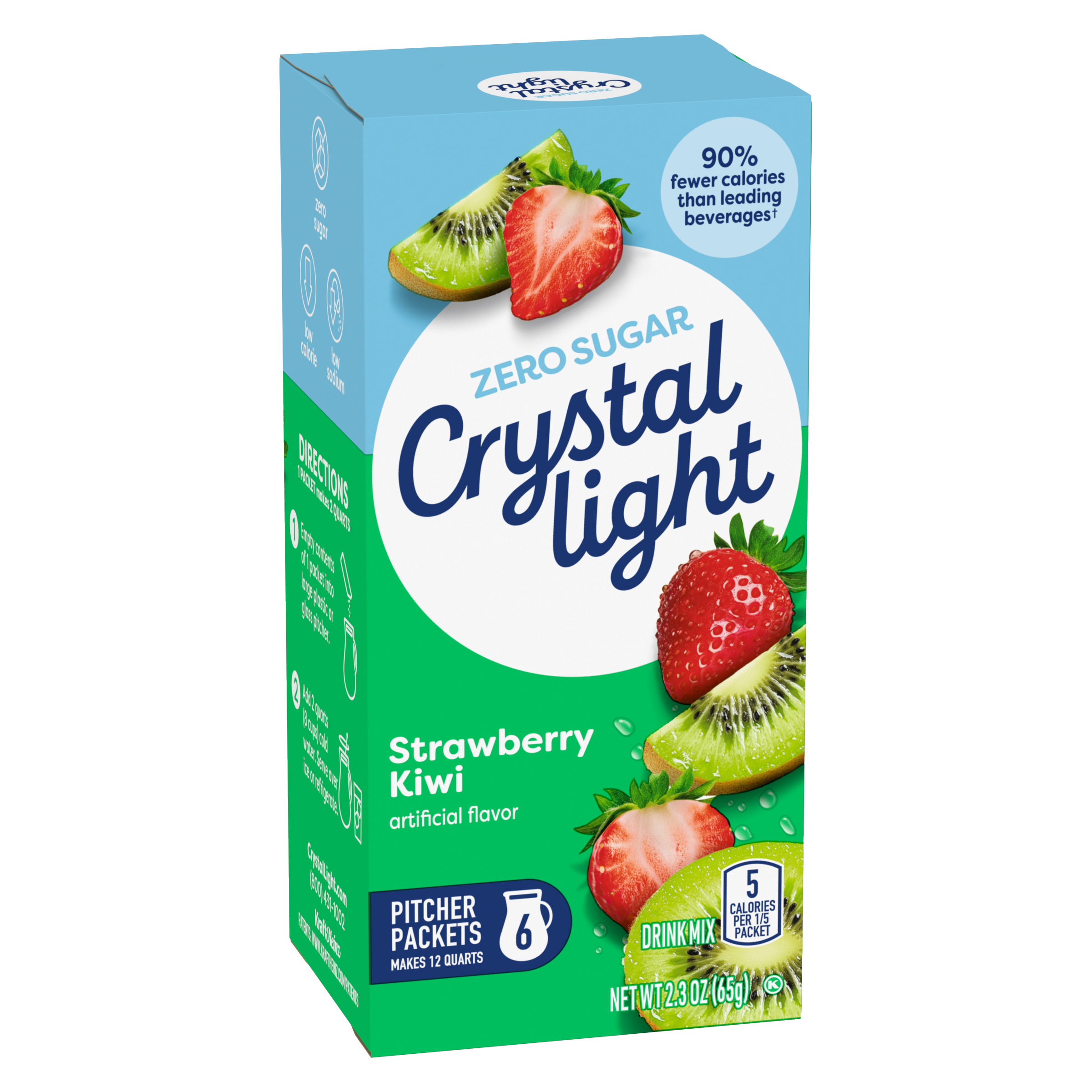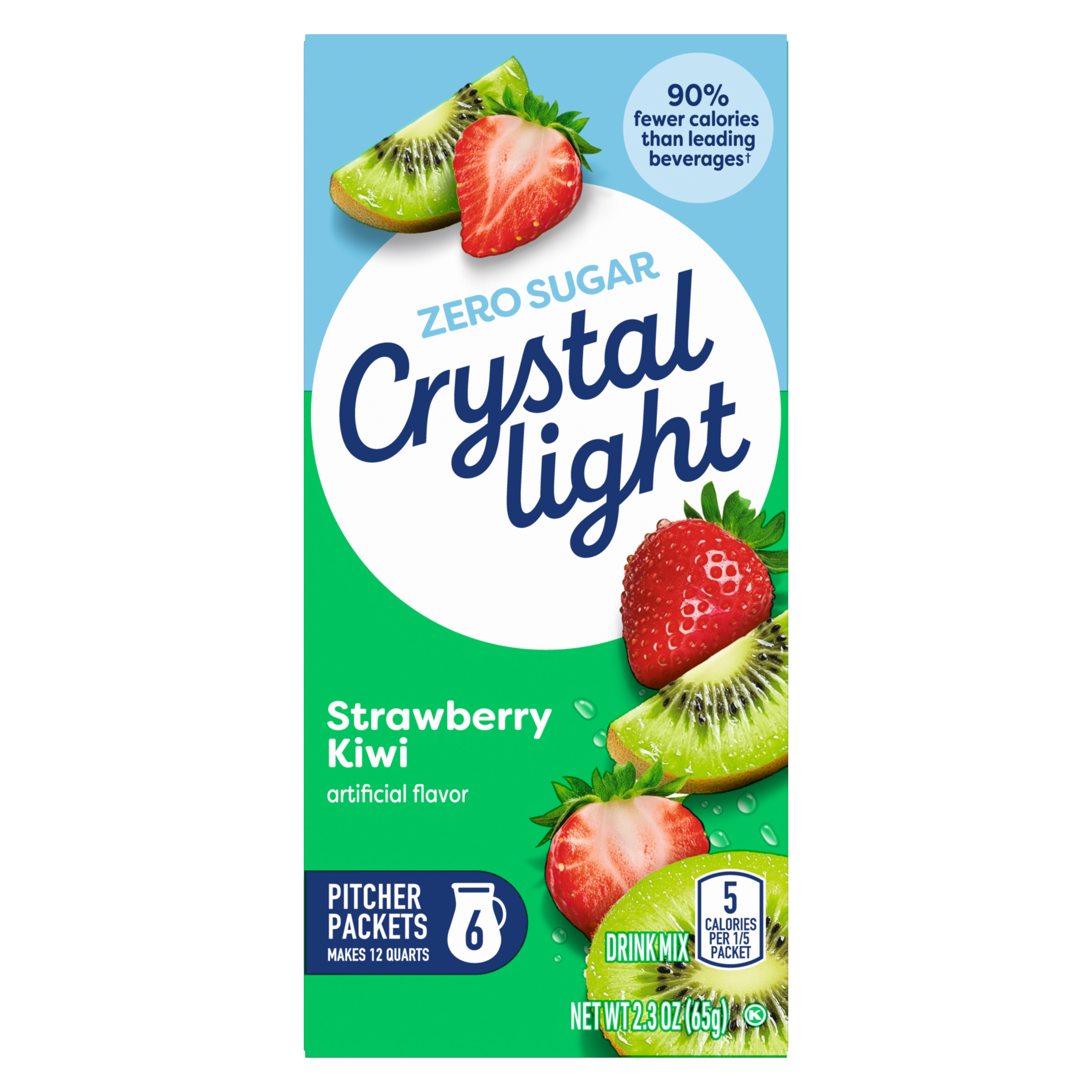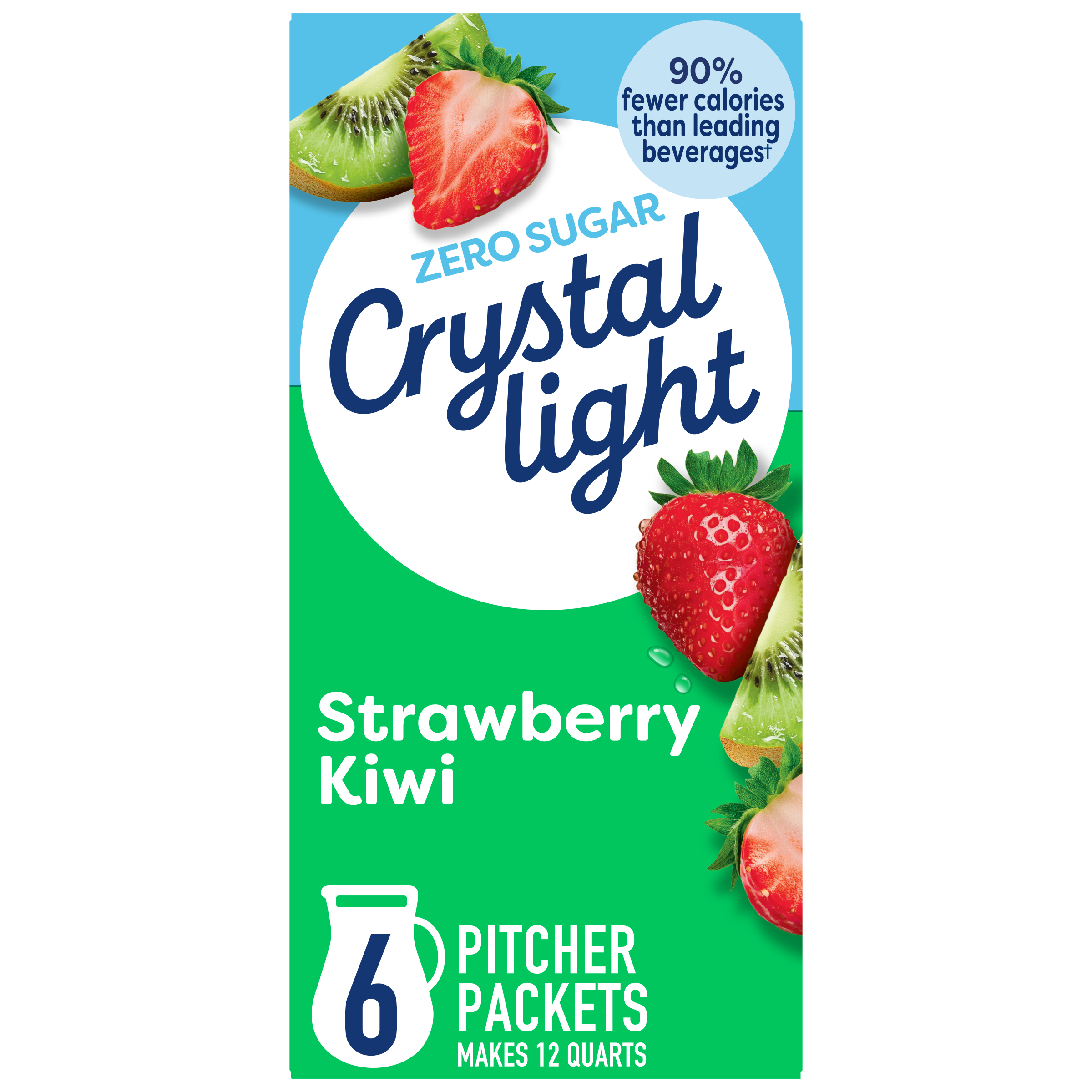 Product Description Crystal Light Artificially Flavored Strawberry Kiwi Powdered Drink Mix is a refreshing beverage you can enjoy at any time of day. With zero grams of sugar and only 5 calories per serving, Crystal Light is a sweet alternative to juice and soda and has 90 percent fewer calories than leading beverages (this product 5 calories, leading beverages 70 calories), so you don't have to choose between taste and calories. It's also made with classic fruit flavors for a refreshingly smooth taste. Each pitcher packet of powdered fruit drink mix in this 6 count canister is perfectly portioned to make 2 quarts or 1 pitcher of Crystal Light sugar free fruit drink, so there's plenty to share with family and friends. Simply mix one fruit drink packet with 8 cups or 2 quarts of water, stir, and enjoy! All the flavor and only 5 calories... just the way you like it.