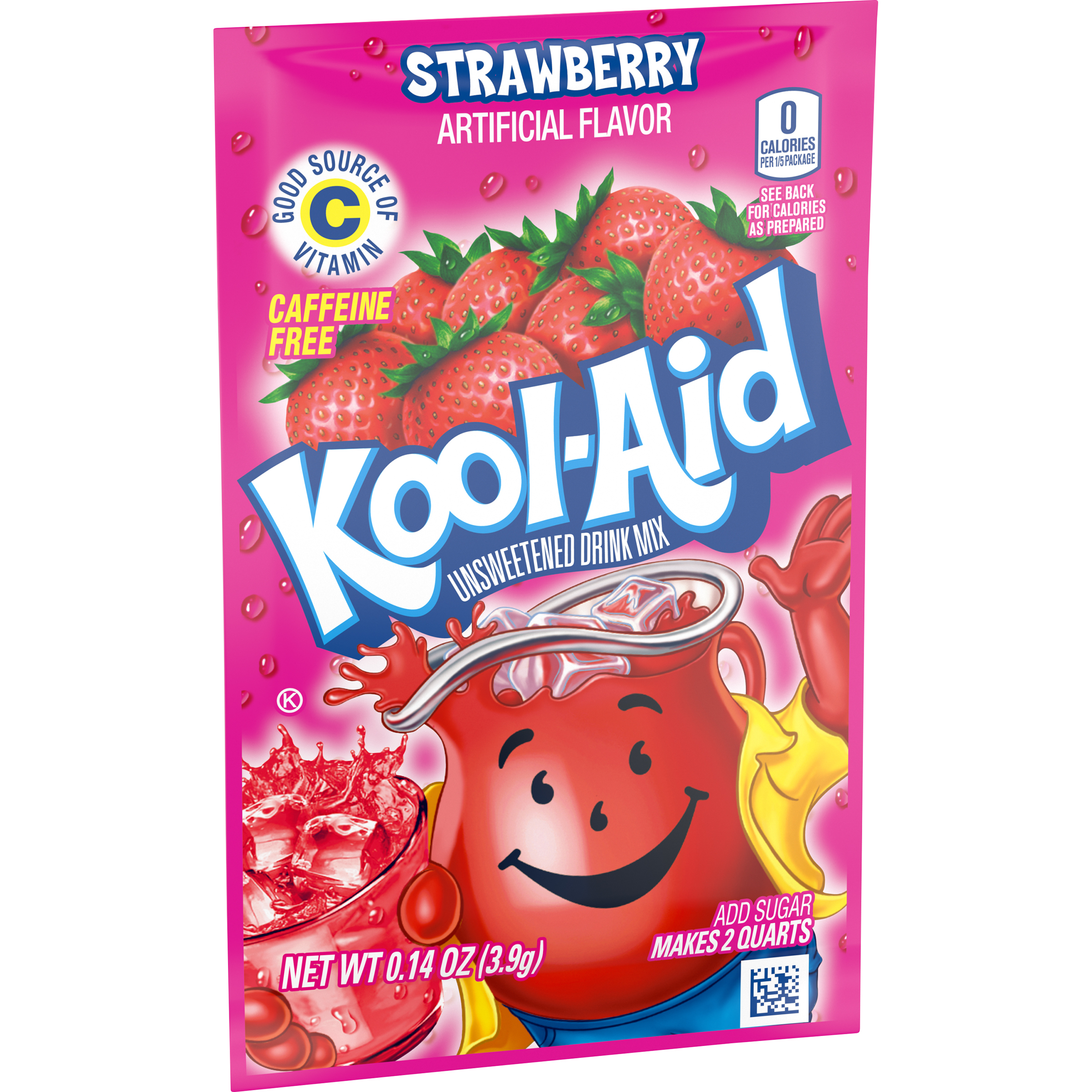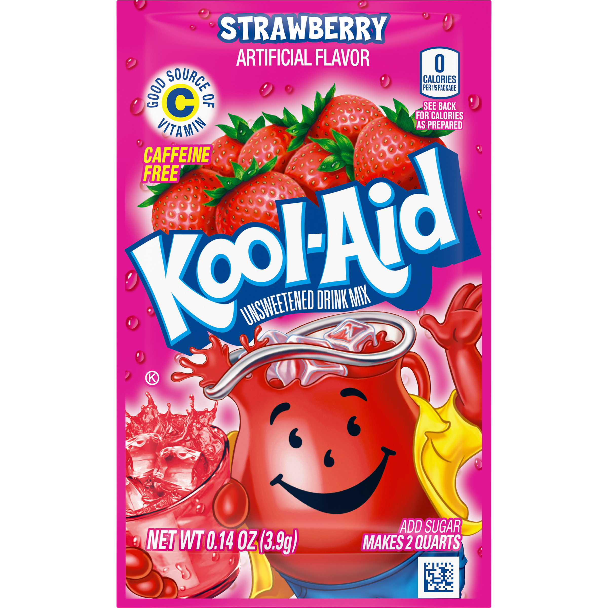 Product Description Oh Yeah! Quench your thirst with Kool-Aid Artificially Flavored Strawberry Unsweetened Drink Mix Packet. Refreshing and delicious, Kool-Aid mix powder makes it easy to prepare a tasty strawberry drink bursting with fruity flavor. With no caffeine, our artificially flavored powdered drink mix is always a great choice for the whole family. It's also a good source of vitamin C. Our handy Kool-Aid packets of unsweetened strawberry drink ensure that you always have a refreshing beverage ready to go. Enjoy anywhere—the beach, the pool or even at school! Drink mix packets are individually sealed until you're ready to ready to prepare. Best of all, you can customize the sweetness to your taste with as little or as much sugar as you desire. Easy to prepare, just empty contents of the 0.14 ounce drink mix packet into a plastic or glass pitcher. Add 1 cup of sugar or sweetener of your choice. Then, add cold water and ice and stir. Every drink powder packet makes a 2 quart supply of tasty strawberry Kool-Aid, enough for 5 servings. Available in a rainbow of flavors, Kool-Aid is flavorful fun made easy! With so many different refreshingly awesome flavors to choose from, it's time to stir up some fun.