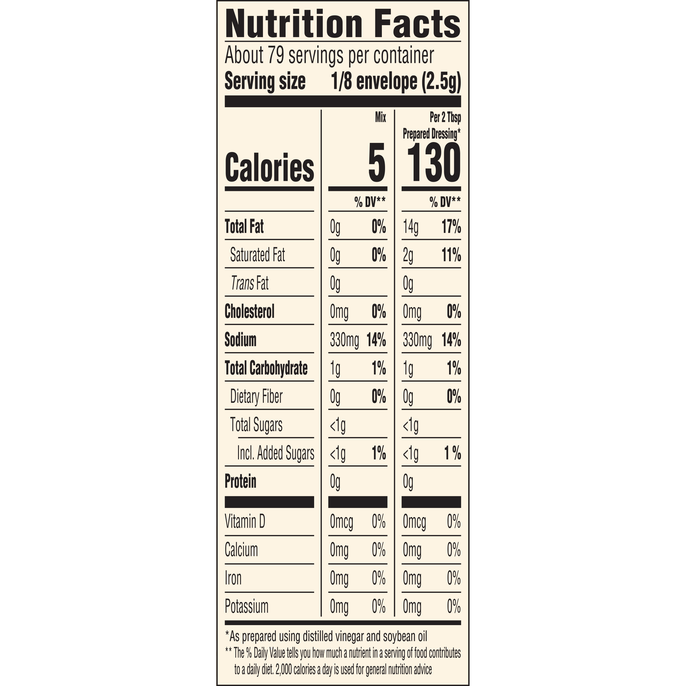 - Our Italian vinaigrette dressing contains 5 calories per 2.5g dry mix