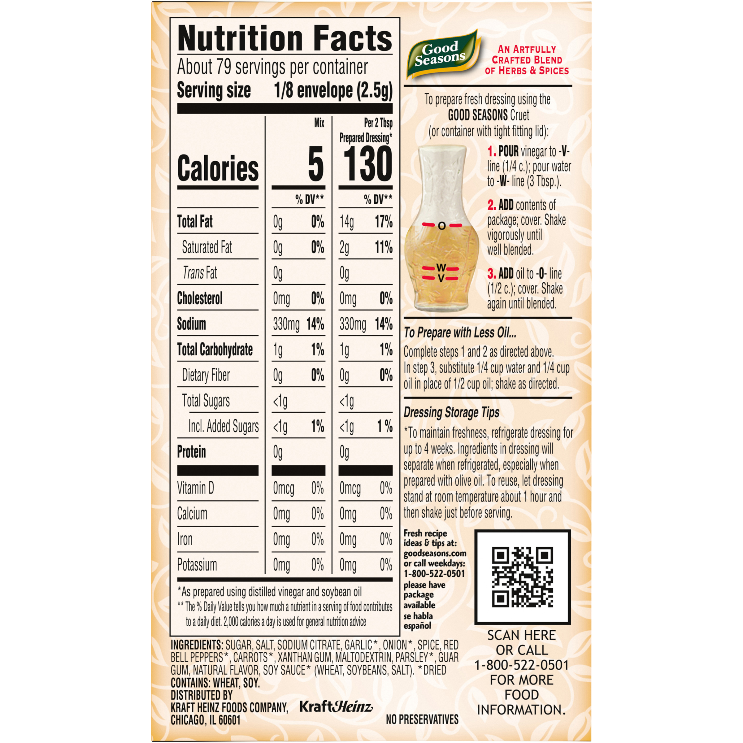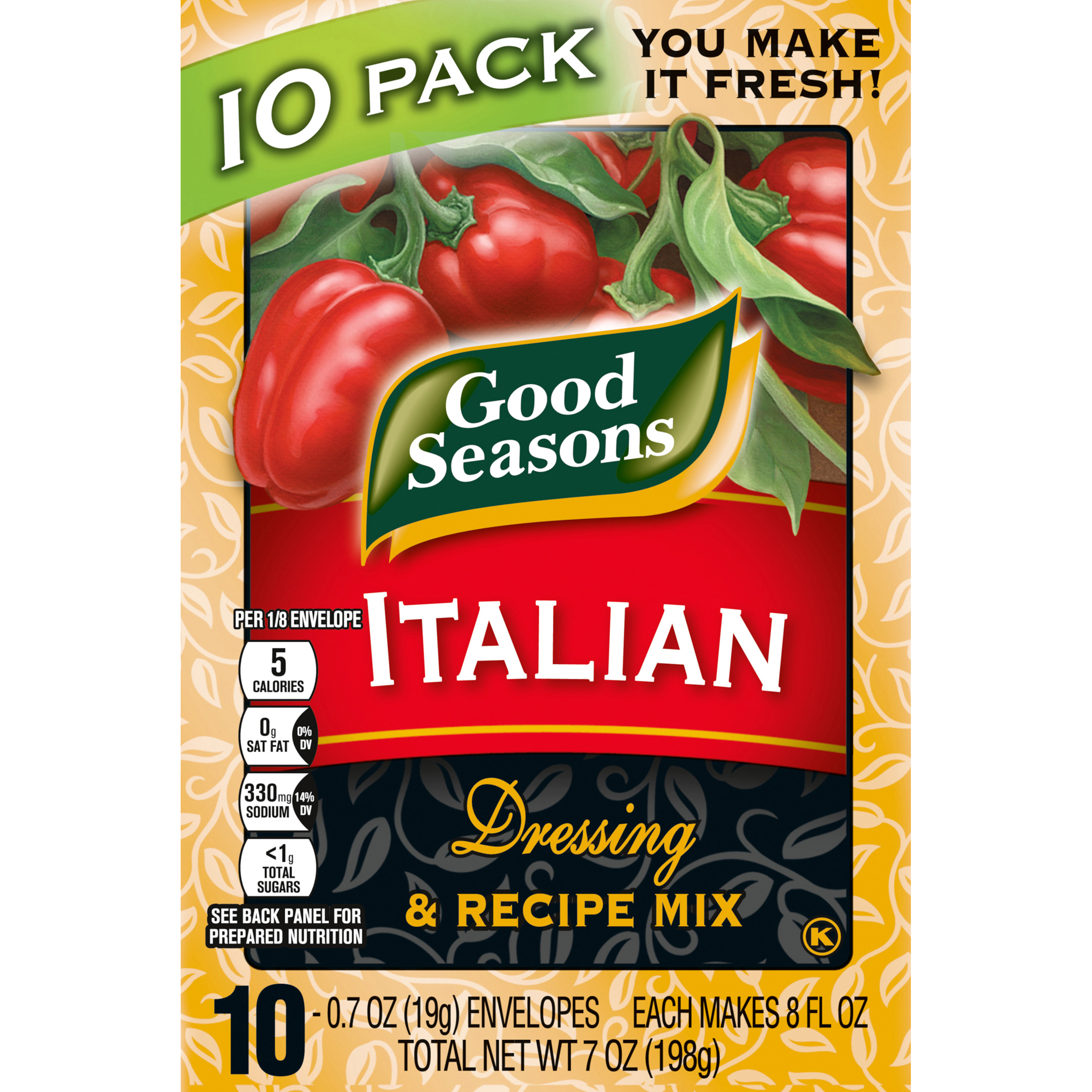 Product Description Good Seasons Italian Dry Dressing and Recipe Mix delivers succulent mouth-watering dressing with the authentic taste of Italian cuisine. Our well-balanced dry Italian dressing mix with herbs and spices makes for a delicious made-from-scratch taste. Each Italian dressing packet is perfectly suited for creating your own unique marinades, sauces and dips. Easy to make, just combine packet, vinegar, water and oil for the perfect blend of flavors. You can even make our Good Seasons Dressing with red wine vinegar to add more flavor. Our Italian dressing mix contains 5 calories per 2.5g dry mix. Combine with Worcestershire sauce, seasonings, pretzels and nuts for a fantastic party mix.