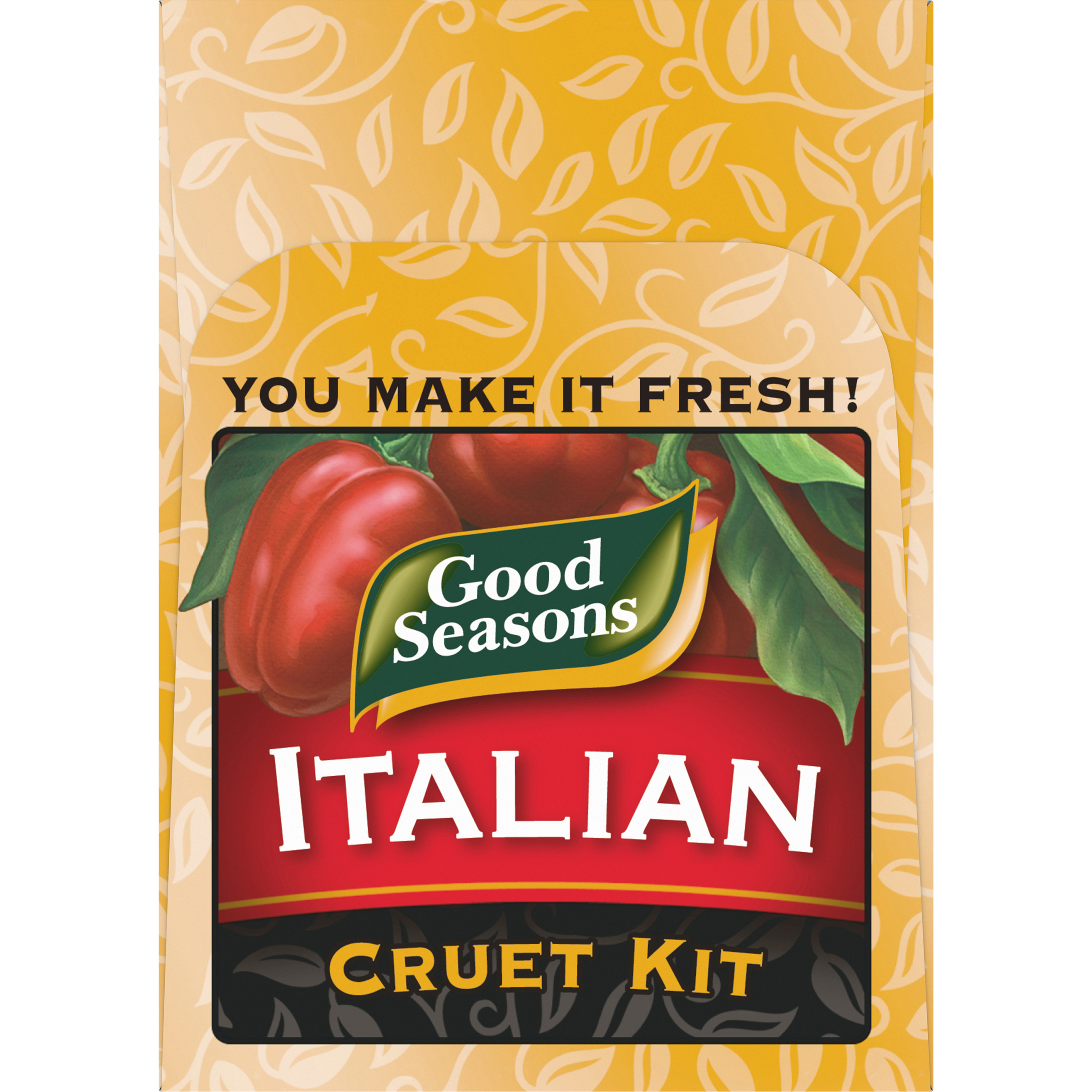 GTIN 00043000978689 Kraft Item Code (SKU) 00430009786870 Product Status Active Pack Level EACH Brand Name Good Seasons Business Unit Elevation Catalog Platform Taste Elevation Product Category Salad Dressings Consumer Unit Size 1.4 Consumer Unit Size UOM OZ Packaging Type (Computed) Box Packaging Type Code BOX/CARTON Packaging Type Code Override (Manual) PACKETS Sub Units Per Item 1 Variant Italian Global Product Classification Dressings/Dips (Shelf Stable) Global Product Classification Code 10000200 Computed Exports - Ingredients SUGAR, SALT, SODIUM CITRATE, GARLIC*, ONION*, SPICE, RED BELL PEPPERS*, CARROTS*, XANTHAN GUM, MALTODEXTRIN, PARSLEY*, GUAR GUM, NATURAL FLAVOR, SOY SAUCE* (WHEAT, SOYBEANS, SALT). *DRIED Parent Reference 00043000036006 Customer Guarantee 90 Temperature Classification Ambient Prevailing Conditions Temperature Classification Code 01 Net Weight 0.088 Gross Weight 0.839 Weight UOM LB Height (in) 7.375 Length/Depth (in) 4.25 Width (in) 3 Case Cube 0.054 Parent Relation CASE_00043000036006 Parent Kraft Item Code (SKU) 00430000360000 Product Title Good Seasons Italian Dressing & Recipe Seasoning Mix with Free Cruet Kit, 2 ct Packets eCommerce Product Name (Generic Name) Italian Dressing & Recipe Seasoning Mix Product Benefits (Includes Seasonal + Formatting) - One 1.4 oz box of Good Seasons Italian Dry Salad Dressing and Recipe Mix