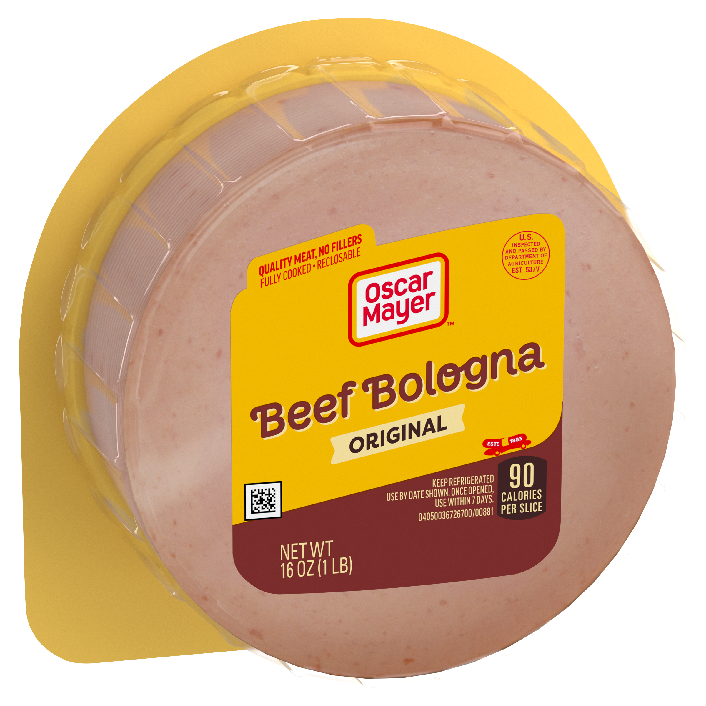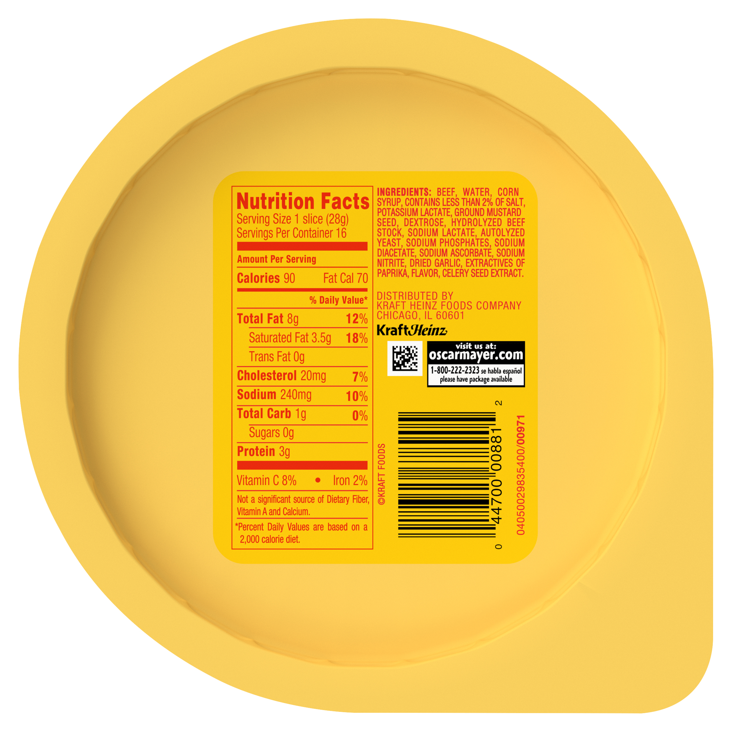 GTIN 00044700008812 Kraft Item Code (SKU) 00447000088170 Product Status Active Pack Level EACH Brand Name Oscar Mayer Business Unit Meat Cheese Coffee & Snacks Catalog Platform Meats Product Category Cold Cuts Consumer Unit Size 16 Consumer Unit Size UOM OZ Packaging Type (Computed) Pack Packaging Type Code VACUUM PACKED Packaging Type Code Override (Manual) Vacuum Pack Sub Units Per Item 1 Variant Original Global Product Classification Mixed Species Meat/Poultry - Prepared/Processed Global Product Classification Code 10005778 Computed Exports - Ingredients BEEF, WATER, CORN SYRUP, CONTAINS LESS THAN 2% OF SALT, POTASSIUM LACTATE, GROUND MUSTARD SEED, DEXTROSE, HYDROLYZED BEEF STOCK, SODIUM LACTATE, AUTOLYZED YEAST, SODIUM PHOSPHATES, SODIUM DIACETATE, SODIUM ASCORBATE, SODIUM NITRITE, DRIED GARLIC, EXTRACTIVES OF PAPRIKA, FLAVOR, CELERY SEED EXTRACT. Parent Reference 00044700096925 Quality Statement USE BY DATE SHOWN. ONCE OPENED, USE WITHIN 7 DAYS. Storage Instructions Keep Refrigerated Customer Guarantee 30 Temperature Classification Refrigerated (Meat - USDA) 1 to 4 °C / 35 to 40 °F Temperature Classification Code 02 Net Weight 1 Gross Weight 1.025 Weight UOM LB Height (in) 5.852 Length/Depth (in) 2.146 Width (in) 5.118 Case Cube 0.037 Parent Relation CASE_00044700096925 Parent Kraft Item Code (SKU) 00447000969200 Product Title Oscar Mayer Beef Bologna Deli Lunch Meat, 16 oz Package eCommerce Product Name (Generic Name) Beef Bologna Deli Lunch Meat Product Benefits (Includes Seasonal + Formatting) - One 16 oz plastic pack of Oscar Mayer Beef Bologna Sliced Lunch Meat