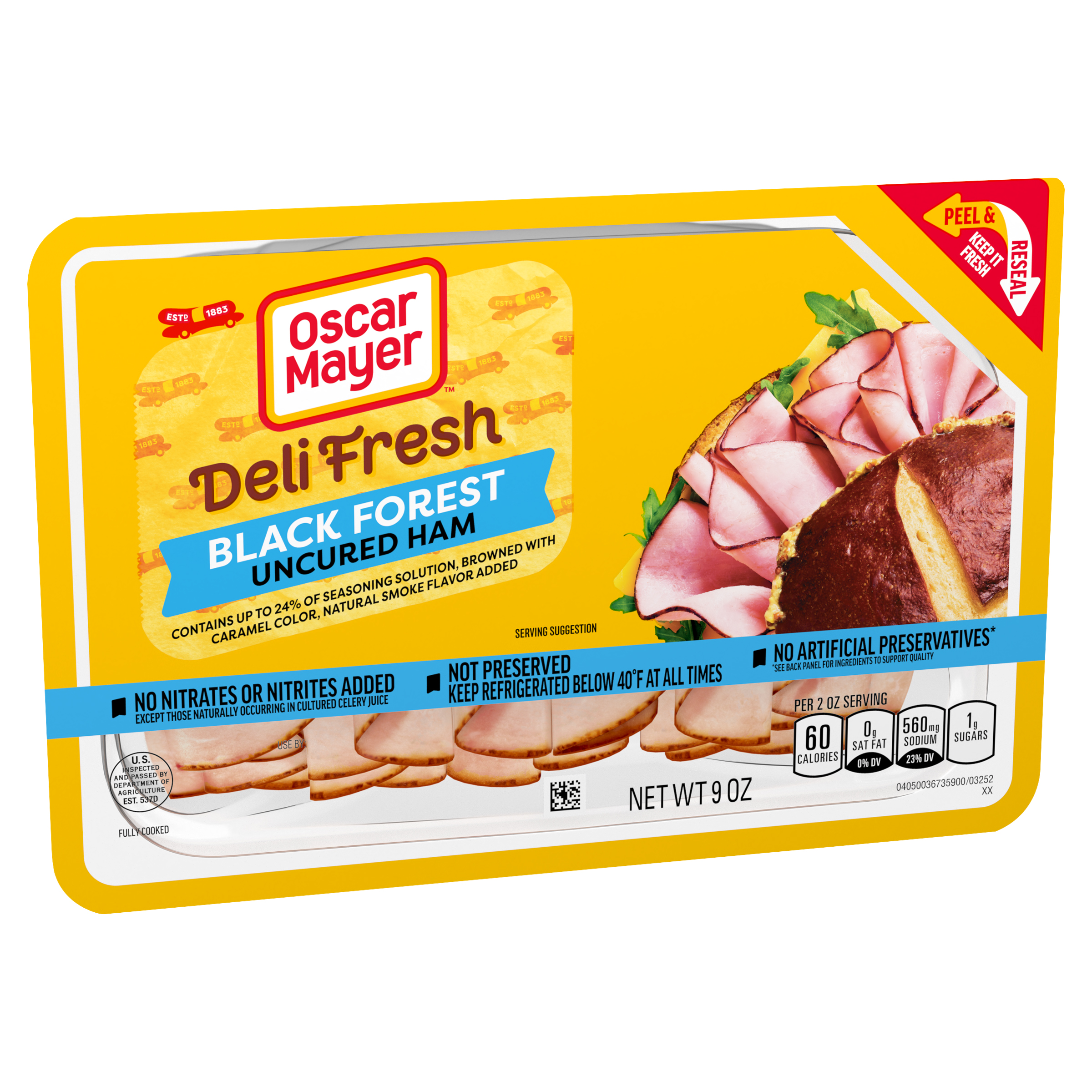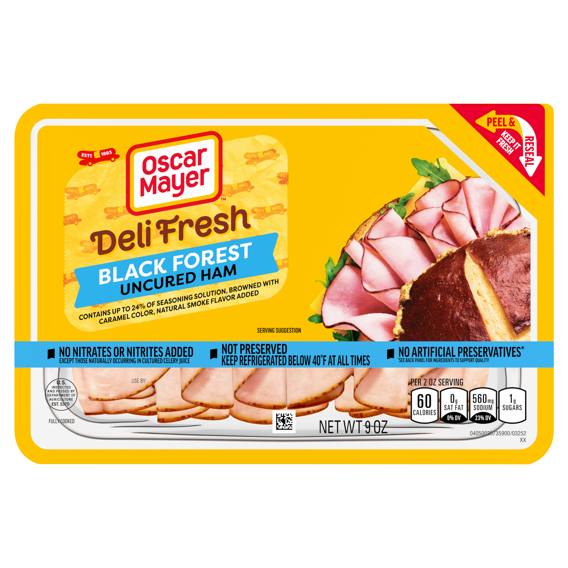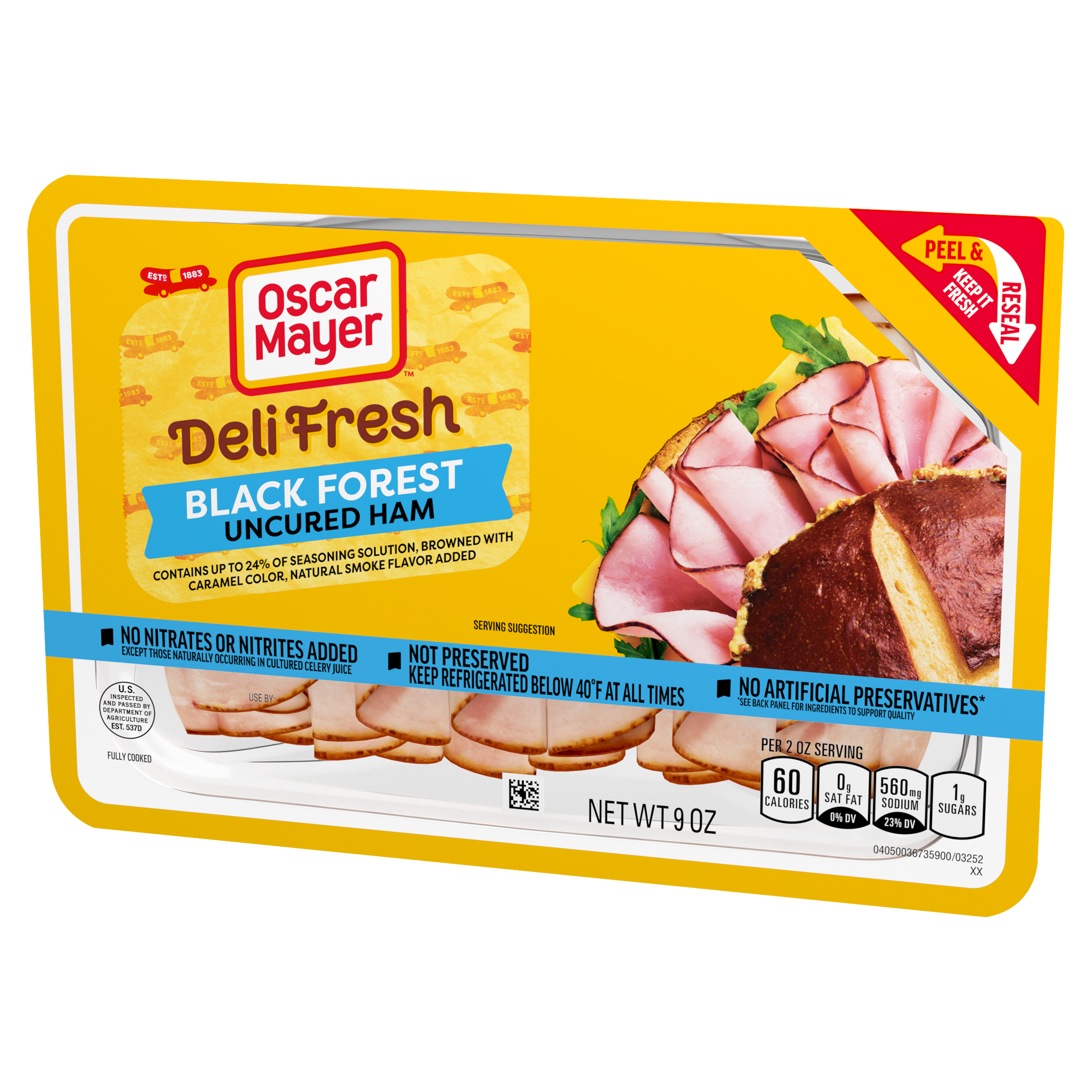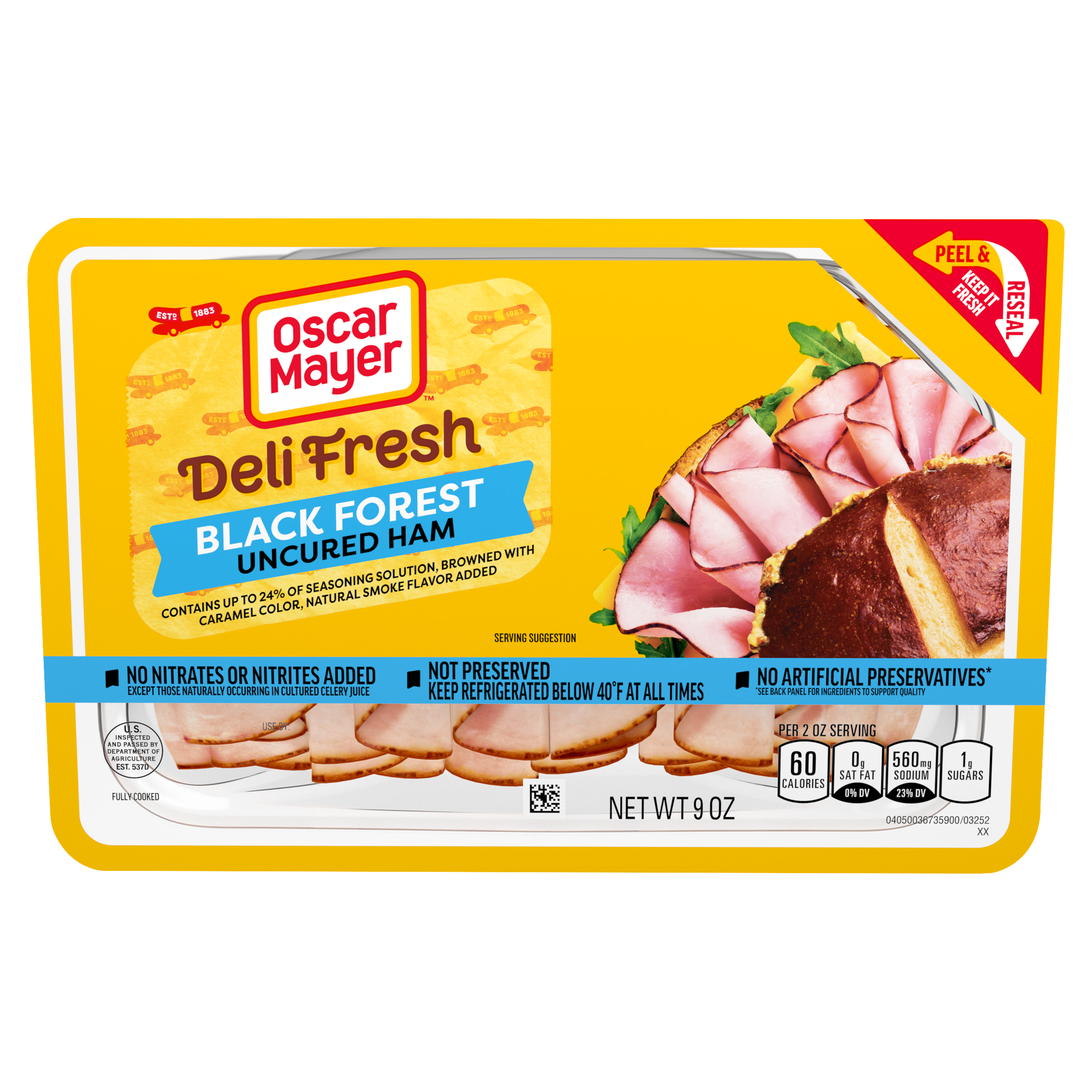 Product Description Skip the deli line and enjoy the sliced ham you know, love and trust. Oscar Mayer Deli Fresh Black Forest Uncured Ham delivers the flavorful slices you crave, fully cooked and ready to enjoy. Made with no artificial preservatives and no nitrites or nitrates added, each serving of Black Forest ham slices contains 9 grams of protein. Our Peel and Reseal feature ensures maximum freshness, thanks to our fully resealable lid that keeps every slice as delicious as the first. Whether you're stacking a sandwich, adding protein to your salad, crafting a charcuterie board or snacking straight from the fridge, you can count on the resealable packaging to lock in freshness after every use. Each 9-ounce pack of sliced ham contains 4.5 servings. Keep it Oscar and enjoy deli-style ham at home.