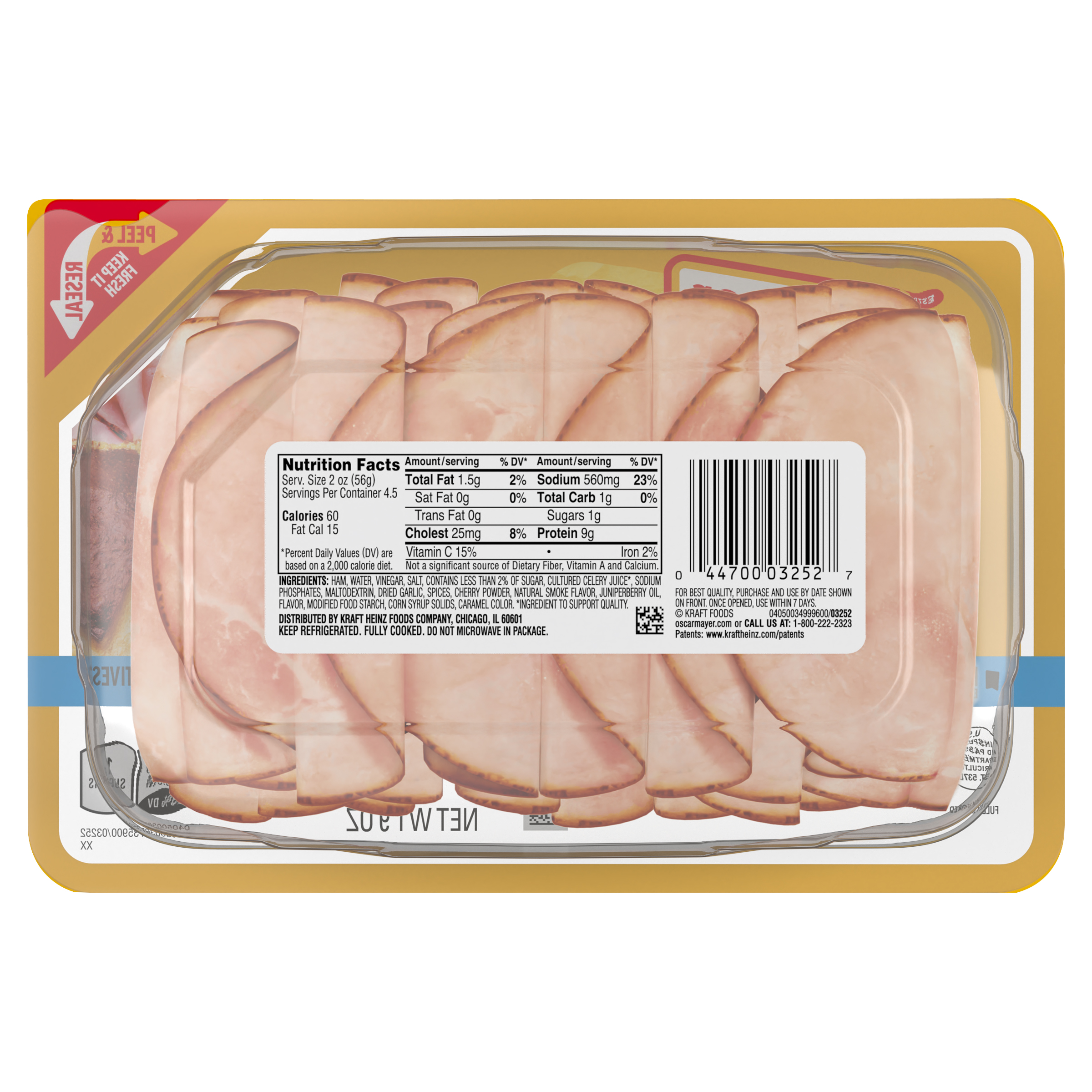GTIN 00044700032527 Kraft Item Code (SKU) 00447000325270 Product Status Active Pack Level EACH Brand Name Oscar Mayer Sub Brand DELI FRESH Business Unit Meat Cheese Coffee & Snacks Catalog Platform Meats Product Category Cold Cuts Consumer Unit Size 9 Consumer Unit Size UOM OZ Packaging Type (Computed) Pack Packaging Type Code TRAY Packaging Type Code Override (Manual) TRAY Sub Units Per Item 1 Variant Black Forest Global Product Classification Mixed Species Meat/Poultry - Prepared/Processed Global Product Classification Code 10005778 Computed Exports - Ingredients HAM, WATER, VINEGAR, SALT, CONTAINS LESS THAN 2% OF SUGAR, CULTURED CELERY JUICE*, SODIUM PHOSPHATES, MALTODEXTRIN, DRIED GARLIC, SPICES, CHERRY POWDER, NATURAL SMOKE FLAVOR, JUNIPERBERRY OIL, FLAVOR, MODIFIED FOOD STARCH, CORN SYRUP SOLIDS, CARAMEL COLOR. *INGREDIENT TO SUPPORT QUALITY. Parent Reference 00044700096536 Quality Statement For Best Quality, Purchase And Use By Date Shown | Once Opened, Use Within 7 Days Storage Instructions Not Preserved - Keep Refrigerated Below 40 Degrees F At All Times Customer Guarantee 30 Temperature Classification Refrigerated (Meat - USDA) 1 to 4 °C / 35 to 40 °F Temperature Classification Code 02 Net Weight 0.562 Gross Weight 0.603 Weight UOM LB Height (in) 5.256 Length/Depth (in) 1.632 Width (in) 7.854 Case Cube 0.039 Parent Relation CASE_00044700096536 Parent Kraft Item Code (SKU) 00447000965300 Product Title Oscar Mayer Deli Fresh Black Forest Uncured Ham, 9 oz Pack eCommerce Product Name (Generic Name) Deli Fresh Black Forest Uncured Ham Product Benefits (Includes Seasonal + Formatting) - 9 OZ PACK: One 9 oz pack of Oscar Mayer Deli Fresh Black Forest Uncured Ham
