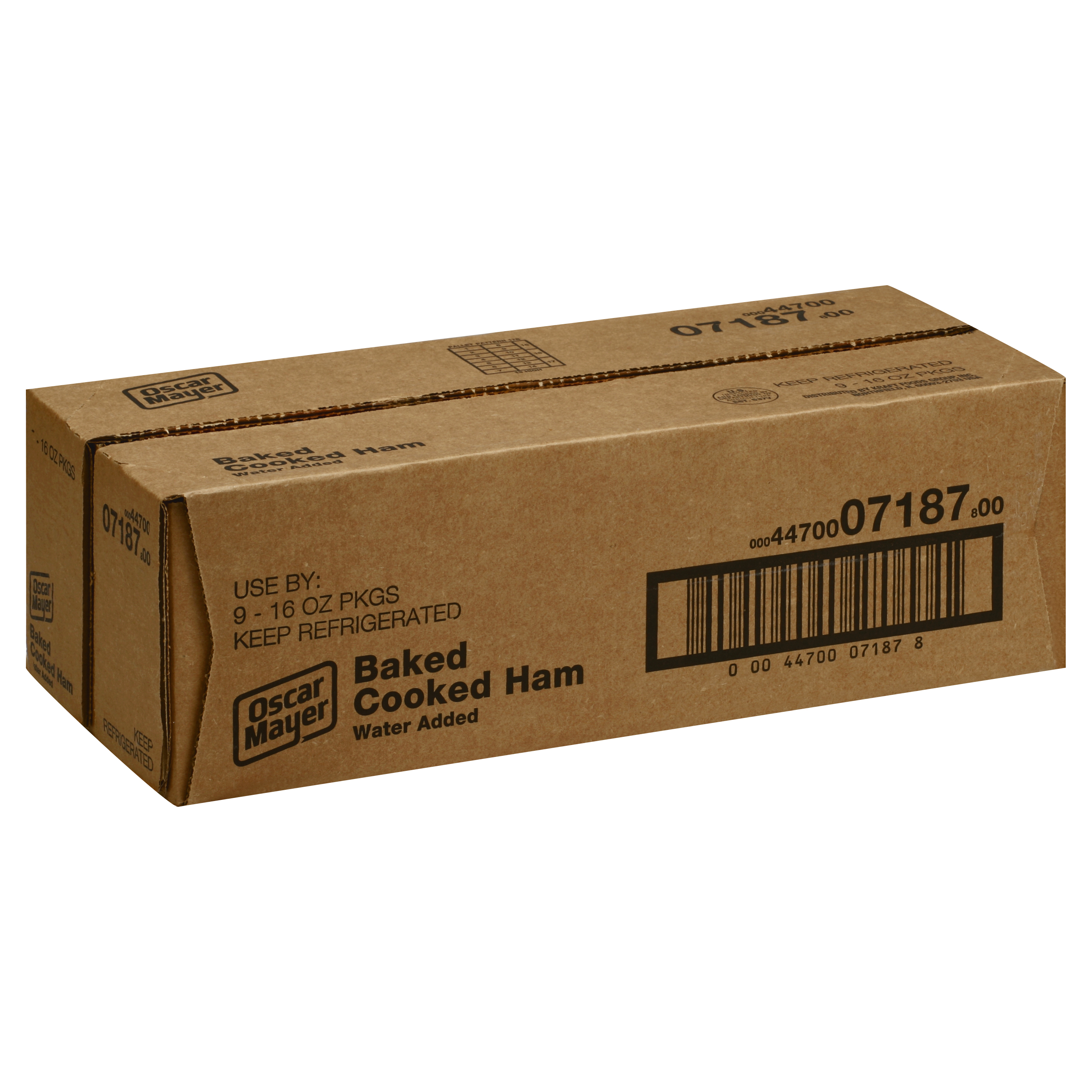GTIN 00044700071878 Kraft Item Code (SKU) 00447000718700 Product Status Active Pack Level CASE Brand Name Oscar Mayer Business Unit Meat Cheese Coffee & Snacks Catalog Platform Meats Product Category Cold Cuts Consumer Unit Size 16 Consumer Unit Size UOM OZ Packaging Type (Computed) Box Packaging Type Code BOX/CARTON Sub Units Per Item 9 Global Product Classification Mixed Species Meat/Poultry - Prepared/Processed Global Product Classification Code 10005781 Computed Exports - Ingredients HAM, WATER, DEXTROSE, CONTAINS LESS THAN 2% OF SALT, SODIUM PHOSPHATES, CARRAGEENAN, SODIUM PROPIONATE, SODIUM DIACETATE, SODIUM BENZOATE, SODIUM ASCORBATE, SODIUM NITRITE, FLAVOR, CORN SYRUP. Parent Reference 20044700071872 Child Reference 00044700010006 Customer Guarantee 30 Temperature Classification Refrigerated (Meat - USDA) 1 to 4 °C / 35 to 40 °F Temperature Classification Code 02 Net Weight 9 Gross Weight 9.943 Weight UOM LB Height (in) 5.563 Length/Depth (in) 15.5 Width (in) 6.75 Case Cube 0.337 Child Relation EACH_00044700010006 Parent Relation PALLET_20044700071872 Cases per Tier 17 Tiers per Pallet 13 Cases per Pallet 221 Pallet Stack Limit 1 Product Title Oscar Mayer 16 oz Ham Baked 9 Box/Carton Case Product Description Give your sandwiches the tasty treatment with Oscar Mayer Cold Cuts.