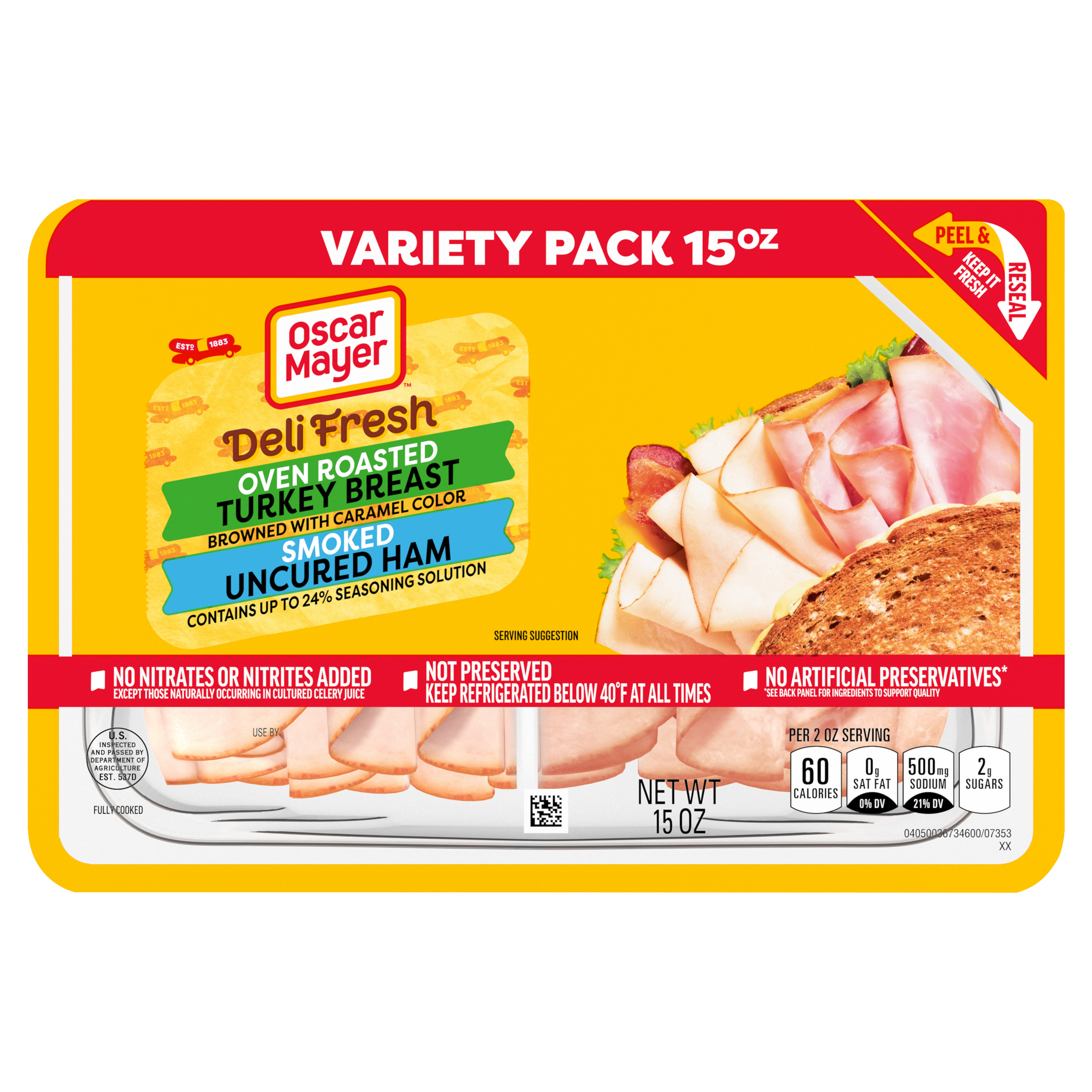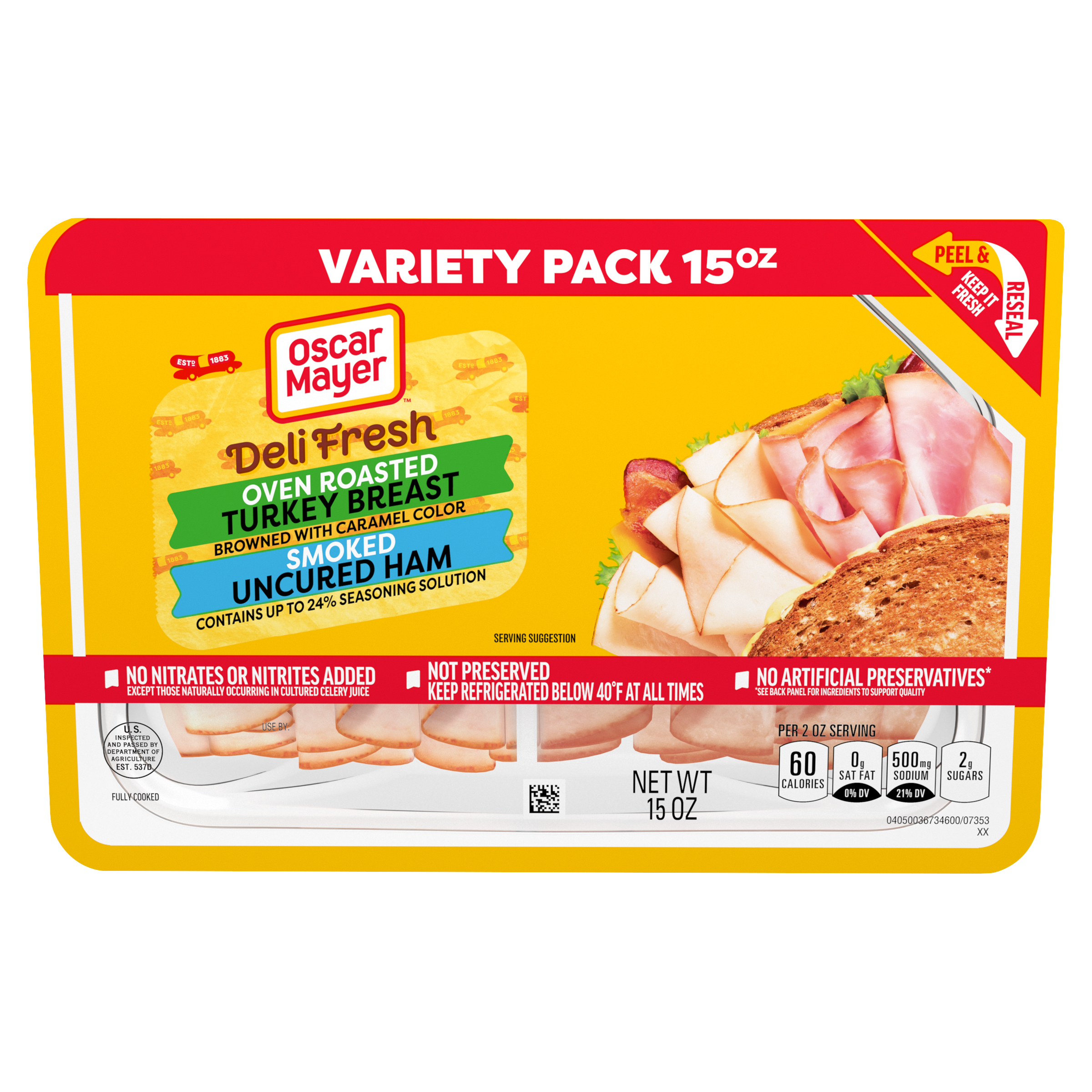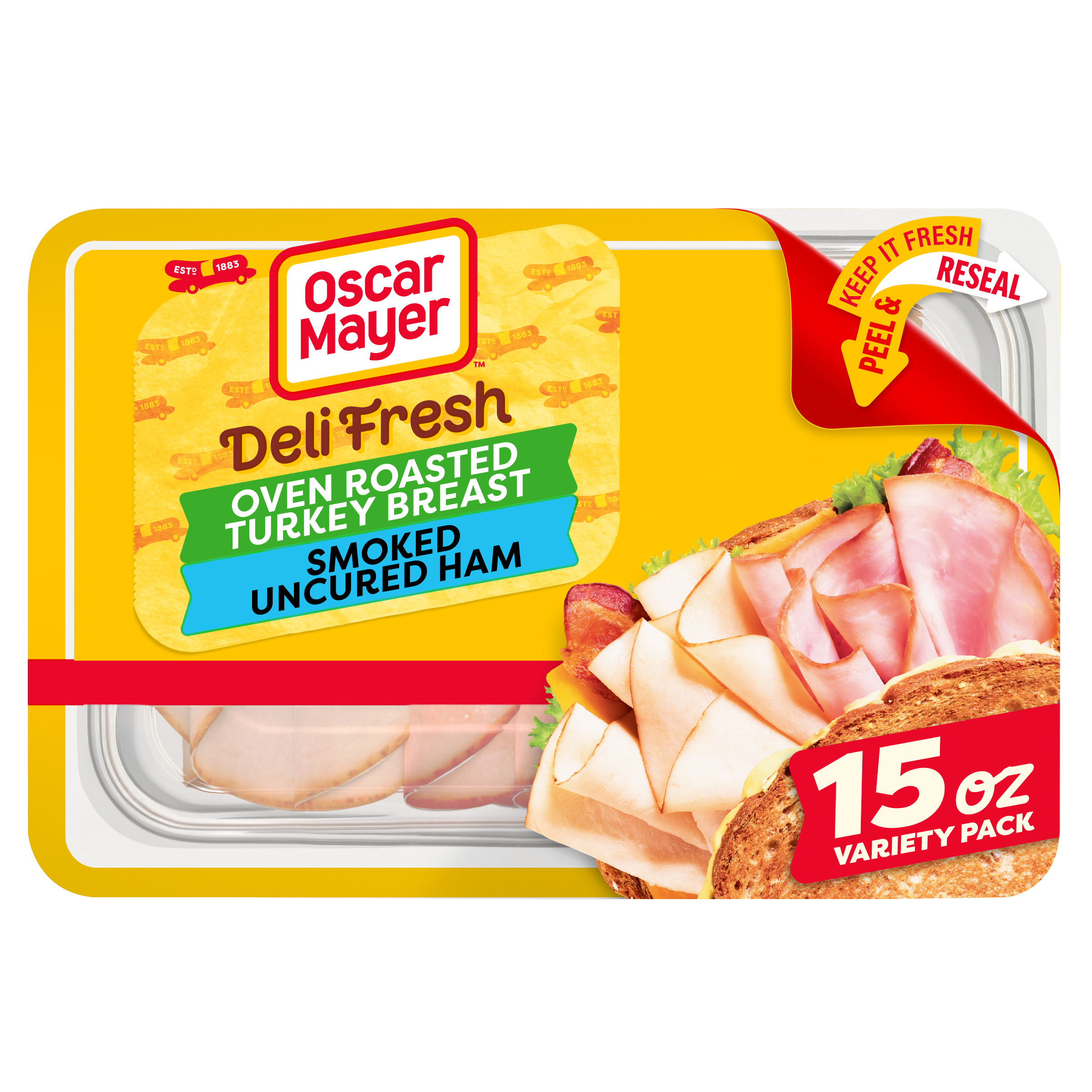 Product Description Skip the deli line and enjoy the sliced meats you know, love and trust. Oscar Mayer Deli Fresh Oven Roasted Turkey Breast and Smoked Uncured Ham delivers the flavorful slices you crave, fully cooked and ready to enjoy. Made with no artificial preservatives and no nitrites or nitrates added, each serving of oven roasted turkey slices and ham slices contains 9 grams of protein. Our Peel and Reseal feature ensures maximum freshness, thanks to our fully resealable lid that keeps every slice as delicious as the first. Whether you're stacking a sandwich, adding protein to your salad, crafting a charcuterie board or snacking straight from the fridge, you can count on the resealable packaging to lock in freshness after every use. Each 15-ounce pack of sliced turkey breast and ham contains about 8 servings. Keep it Oscar and enjoy deli-style meats at home.