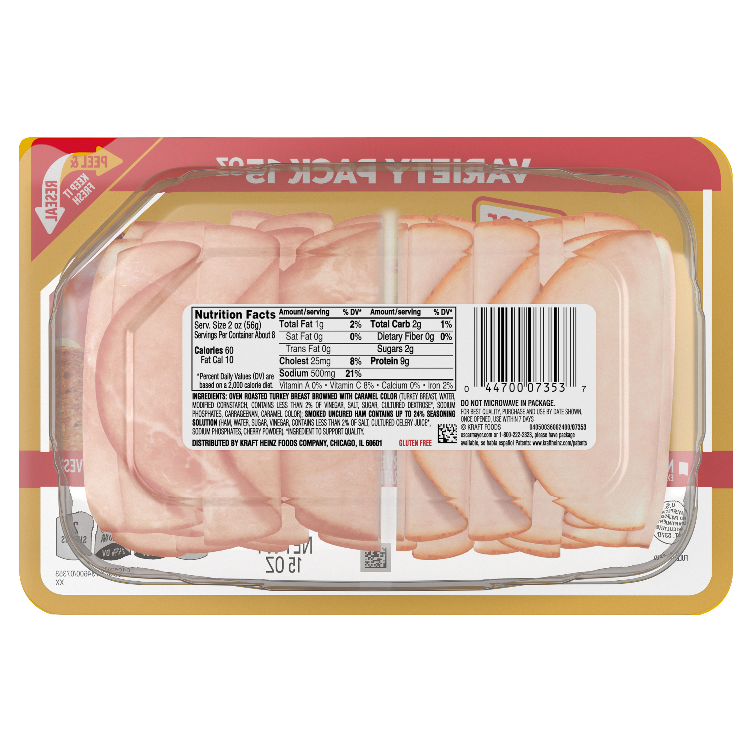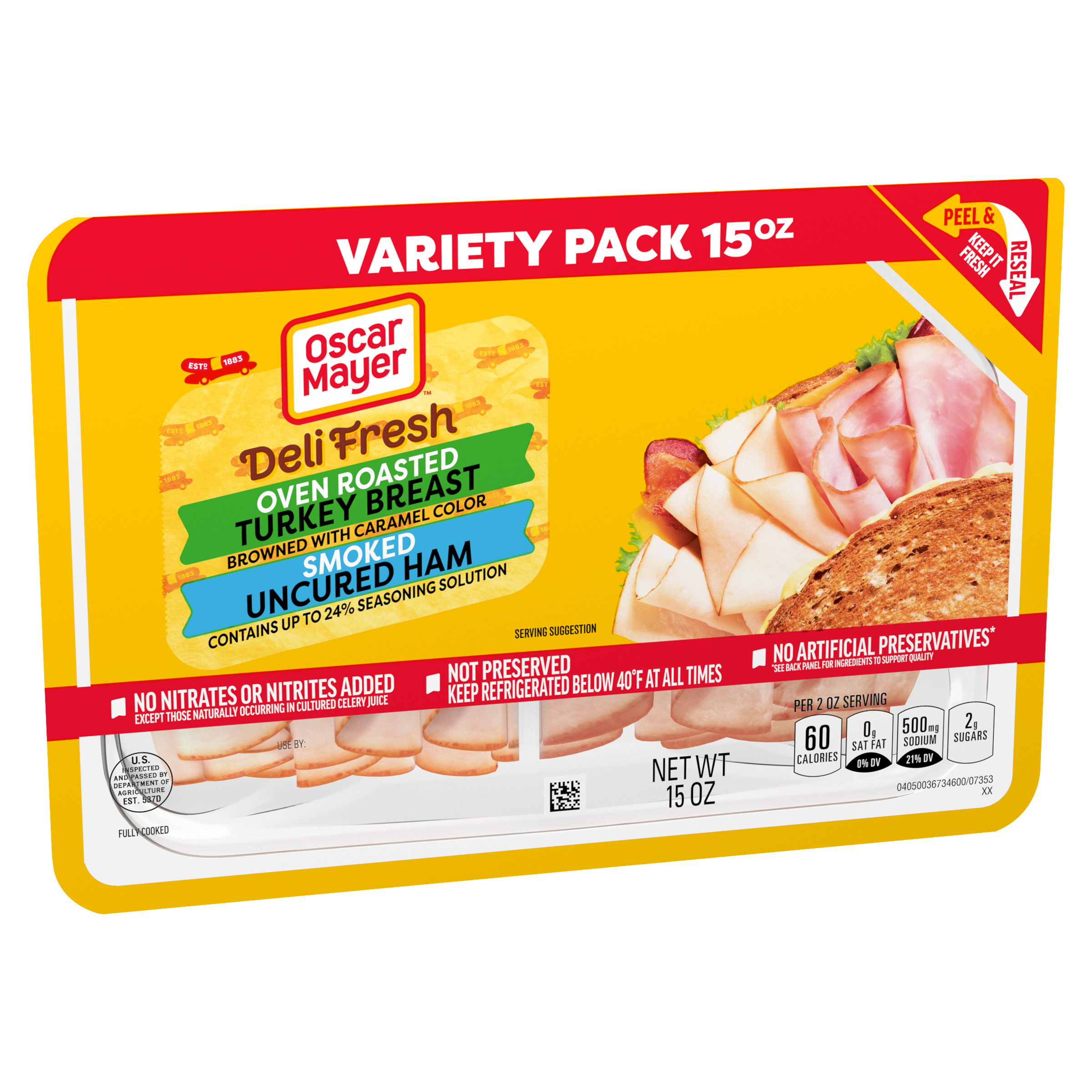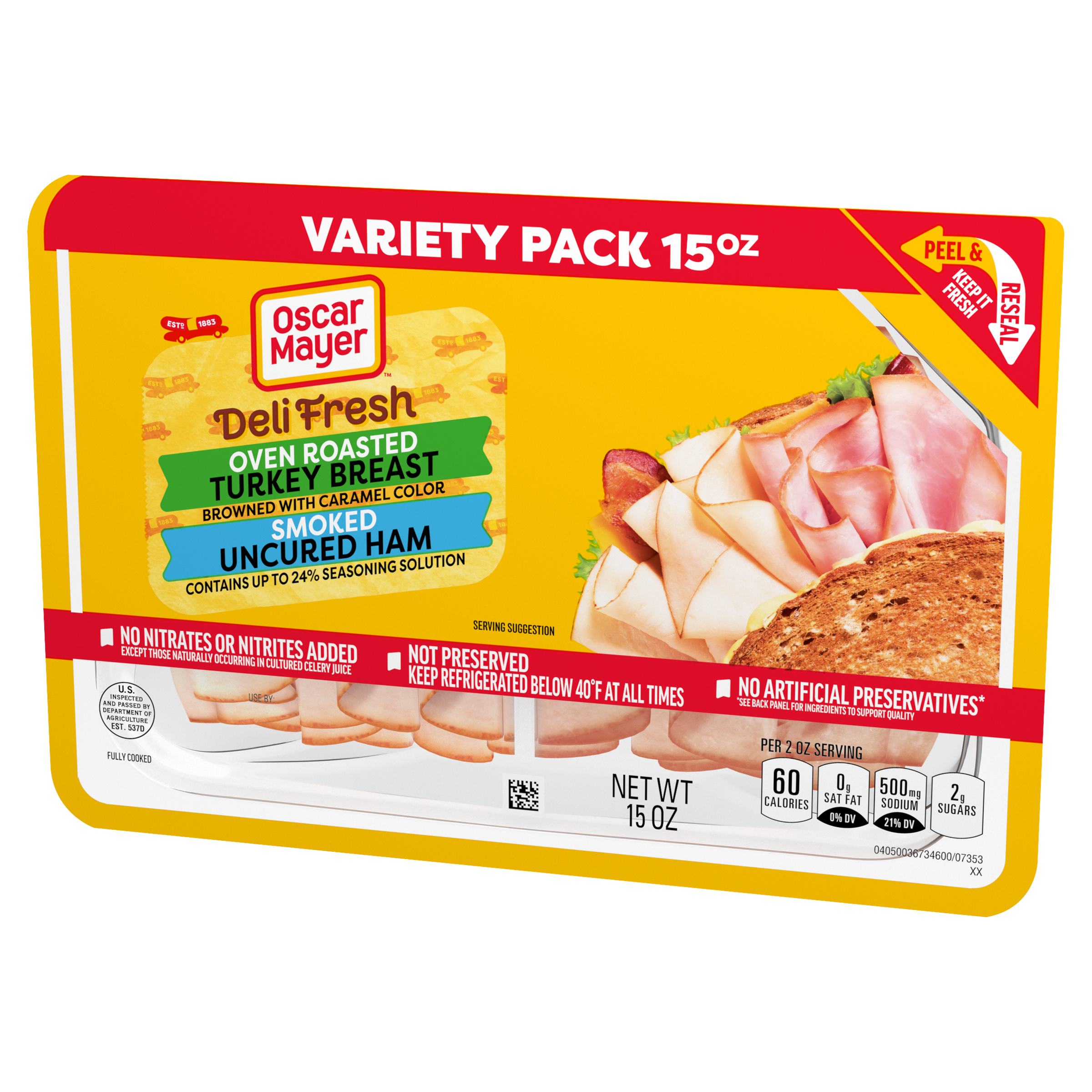 Product Description Skip the deli line and enjoy the sliced meats you know, love and trust. Oscar Mayer Deli Fresh Oven Roasted Turkey Breast and Smoked Uncured Ham delivers the flavorful slices you crave, fully cooked and ready to enjoy. Made with no artificial preservatives and no nitrites or nitrates added, each serving of oven roasted turkey slices and ham slices contains 9 grams of protein. Our Peel and Reseal feature ensures maximum freshness, thanks to our fully resealable lid that keeps every slice as delicious as the first. Whether you're stacking a sandwich, adding protein to your salad, crafting a charcuterie board or snacking straight from the fridge, you can count on the resealable packaging to lock in freshness after every use. Each 15-ounce pack of sliced turkey breast and ham contains about 8 servings. Keep it Oscar and enjoy deli-style meats at home.