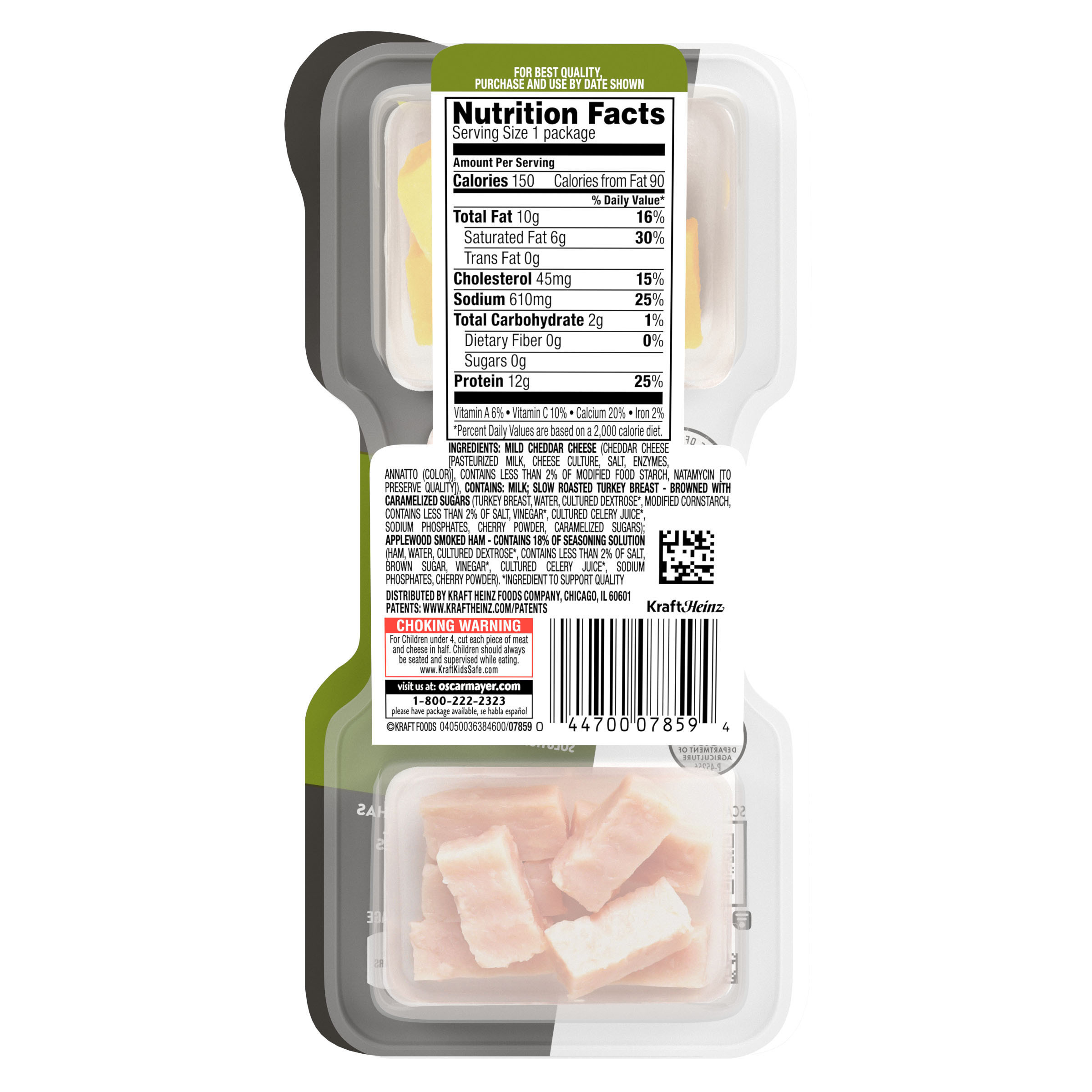 - Snack-size portions of slow roasted turkey breast, applewood smoked ham and mild cheddar cheese