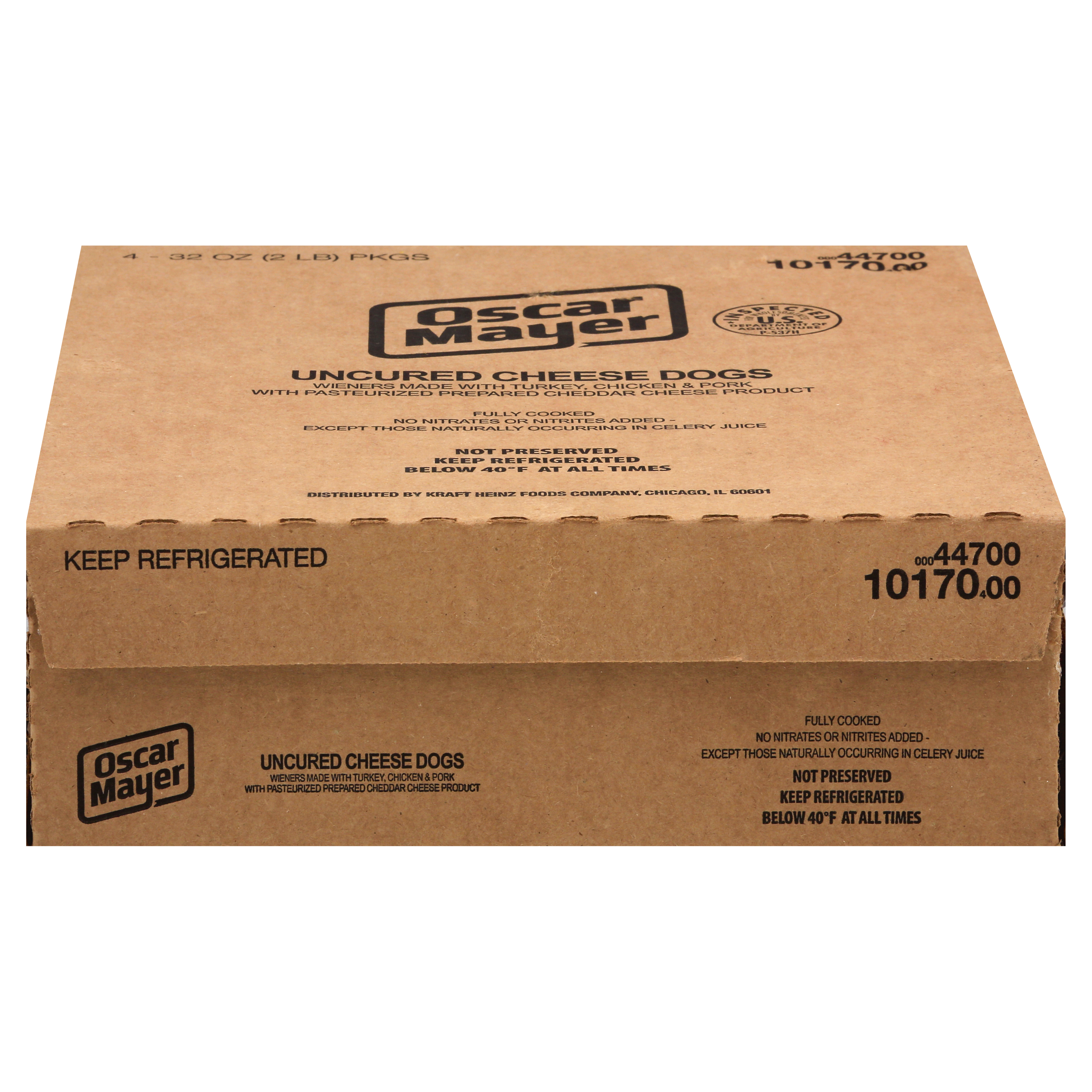 GTIN 00044700101704 Kraft Item Code (SKU) 00447001017000 Product Status Active Pack Level CASE Brand Name Oscar Mayer Business Unit Meat Cheese Coffee & Snacks Catalog Platform Meats Product Category Hot Dogs Consumer Unit Size 32 Consumer Unit Size UOM OZ Packaging Type (Computed) Box Packaging Type Code BOX/CARTON Sub Units Per Item 4 Variant Cheese Global Product Classification Code 10005778 Computed Exports - Ingredients MECHANICALLY SEPARATED CHICKEN, MECHANICALLY SEPARATED TURKEY, PORK, WATER, PASTEURIZED PREPARED CHEDDAR CHEESE PRODUCT (MILK, WATER, MILK PROTEIN CONCENTRATE, MILK FAT, WHEY PROTEIN CONCENTRATE, SODIUM PHOSPHATE, SALT, SODIUM ALGINATE, SORBIC ACID AS A PRESERVATIVE, APOCAROTENAL [COLOR], ENZYMES, CHEESE CULTURE), CORN SYRUP, CONTAINS LESS THAN 2% OF SALT, SODIUM PHOSPHATE, POTASSIUM CHLORIDE, SODIUM DIACETATE, SODIUM BENZOATE, SODIUM ASCORBATE, FLAVOR, SODIUM NITRITE. Parent Reference 20044700101708 Child Reference 00044700087442 Customer Guarantee 40 Temperature Classification Code 02 Net Weight 8 Gross Weight 9.04 Weight UOM LB Height (in) 3.75 Length/Depth (in) 12.188 Width (in) 11.063 Case Cube 0.293 Child Relation EACH_00044700087442 Parent Relation PALLET_20044700101708 Cases per Tier 12 Tiers per Pallet 14 Cases per Pallet 168 Pallet Stack Limit 1