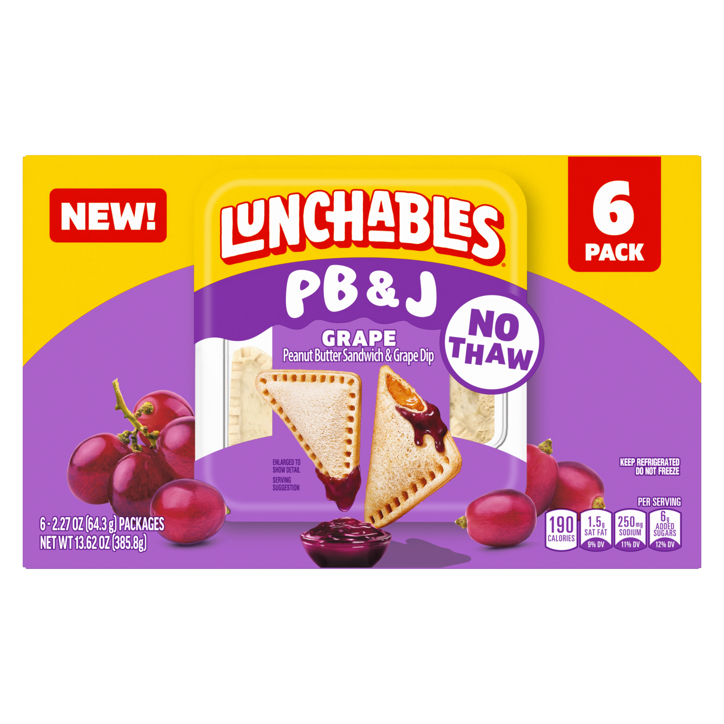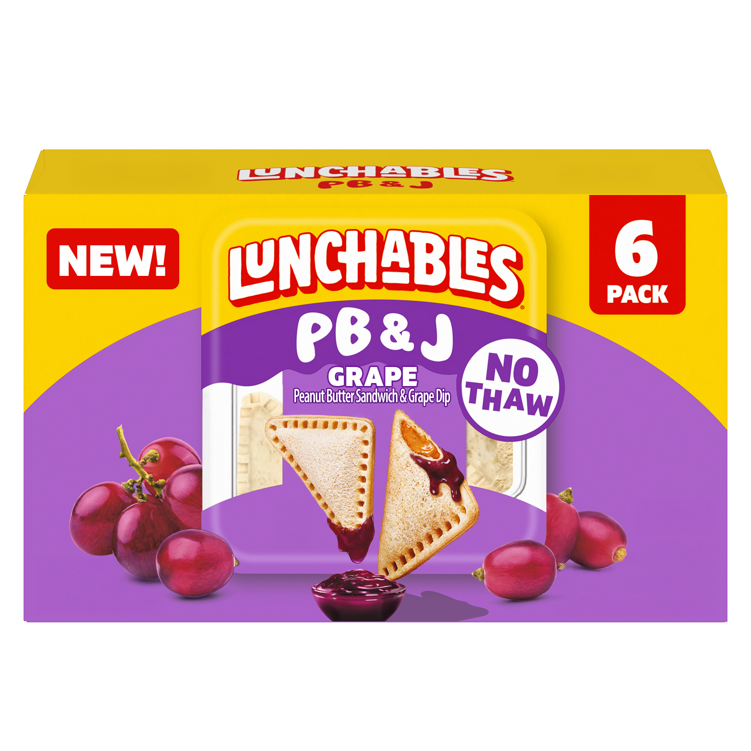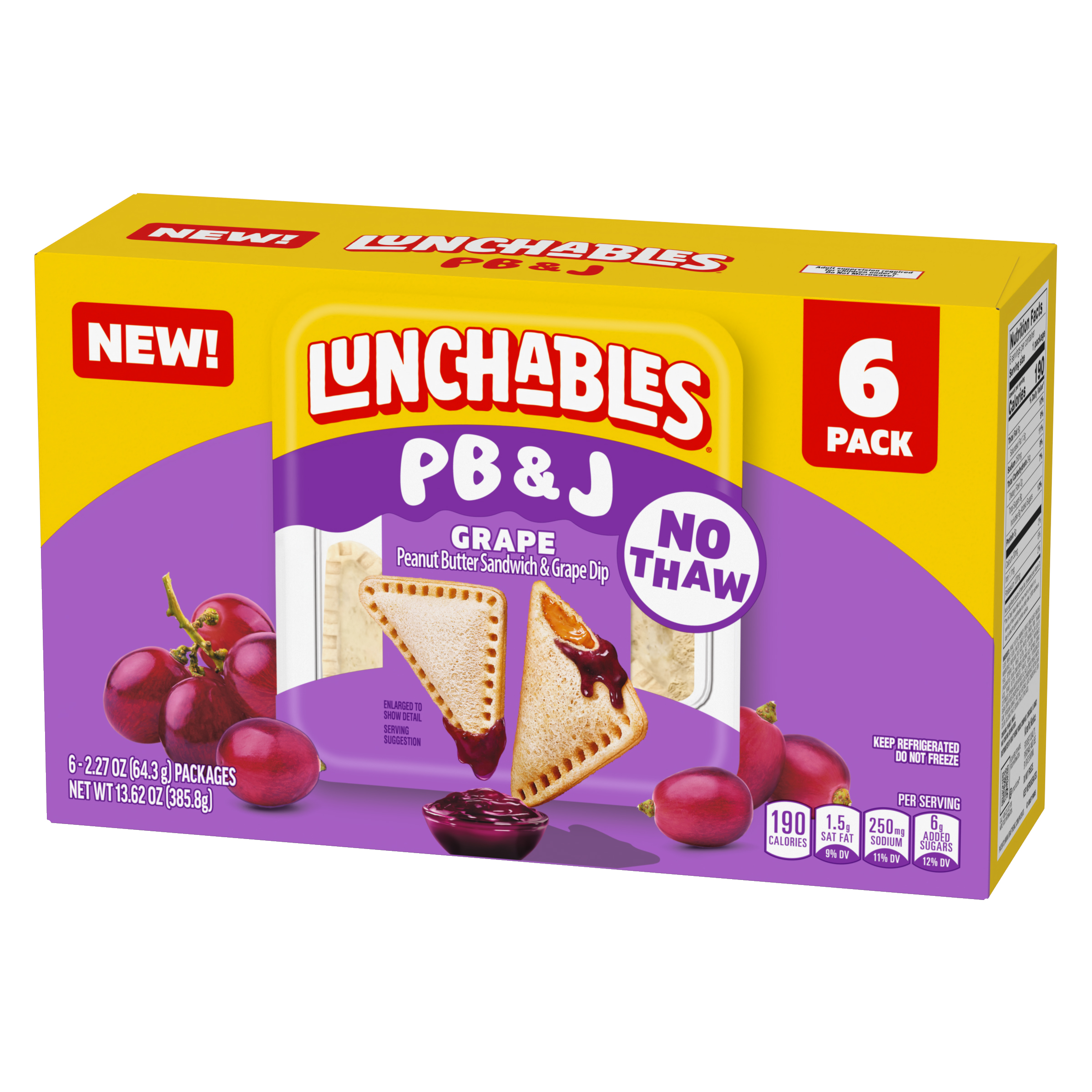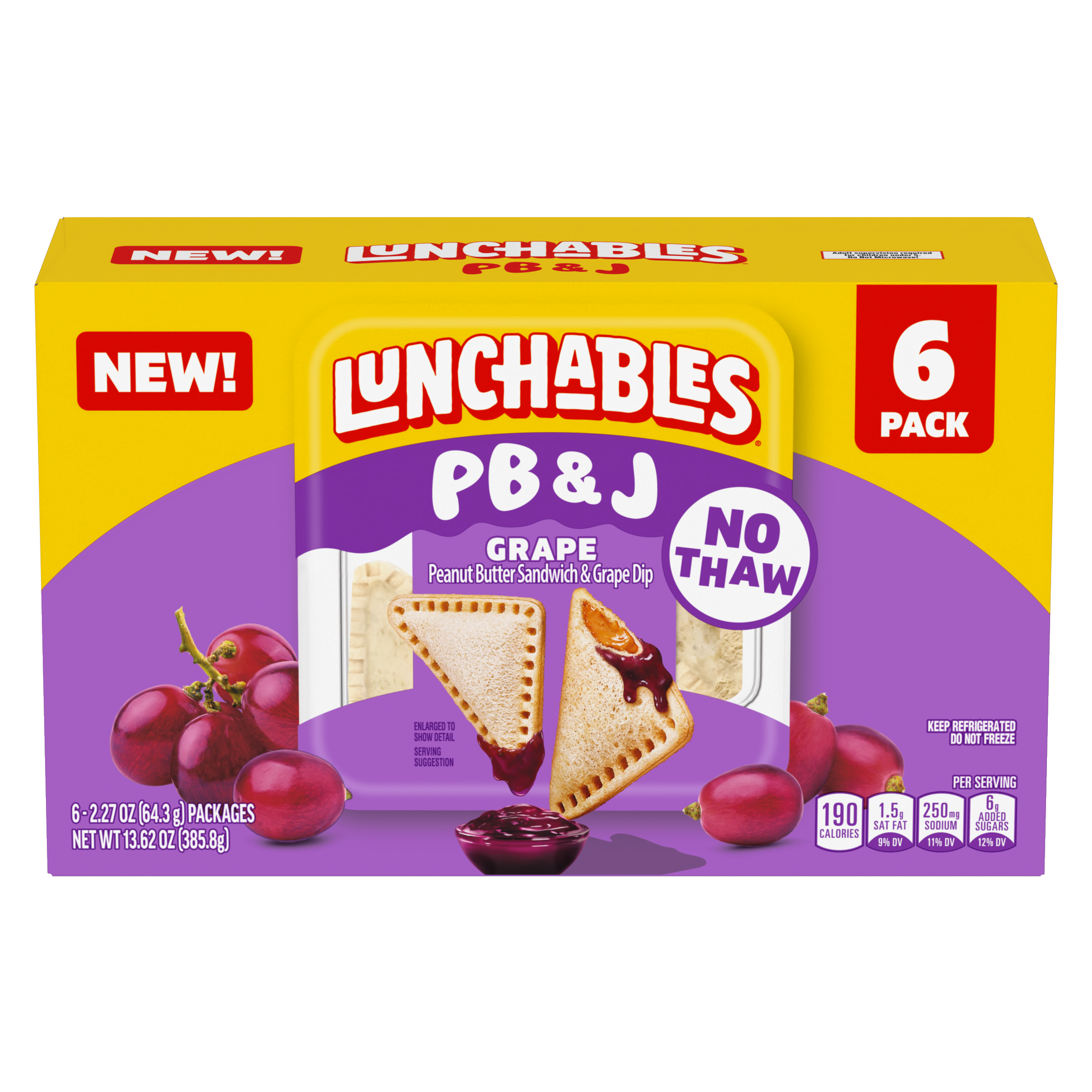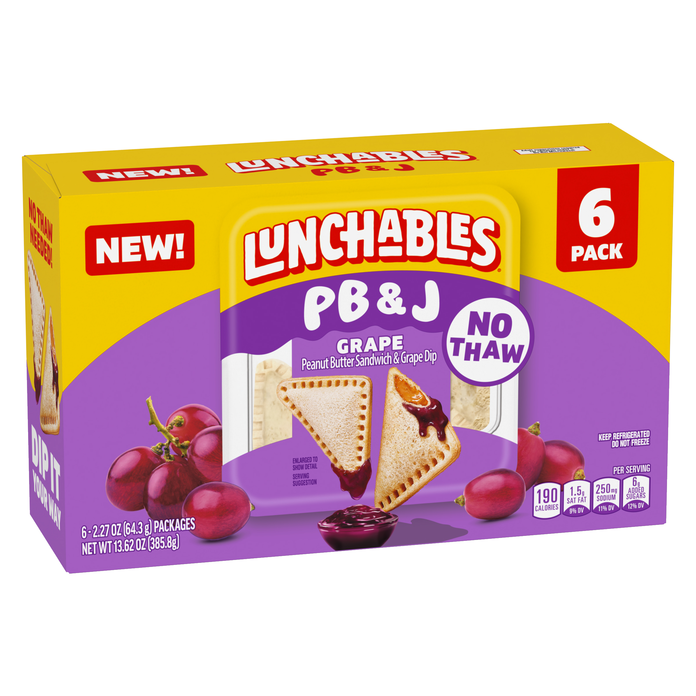 Product Description Kids' #1 favorite sandwich — now from Lunchables! Make lunch time easy with Lunchables PB&J Peanut Butter Sandwich & Grape Dip. No wait needed, our snackable sandwiches are ready to dip and eat right out of the fridge anytime your kids are hungry. Each Lunchables PB&J kit includes two mini crustless peanut butter sandwiches and grape dip. Pair it with fruit, veggies and milk, and you've got a lunchbox win that's tasty and fun. With creamy peanut butter and a sweet grape dip your kids will love, Lunchables PB&J allows kids to dip their sandwiches exactly the way they want. Each lunch kit comes in a single-serve convenient package that offers portable eating. Ready when they are, Lunchables PB&J is a great snack or part of a lunch for kids to enjoy at home or on the go. Make busy days easier with a 6 pack of our grab-and-go lunch kits. Always remember to keep your Lunchables PB&J refrigerated until you are ready to enjoy.