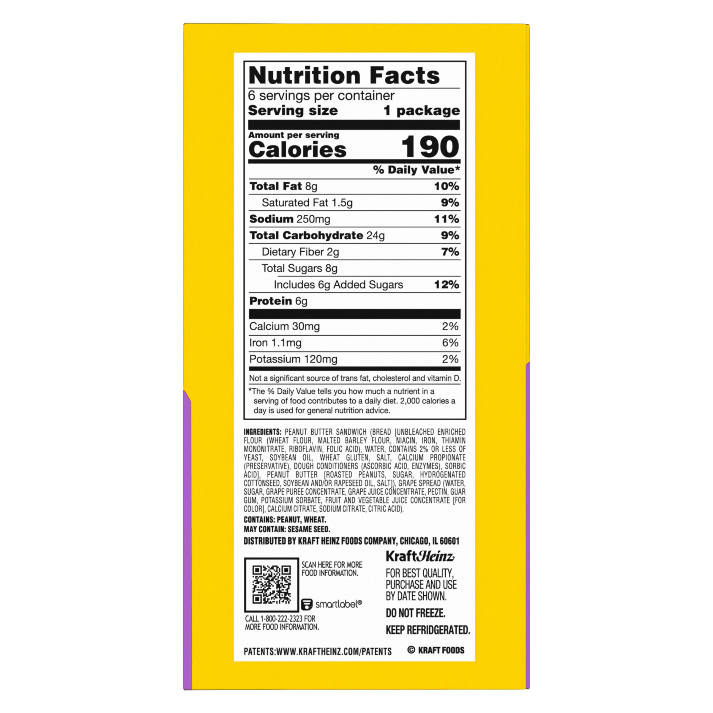 GTIN 00044700105375 Kraft Item Code (SKU) 00447001053770 Product Status Active Pack Level EACH Brand Name Lunchables Business Unit Meat Cheese Coffee & Snacks Catalog Platform Snacking Product Category Lunchables Consumer Unit Size 13.62 Consumer Unit Size UOM OZ Packaging Type (Computed) Box Packaging Type Code BOX/CARTON Packaging Type Code Override (Manual) BOX/CARTON Sub Units Per Item 1 Variant Grape Global Product Classification Code 10006754 Computed Exports - Ingredients PEANUT BUTTER SANDWICH (BREAD [UNBLEACHED ENRICHED FLOUR (WHEAT FLOUR, MALTED BARLEY FLOUR, NIACIN, IRON, THIAMIN MONONITRATE, RIBOFLAVIN, FOLIC ACID), WATER, CONTAINS 2% OR LESS OF YEAST, SOYBEAN OIL, WHEAT GLUTEN, SALT, CALCIUM PROPIONATE (PRESERVATIVE), DOUGH CONDITIONERS (ASCORBIC ACID, ENZYMES), SORBIC ACID], PEANUT BUTTER [ROASTED PEANUTS, SUGAR, HYDROGENATED COTTONSEED, SOYBEAN AND/OR RAPESEED OIL, SALT]), GRAPE SPREAD (WATER, SUGAR, GRAPE PUREE CONCENTRATE, GRAPE JUICE CONCENTRATE, PECTIN, GUAR GUM, POTASSIUM SORBATE, FRUIT AND VEGETABLE JUICE CONCENTRATE [FOR COLOR], CALCIUM CITRATE, SODIUM CITRATE, CITRIC ACID). Parent Reference 10044700105372 Quality Statement For Best Quality, Purchase And Use By Date Shown Storage Instructions Do Not Freeze, Keep Refrigerated. Customer Guarantee 30 Temperature Classification Code 04 Net Weight 0.851 Gross Weight 1.316 Weight UOM LB Height (in) 6.938 Length/Depth (in) 11.188 Width (in) 3.625 Case Cube 0.163 Parent Relation CASE_10044700105372 Parent Kraft Item Code (SKU) 00447001053700 Product Title Lunchables PB&J Peanut Butter Sandwich & Grape Dip, 6 ct Pack, 2.27 oz Trays eCommerce Product Name (Generic Name) PB&J Peanut Butter Sandwich & Grape Dip Product Benefits (Includes Seasonal + Formatting) - Six 2.27 oz packs with two mini crustless Lunchables PB&J Peanut Butter Sandwiches & Grape Dip